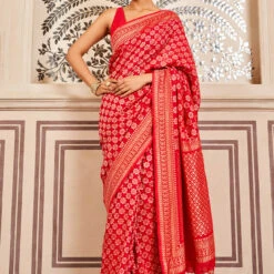 Set in red is a high-octane showstopper. Zardozi embroidery, set with sequins on sustainable fibres make it a bold choice.