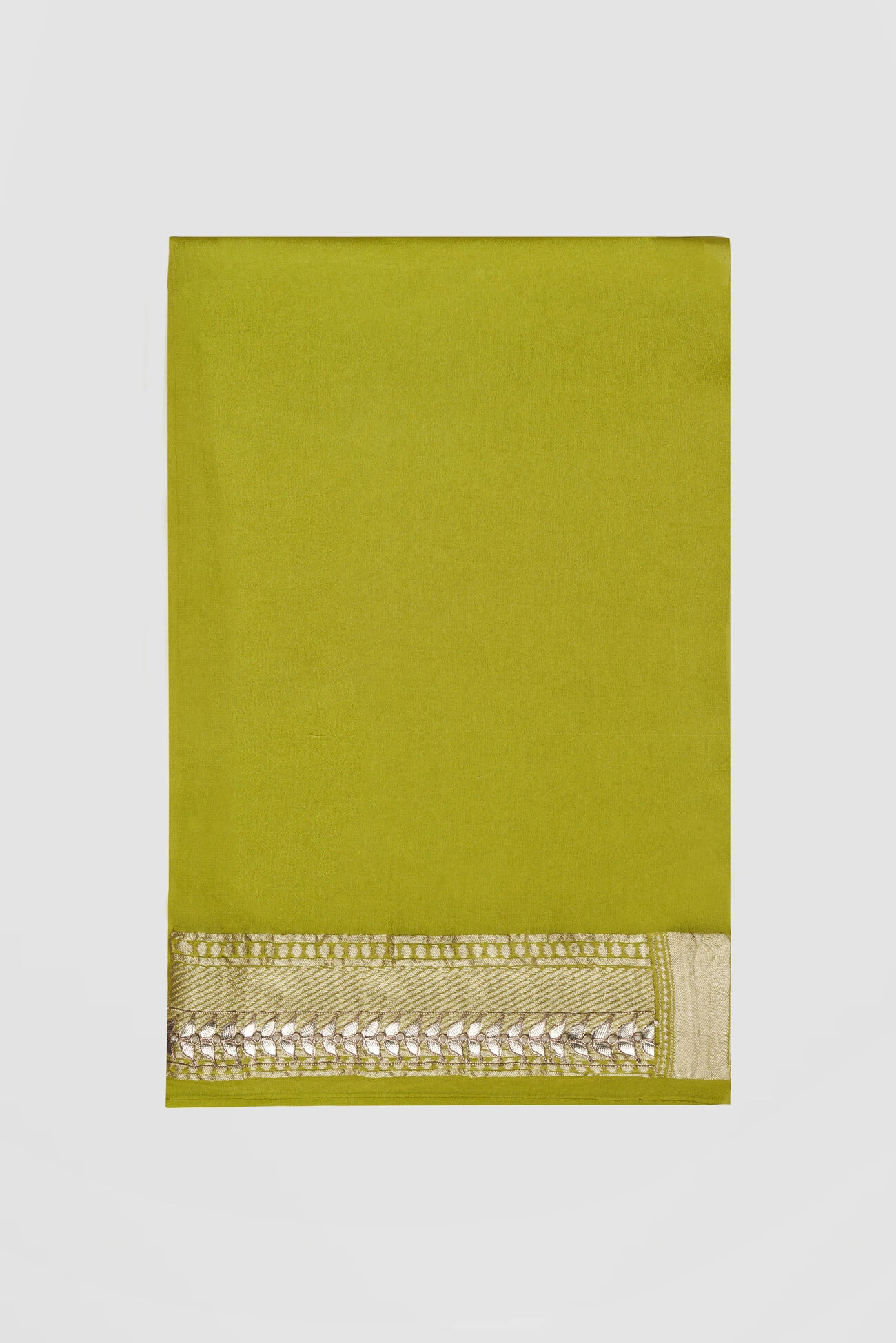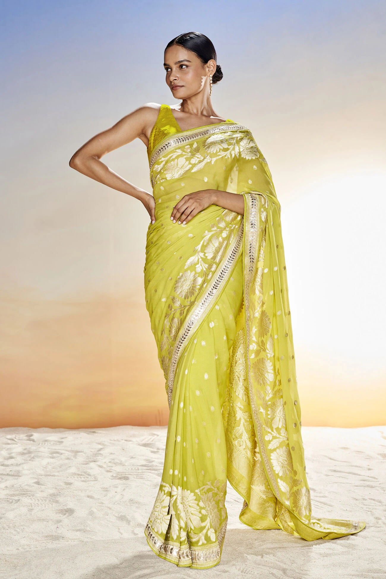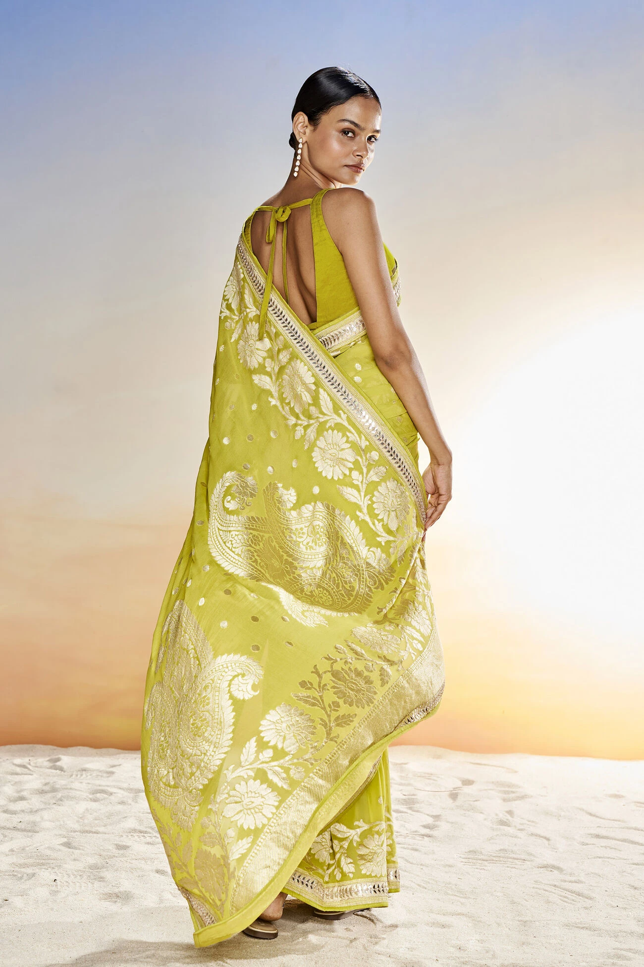 Abhinaya is a gorgeous lime saree that is handwoven in Benaras by master artisans. Perfect for glamorous soirees where you want to make a statement.