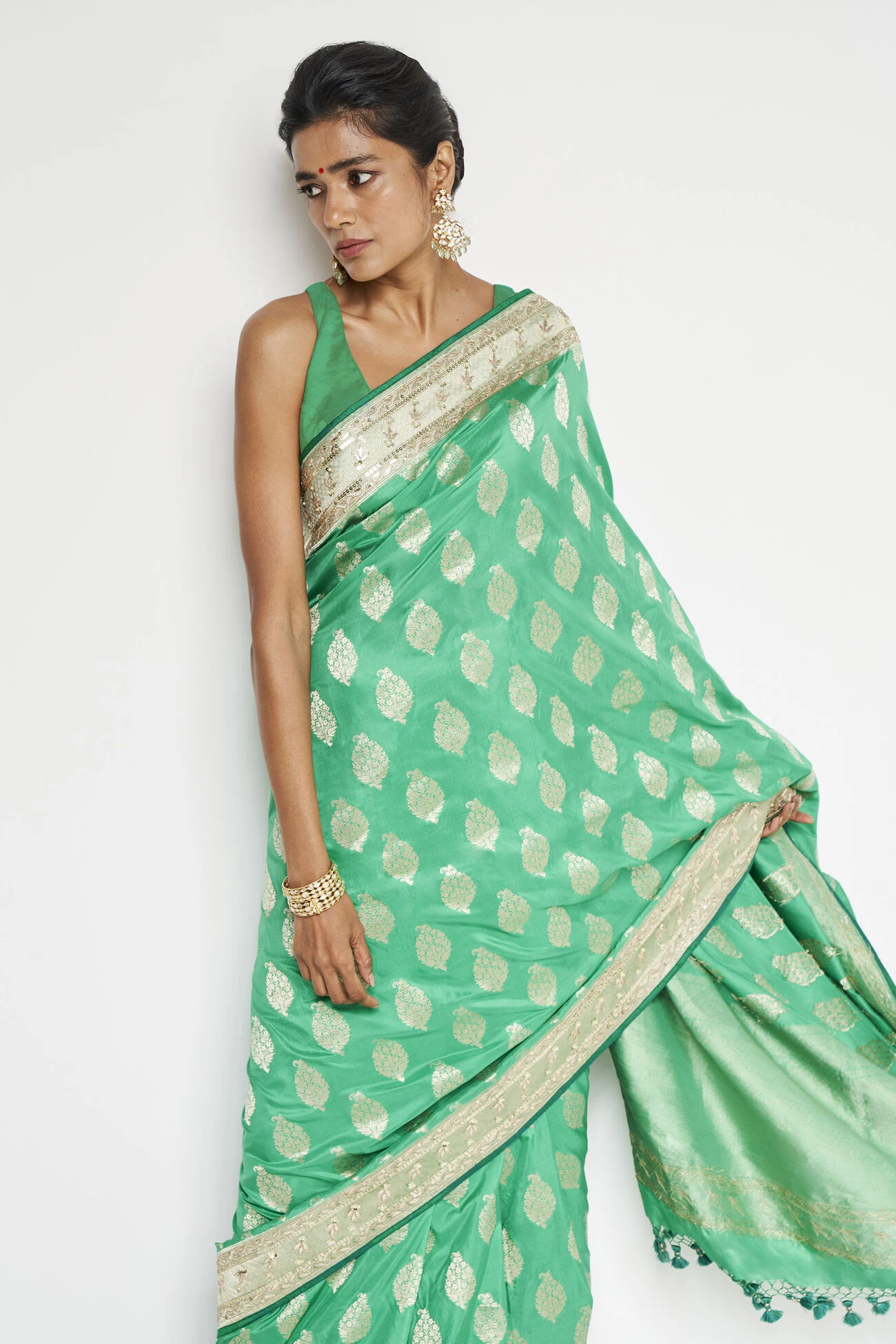 Handwoven in Benaras, our Adaj saree fits sunny ceremonies perfectly. Drama of the silken green is enhanced by gota patti and sequins embroidery.