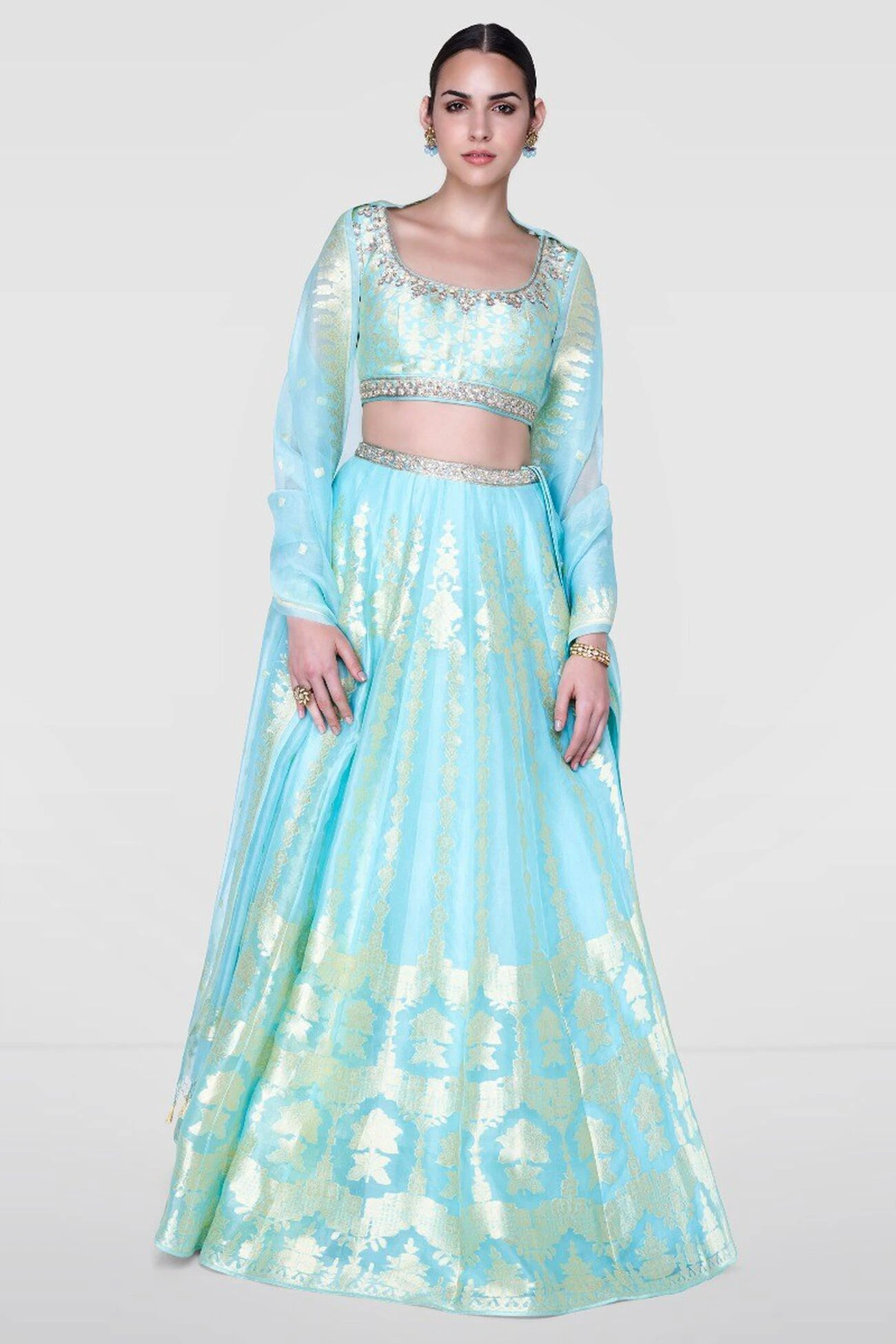 An airy, pastel lehenga that calls to mind princesses from times of yore. Its metallic gold thread work dazzles, while the complementing choli and dupatta add to its soft glamour.