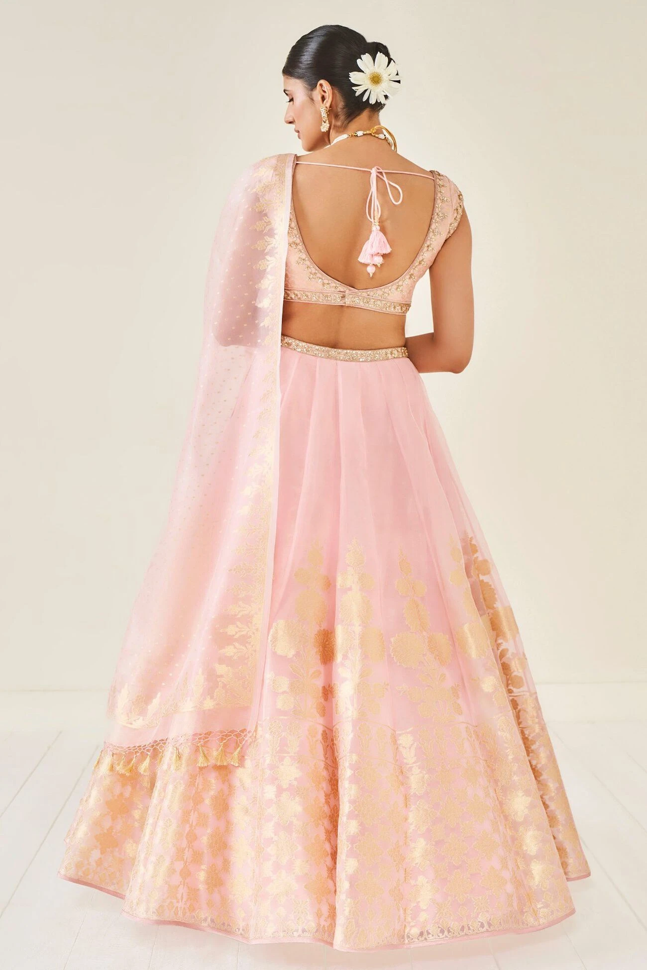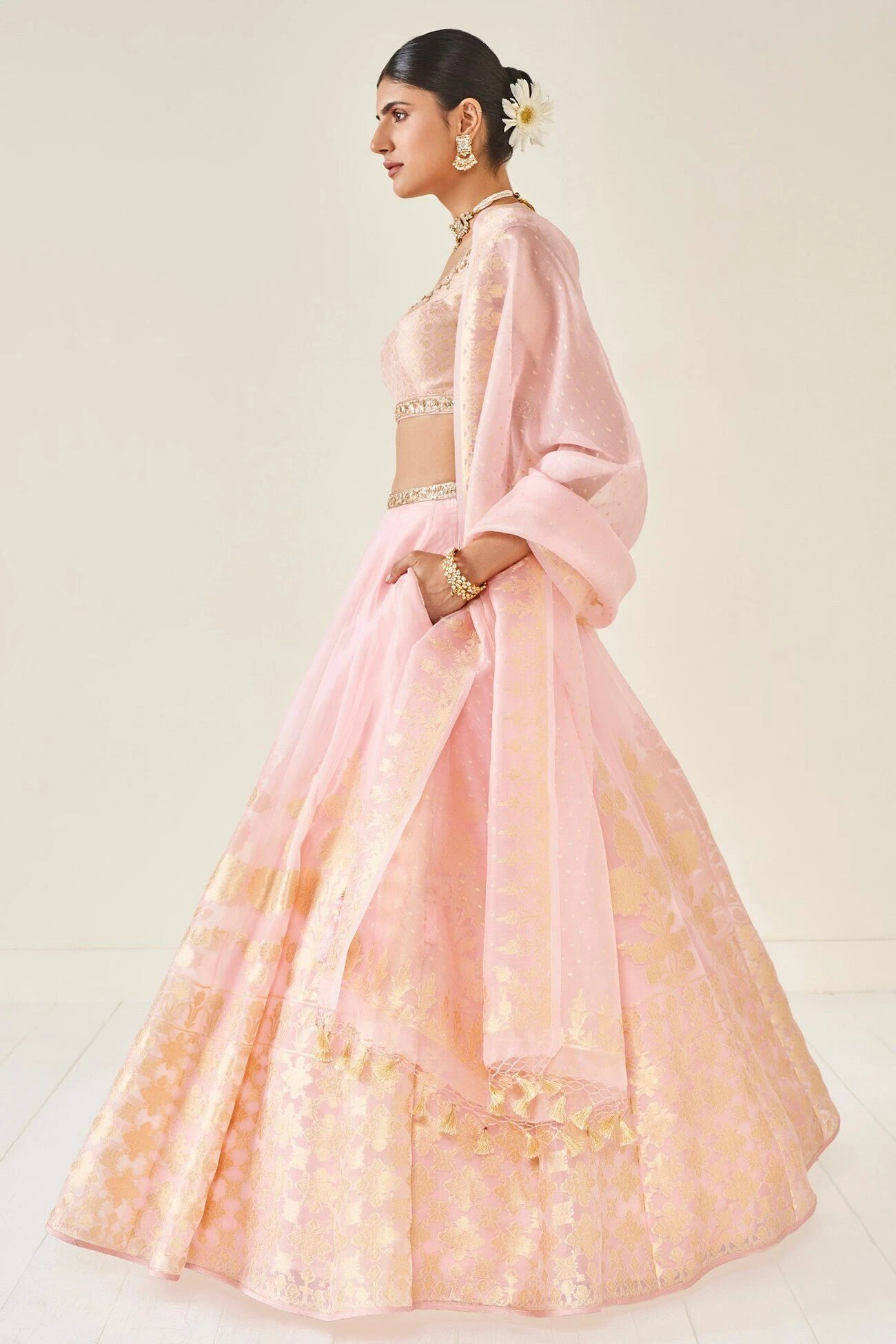 Handwoven by master craftsmen in Benaras, the brocade detailing of this subtle lehenga catches the light. A matching choli and a dupatta completes the look. And the lehenga comes with pockets.This style allows no customization.