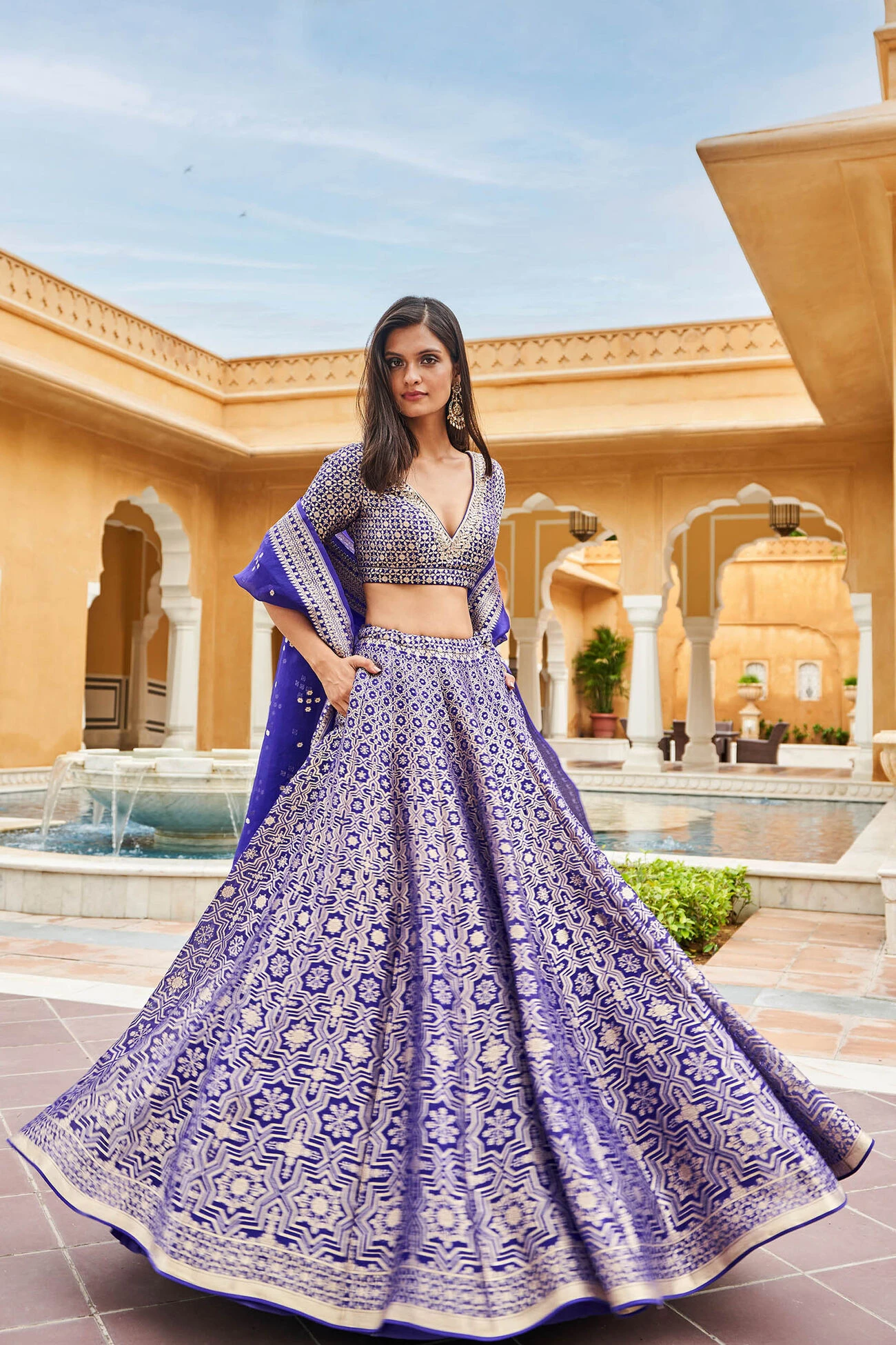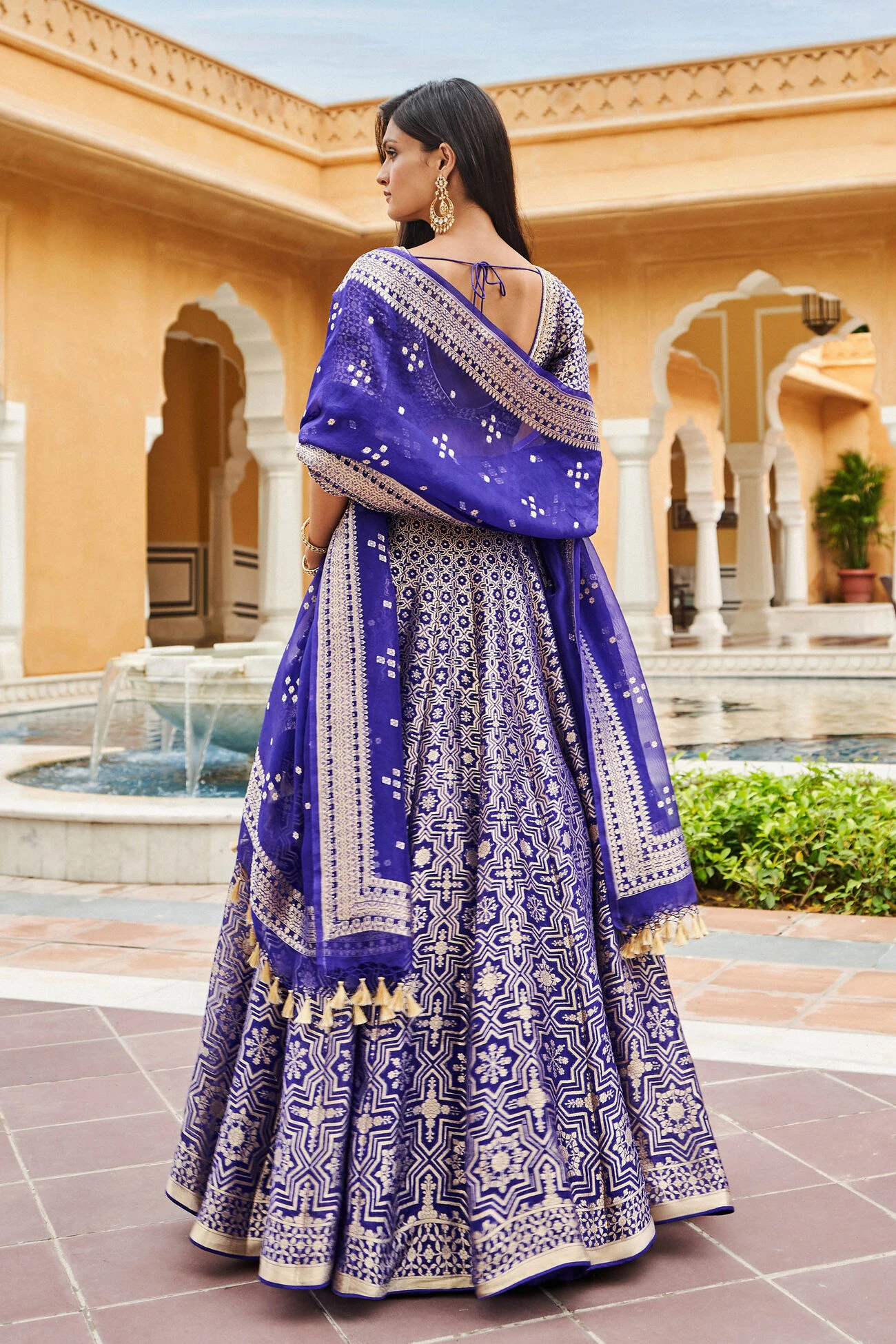 Inspired by architectural motifs from Sindh, the Aniq Lehenga Set handwoven in Benaras is brought to life on blush organza.