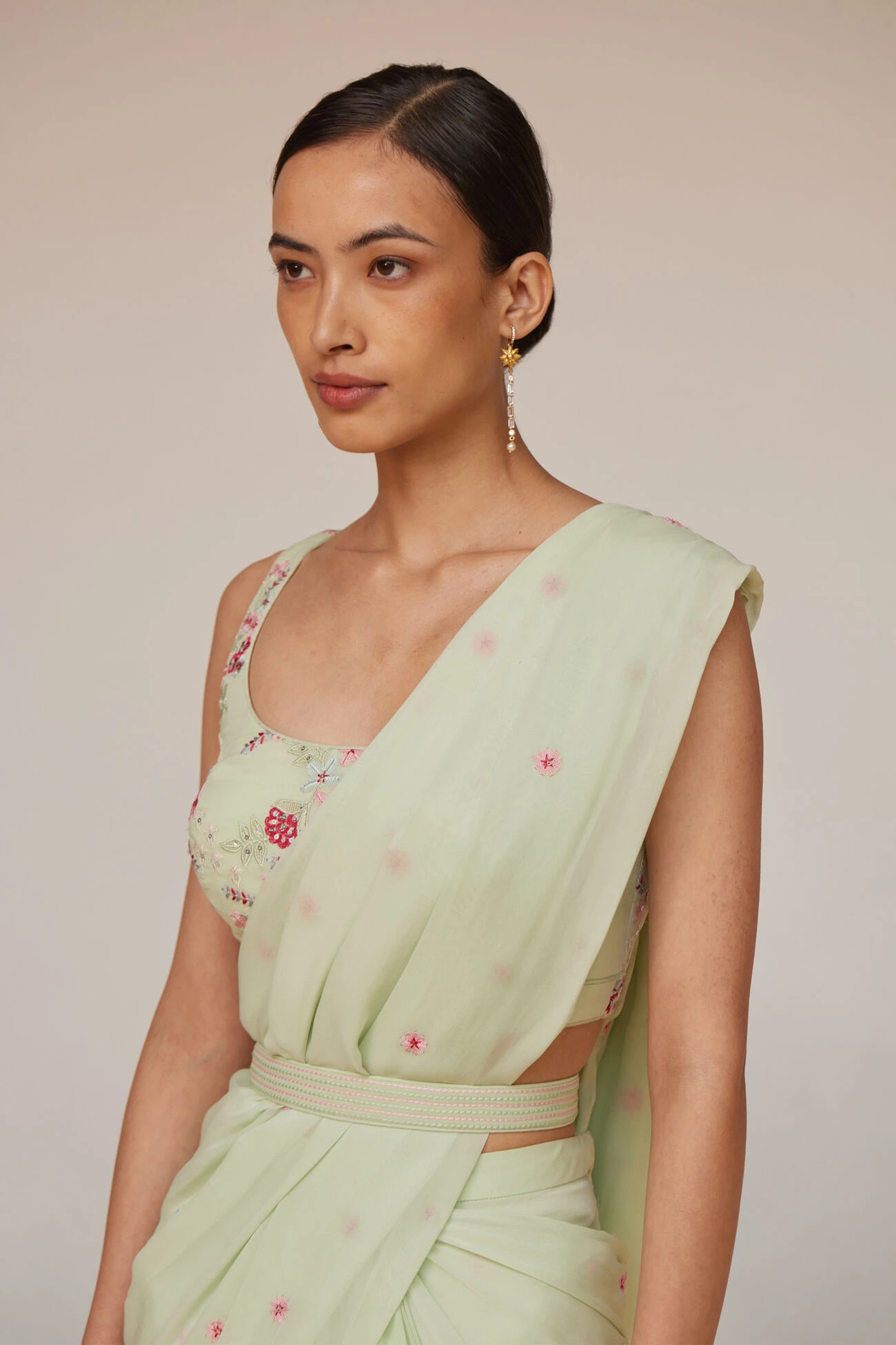 This exquisite, ready-to-wear saree is crafted with utmost finesse from a light-as-air fabric. Its soothing shade of pink is evocative of opulent grandeur, lending an effortless allure to any celebratory event.