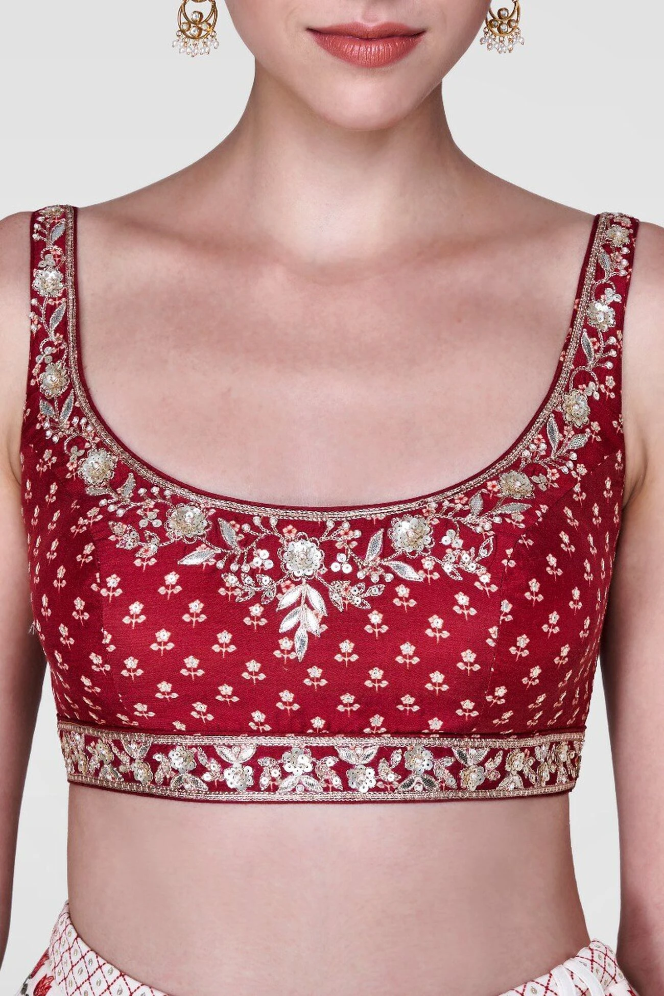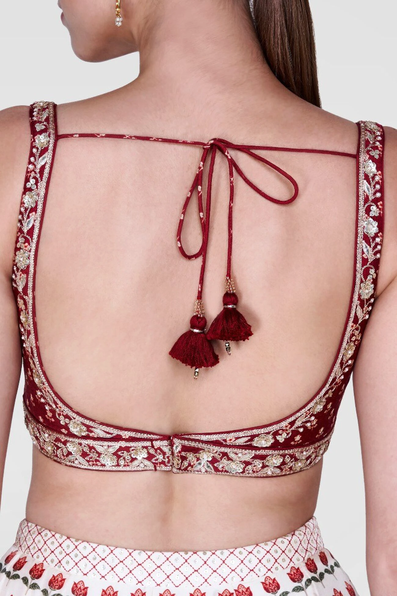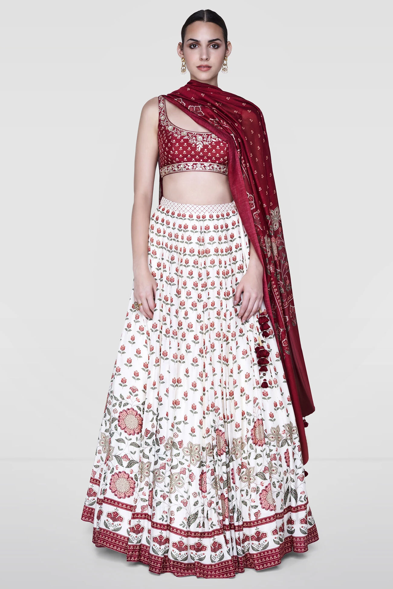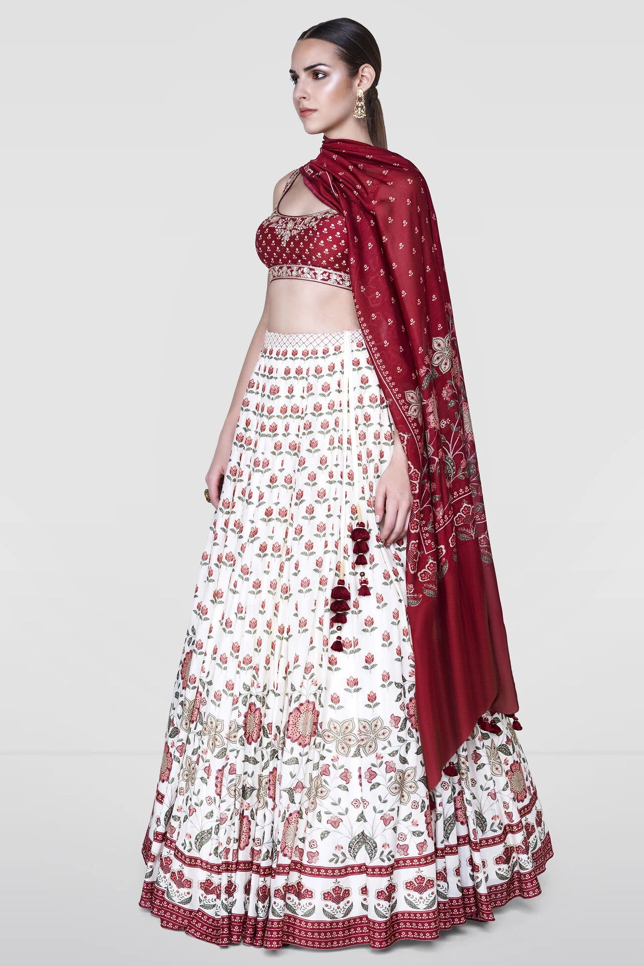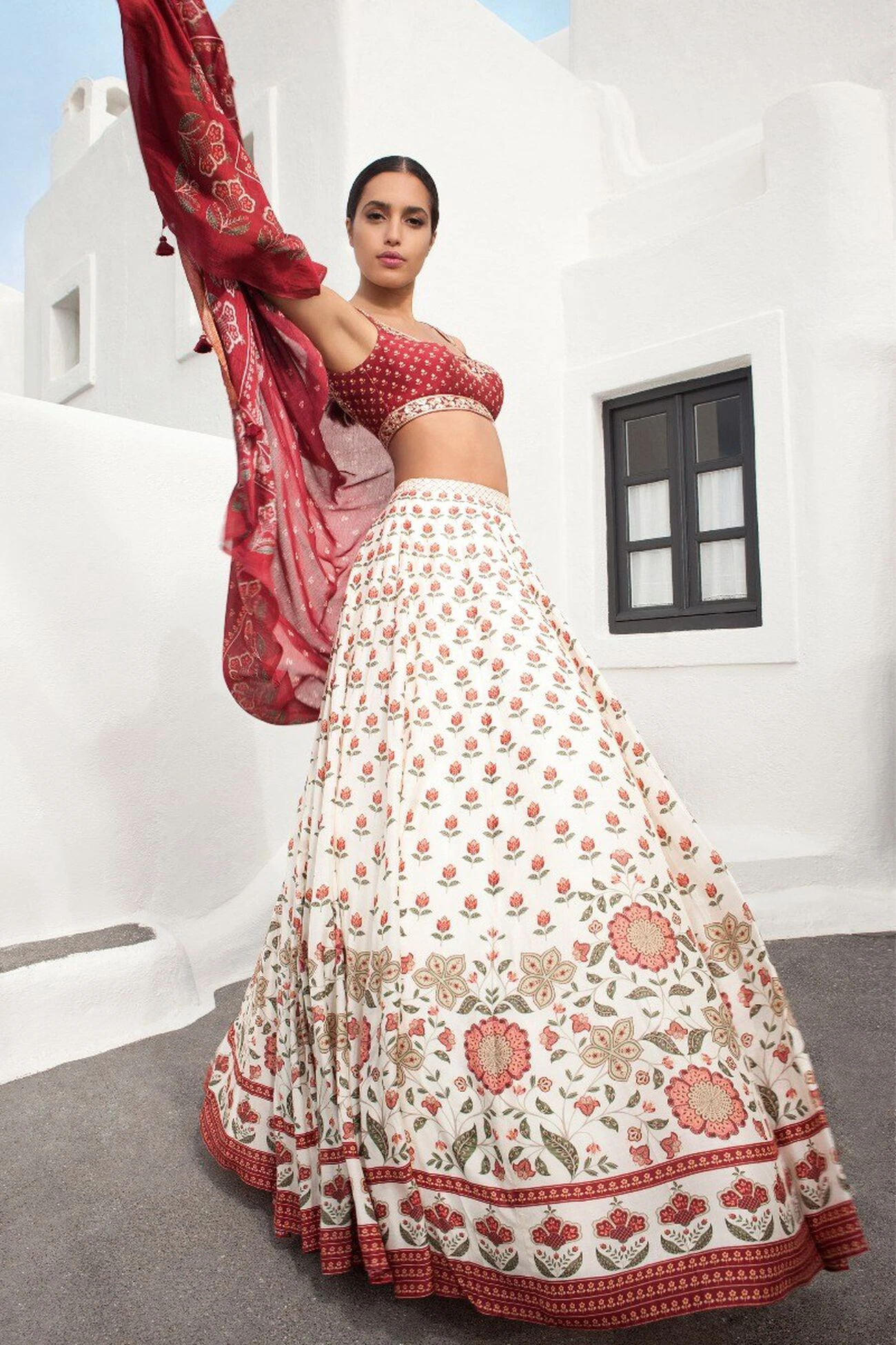 Made for a breezy day in the sun, this white silk lenenga covered in red blooms is a spring staple. A deep red choli and a dupatta complete the look. This style allows no customisation. However, we can add cap sleeves.