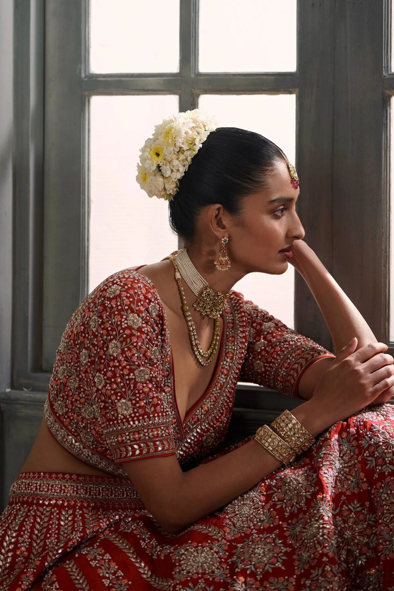 With ornate depictions of a royal garden in full bloom, this red silk lehenga set is realised with our signature gold gota patti hand embroidery with a scattering of gold pearls and sequins, along with zardozi work and anchor French knots. Pockets come included.