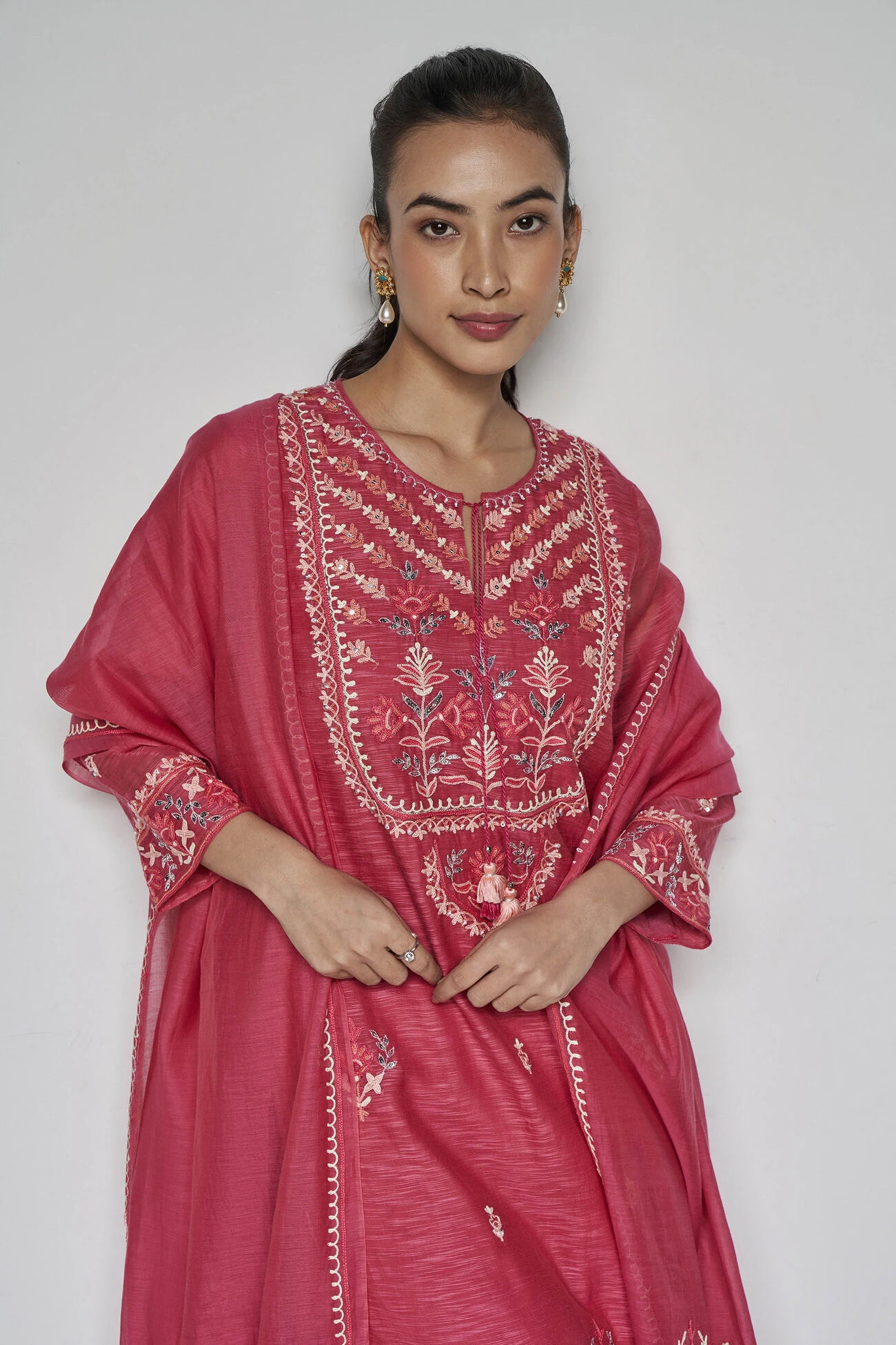 This raspberry-hued kurta set with pockets is a testament of the skills of rural India. Hand embroidered by the women artisans of SEWA, the floral motifs are a signature nurtured and perfected over time. The cotton-silk blend makes this a perfect answer to day and evening events.