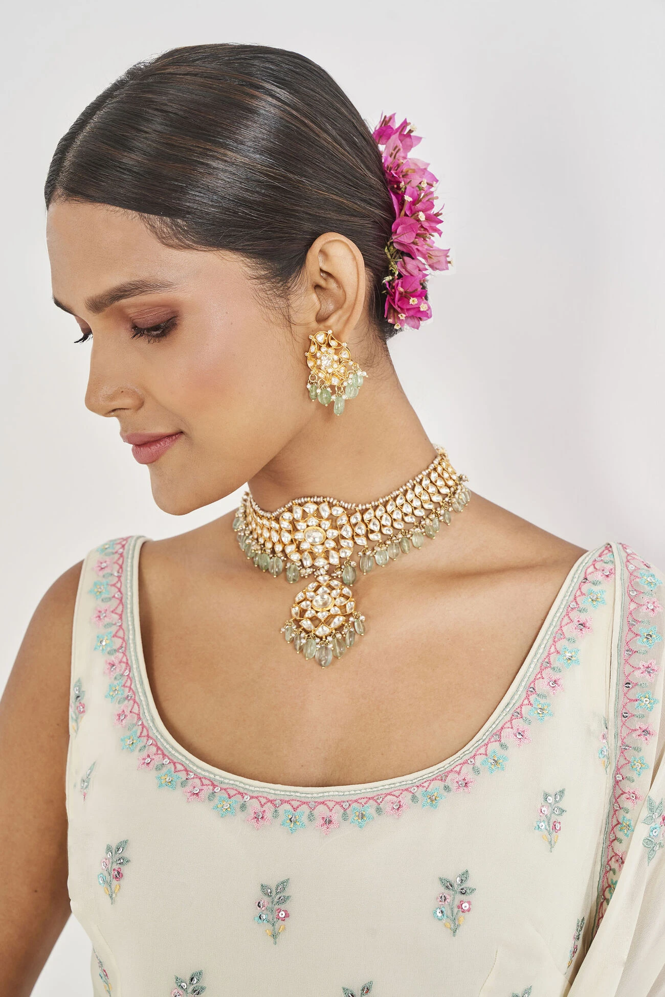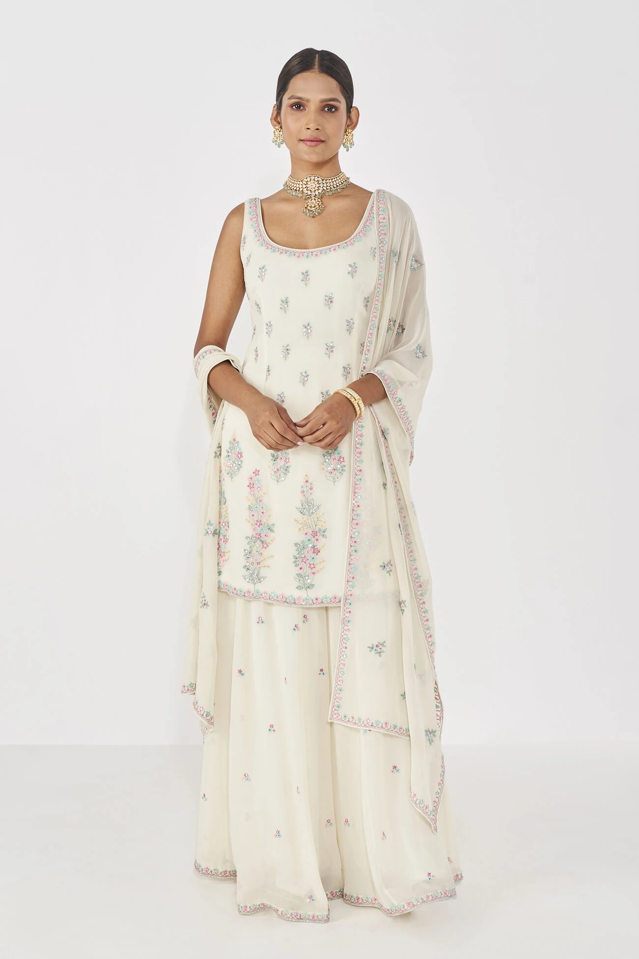 Pristine and elegant, the Elakshi suit set is for minimal style lovers. Highlighted with pastel thread embroidery, this ivory-colored occasionwear offers ease of movement.