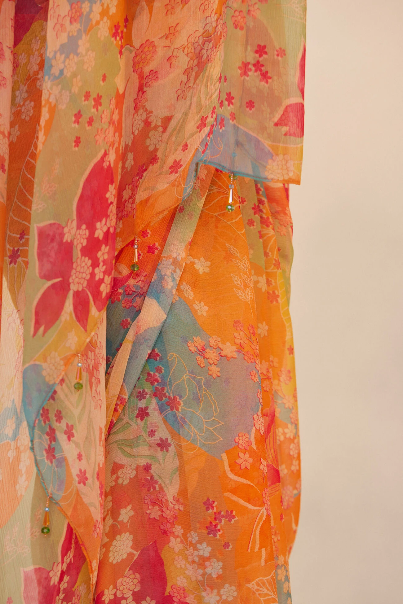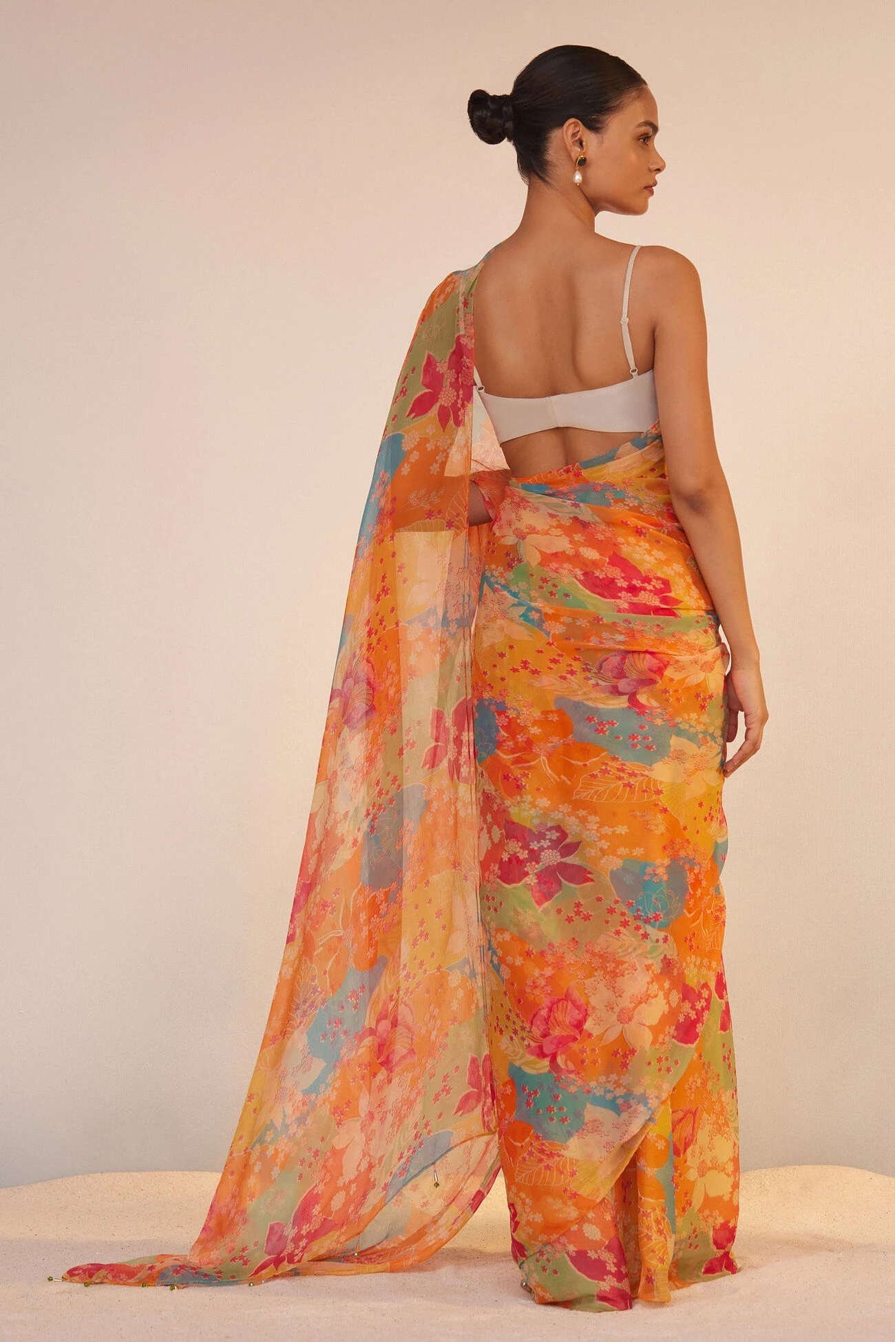 The bold floral print over the vibrant orange reveals a hint of your creative side, and the feather-light drape makes it effortlessly chic. Whether you’re attending a formal event or just an intimate affair, this vividly colored saree will be the perfect match.