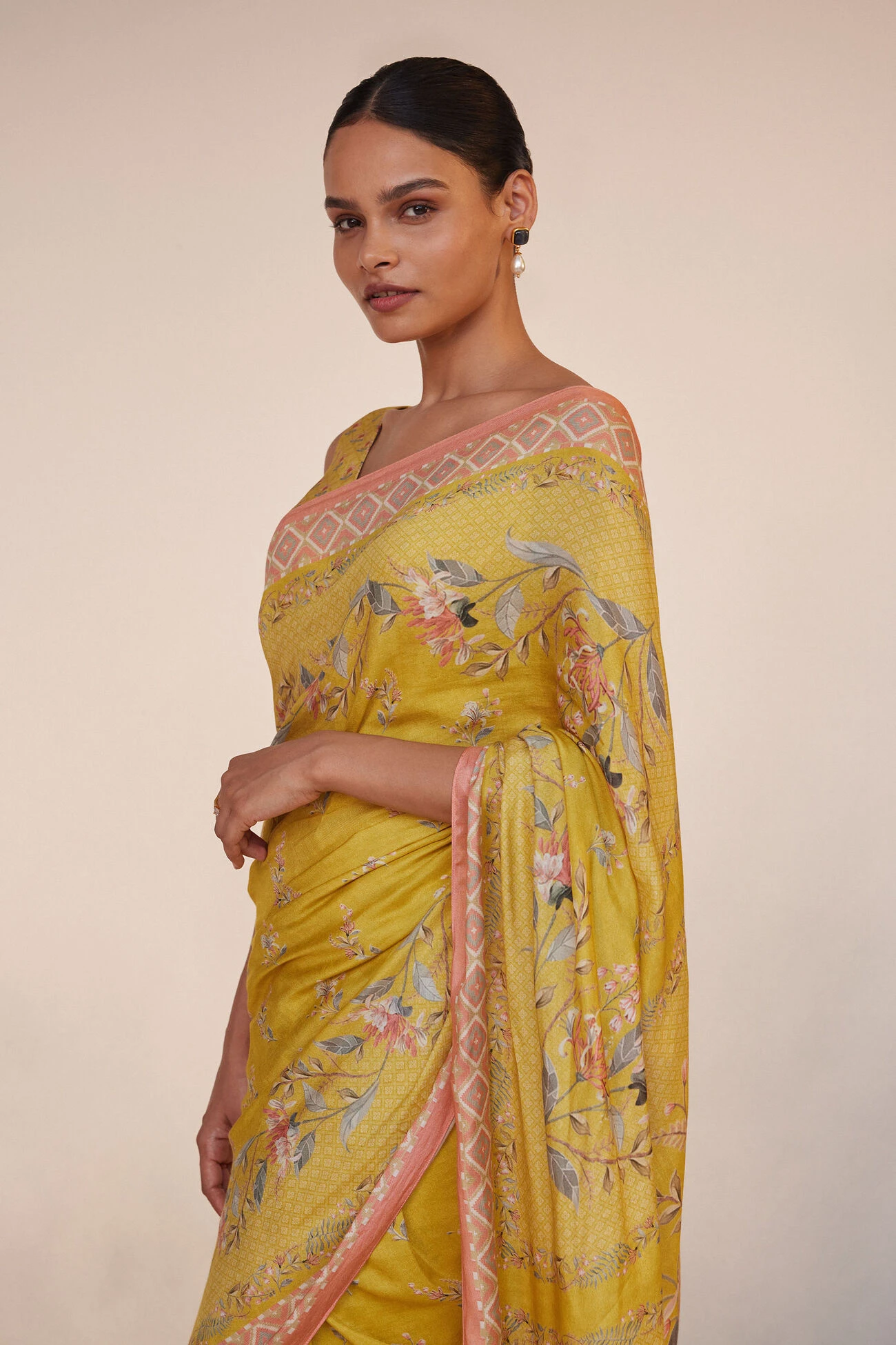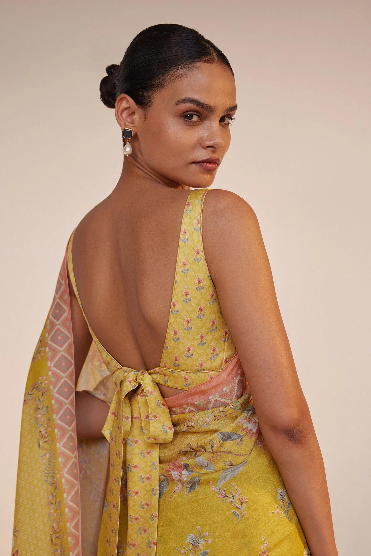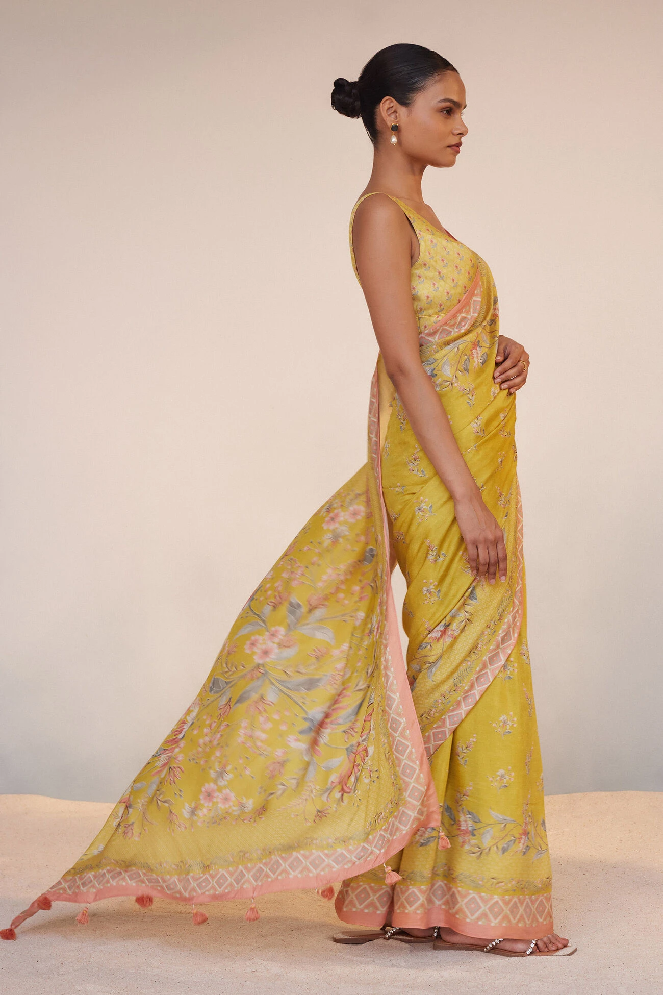 A saree that is reminiscent of swaying flowers and the breeze of a sultry summer day. This light-as-air drape is perfect for evening soirees or daytime celebrations.