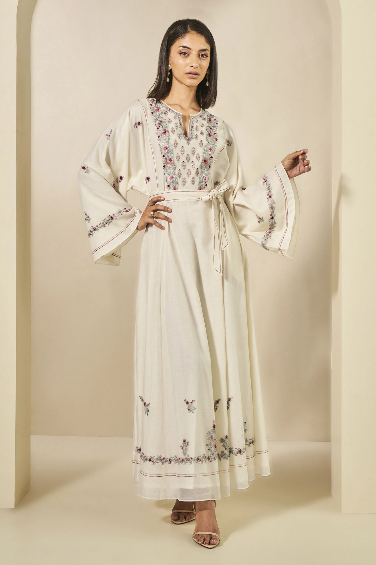 A breezy outfit in a subtle hue featuring blooming florals. Evalie is perfect for daytime celebrations and comes with a fabric belt.