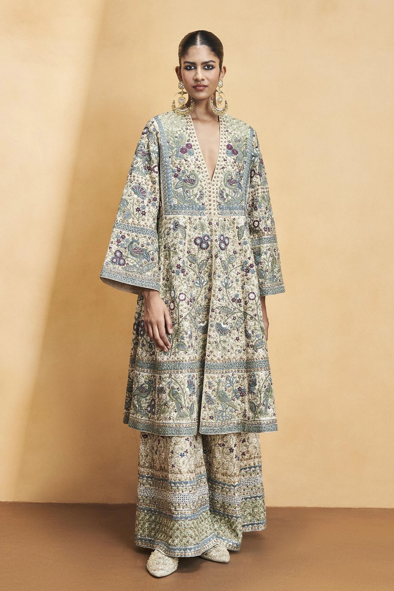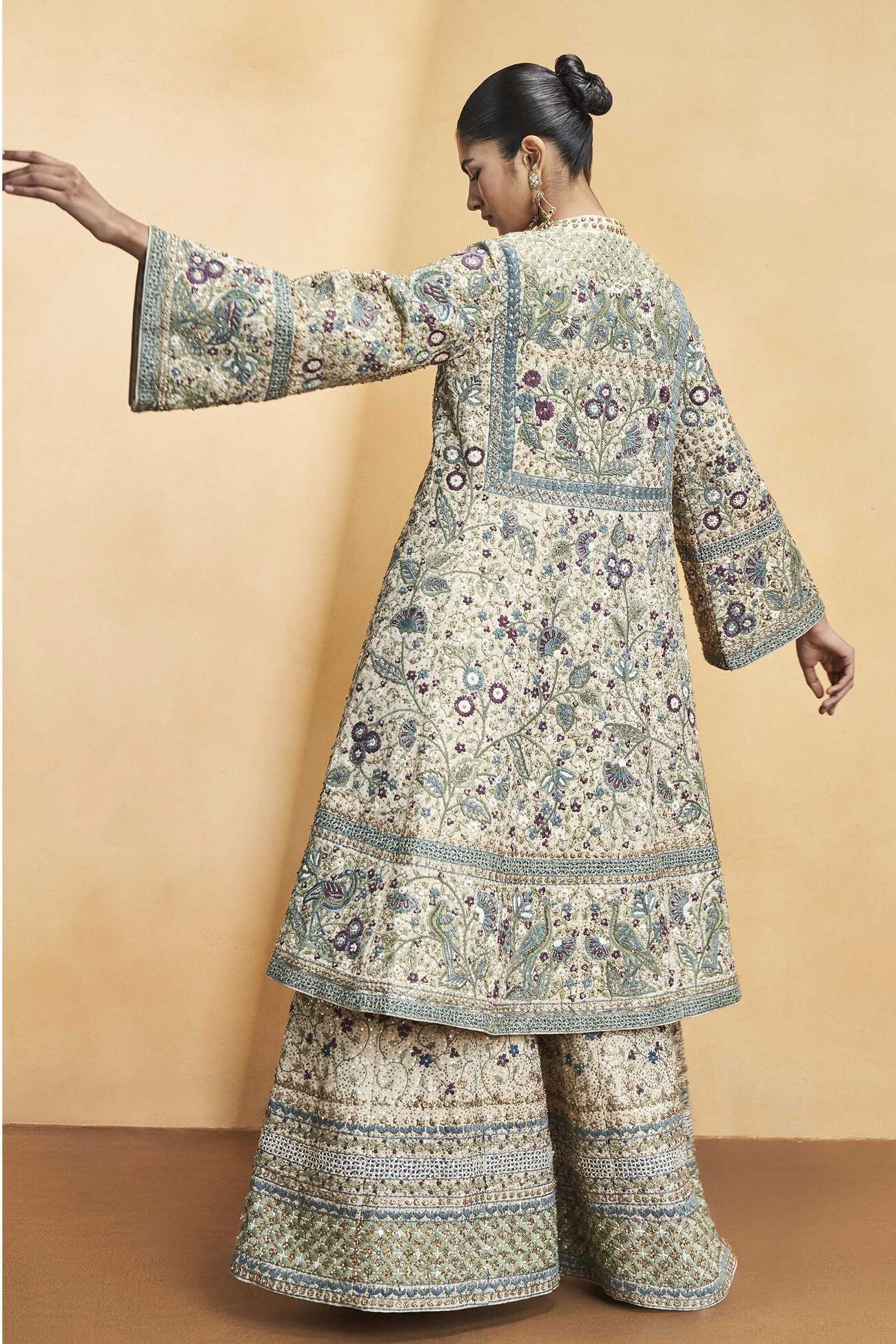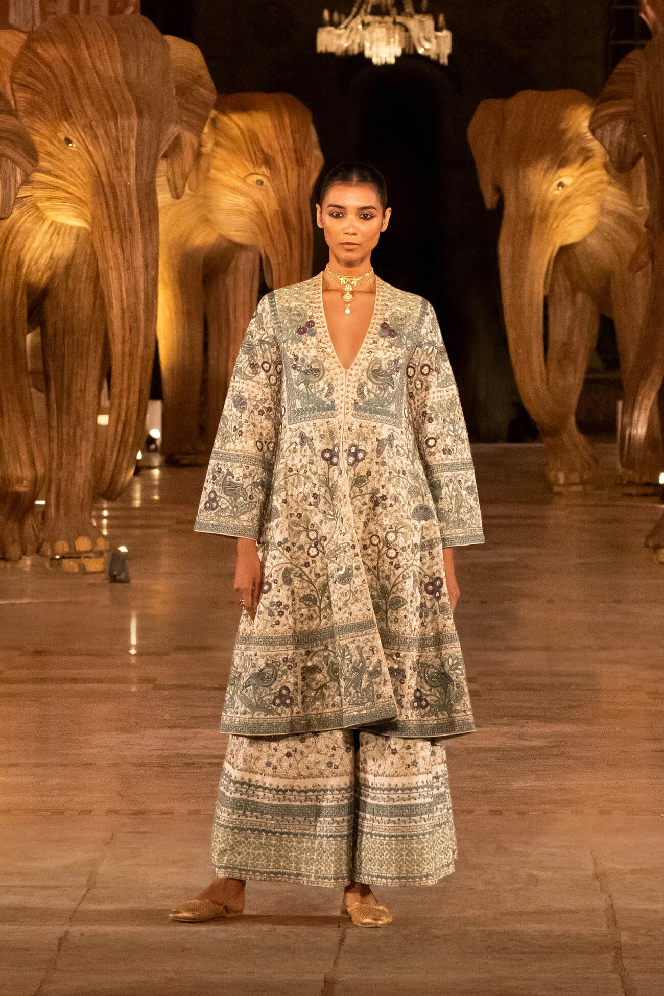 Inhabitants of the forest and their harmonious bond have been featured beautifully in this kurta set. Elevated with zardozi and gleaming sequins for contemporary celebrations.