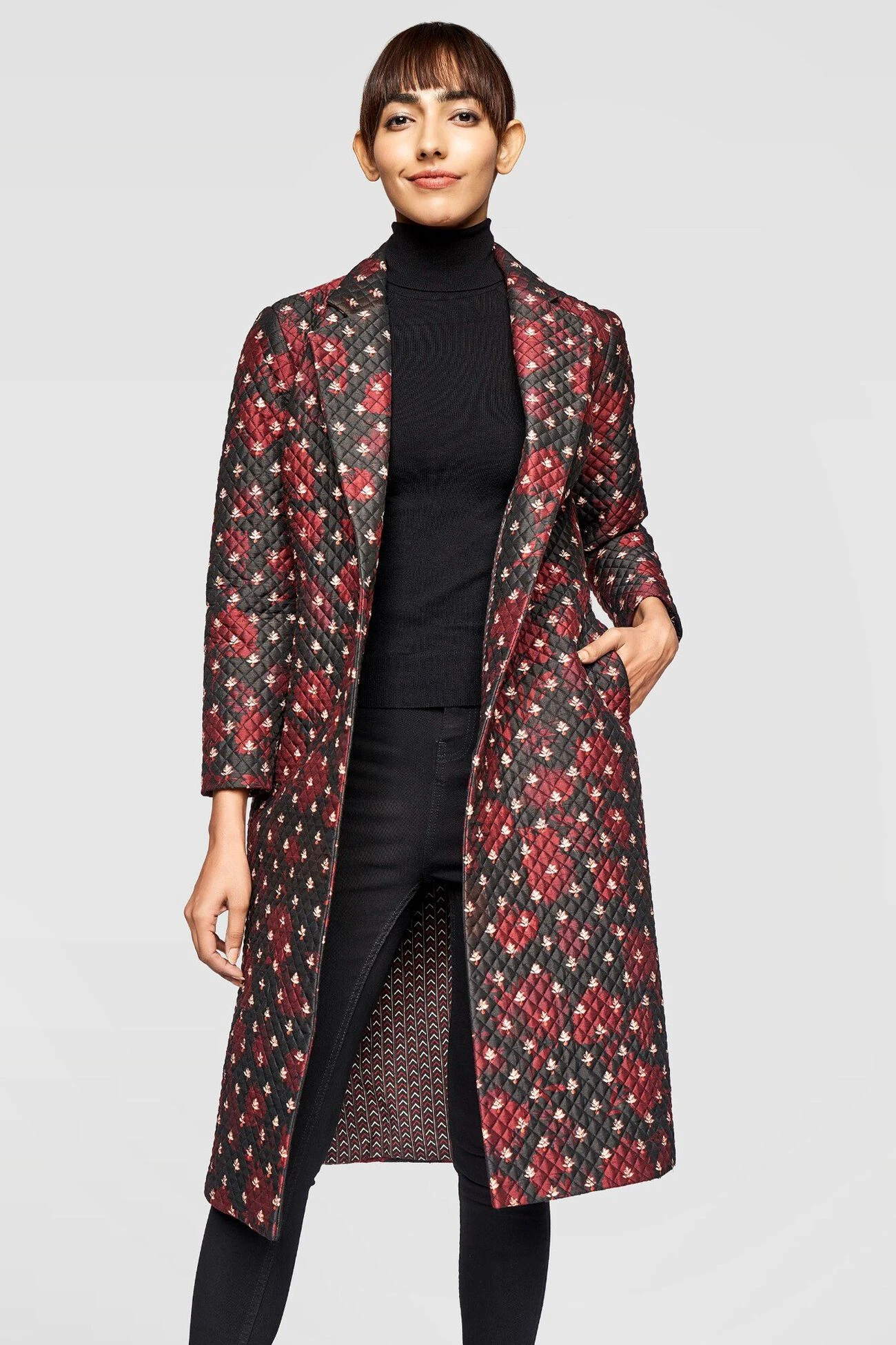 This open-style black silk jacket is effortlessly elegant.Covered in contrasting prints, it is a statement piece that adds a touch of luxury to your winter wardrobe.