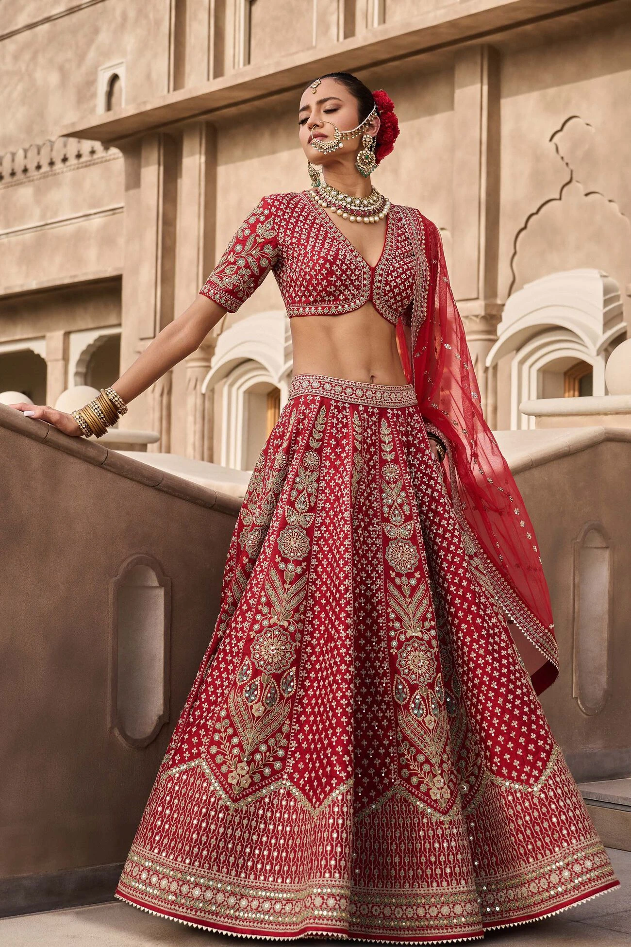 Embellished with floral and geometric motifs in fine golden cord, our Gahina Lehenga Choli in purple is a bride& dream come true. The sleeves of the perfectly-cut choli are intricately designed, to echo the lehenga& rich look. Perfect for the modern bride, who wants to pay homage to her traditional roots.