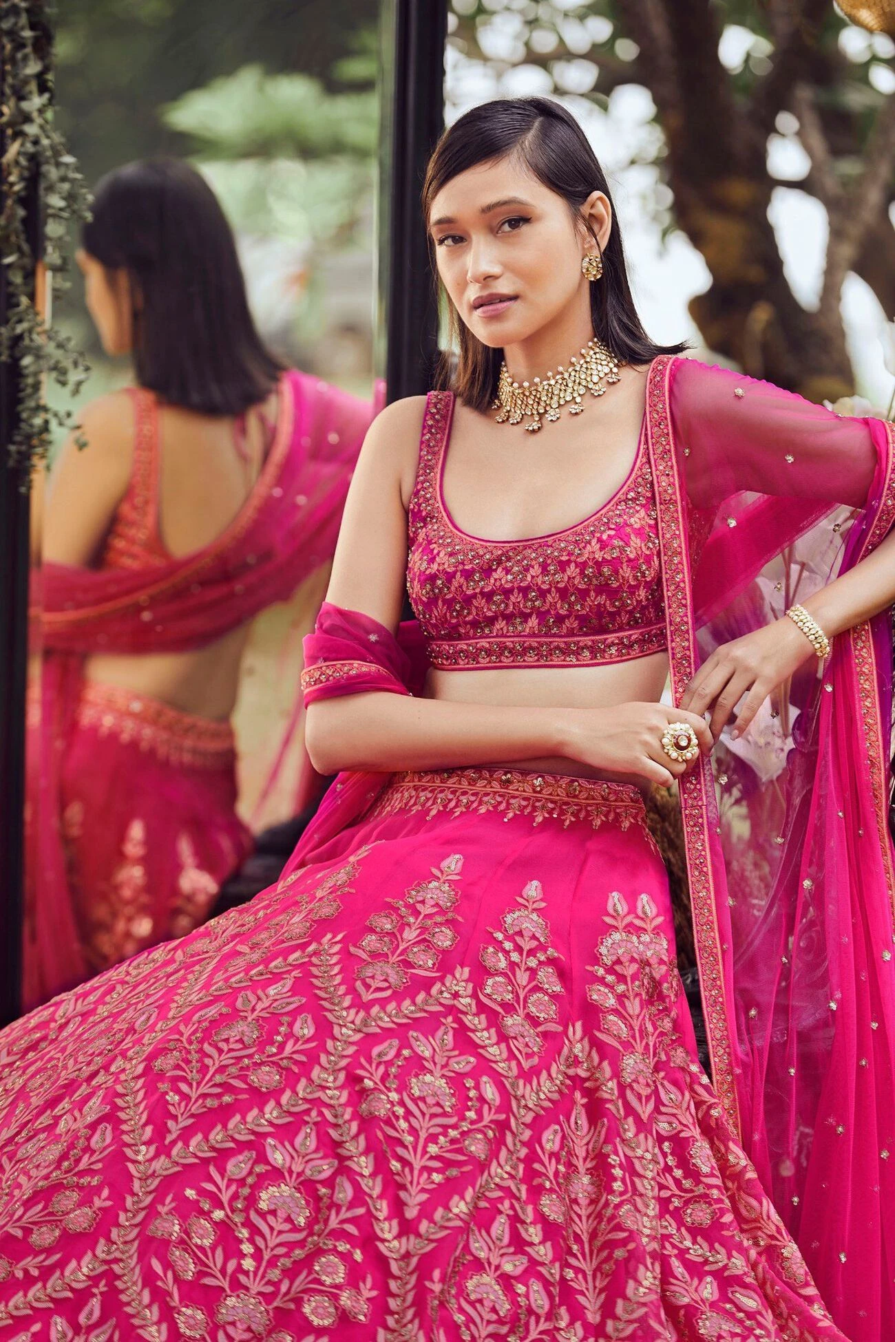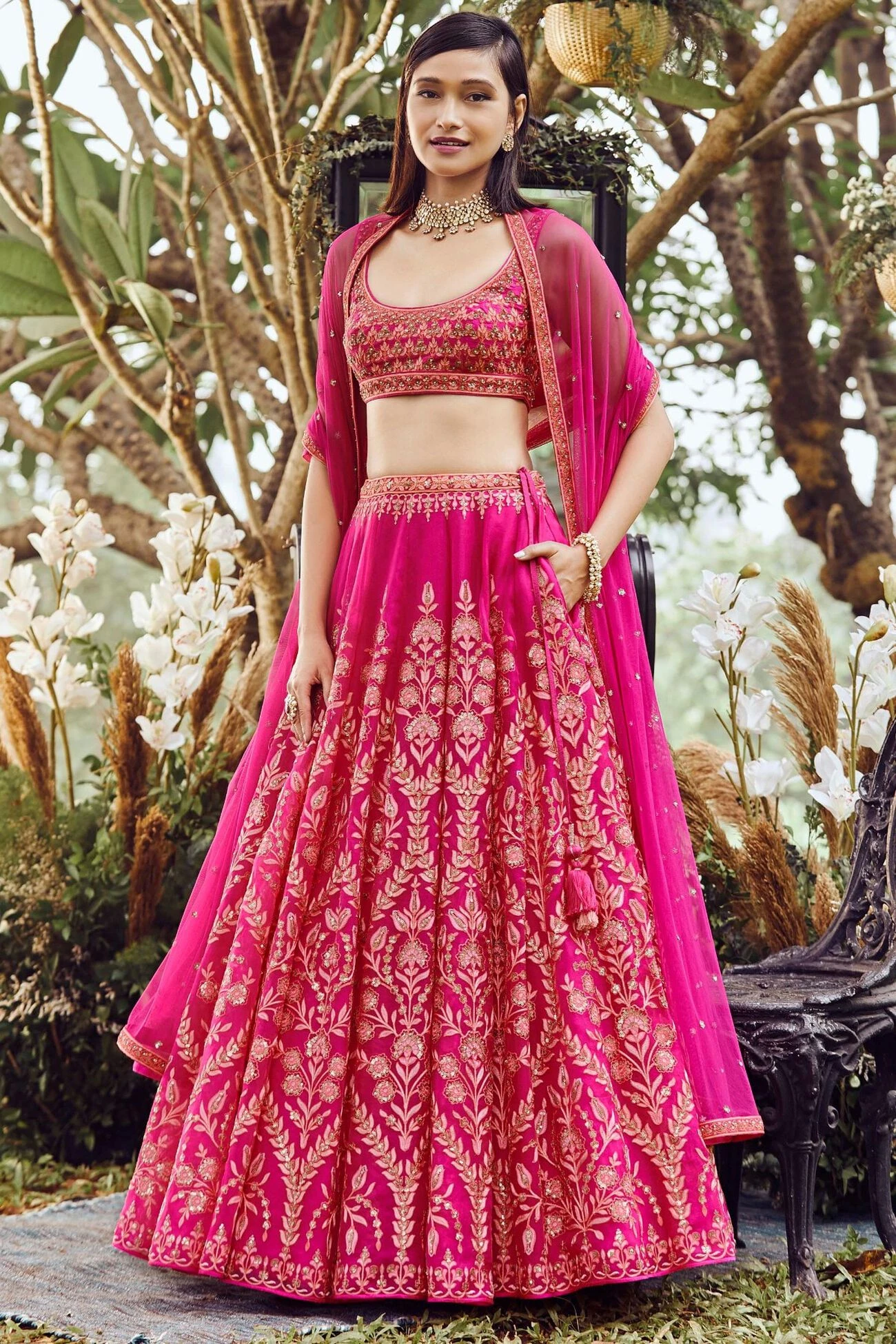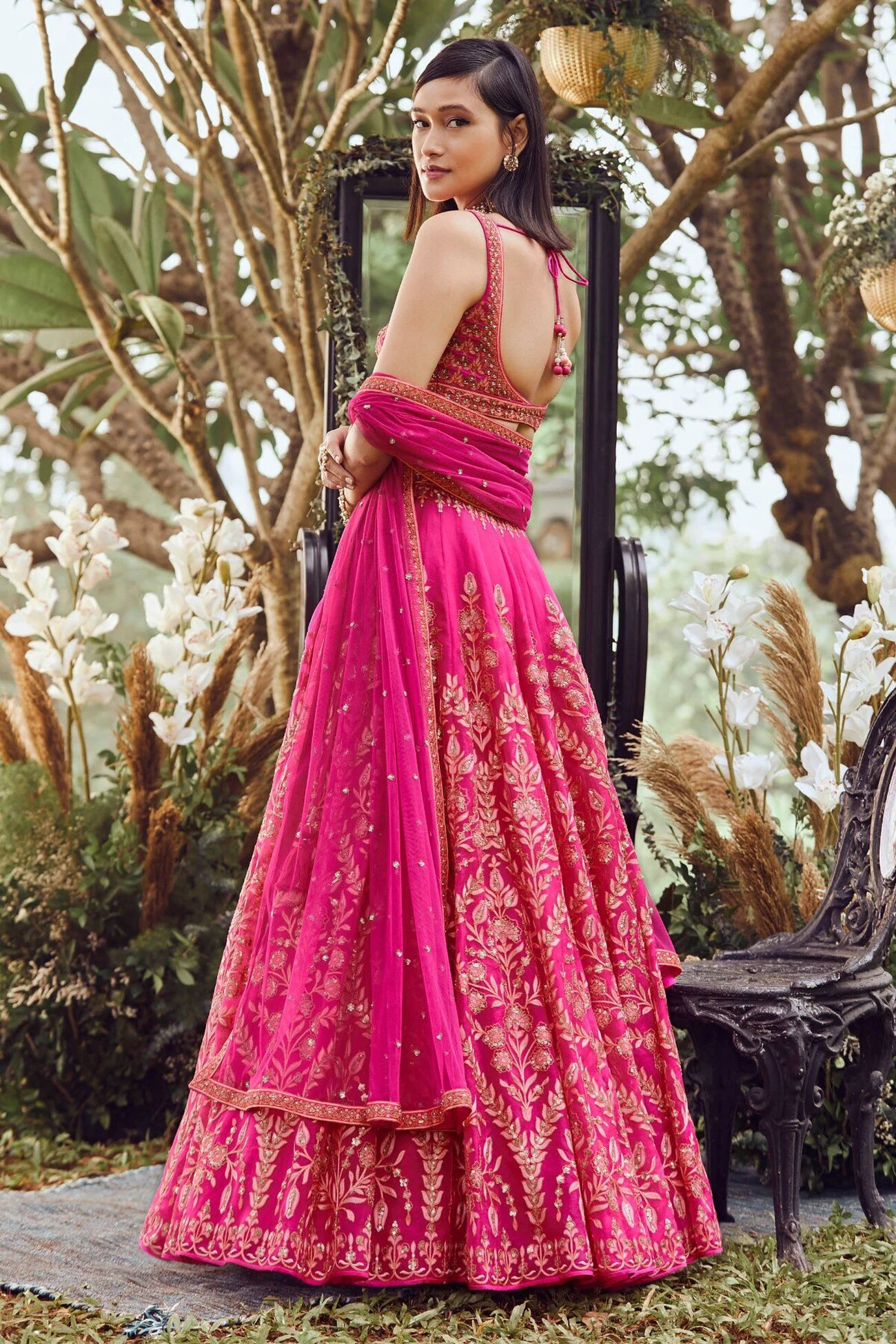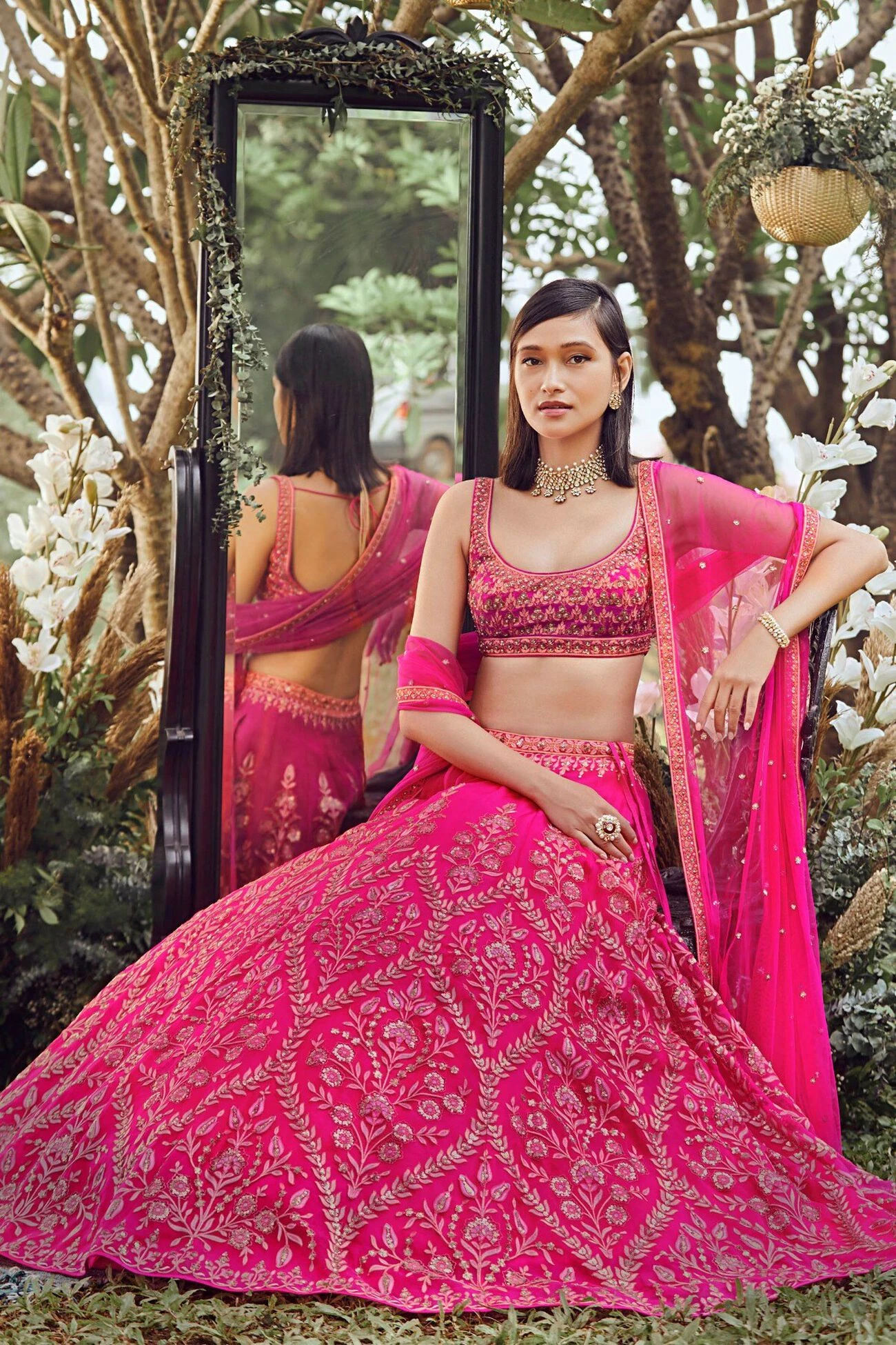 An alluring pink lehenga in exquisite silk and enhanced with the timeless beauty of dori embroidery inspired by royal Indian botanical motifs. A luxurious silhouette that frames you in lightness and an enduring charm.