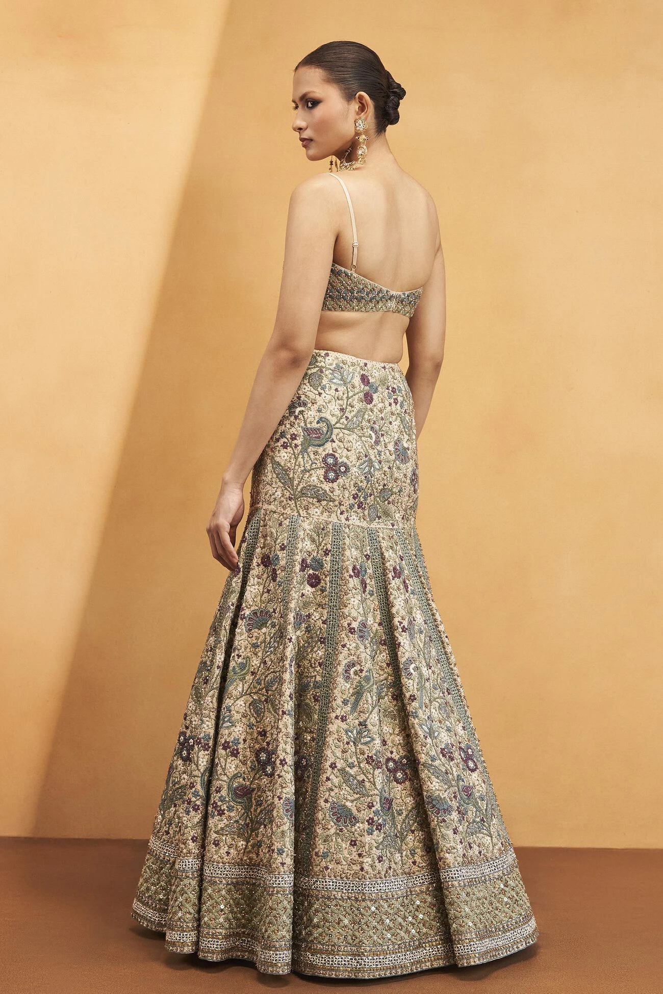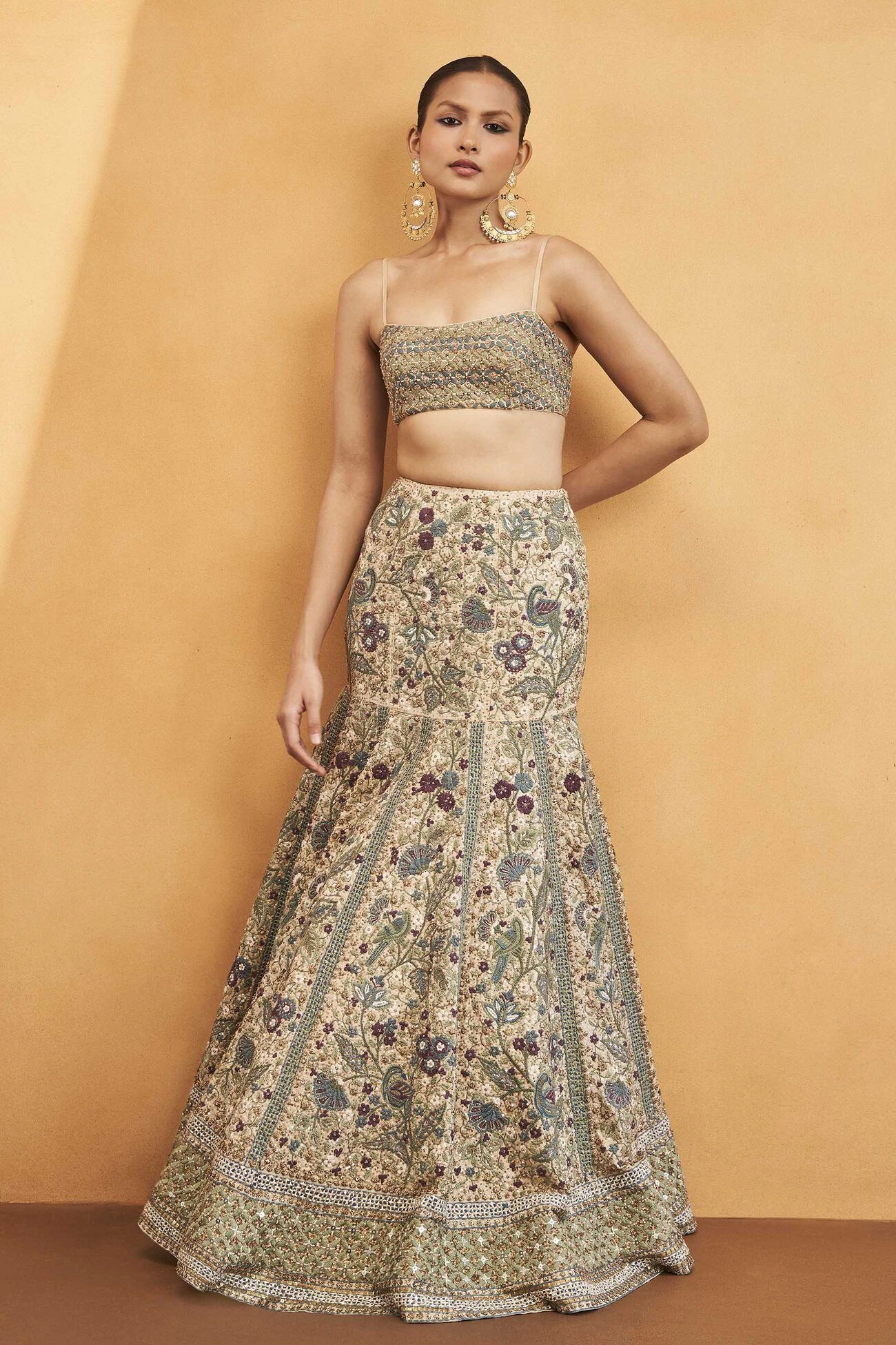 Featuring the harmonious co-existence of lush flora and diverse fauna, this skirt set is crafted for contemporary celebrations. Gleaming details and resplendent nature-inspired motifs make it an enchanting ensemble.