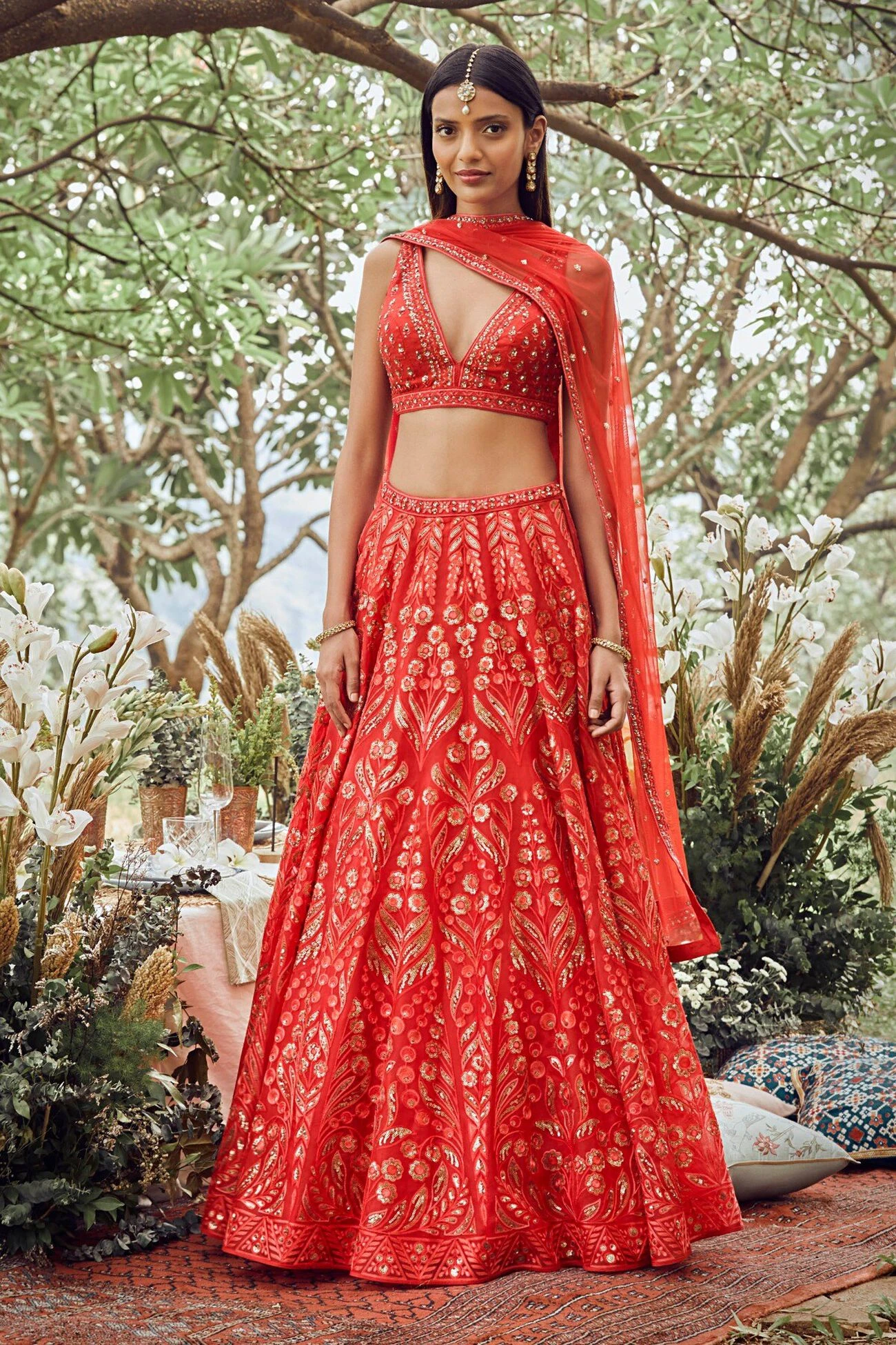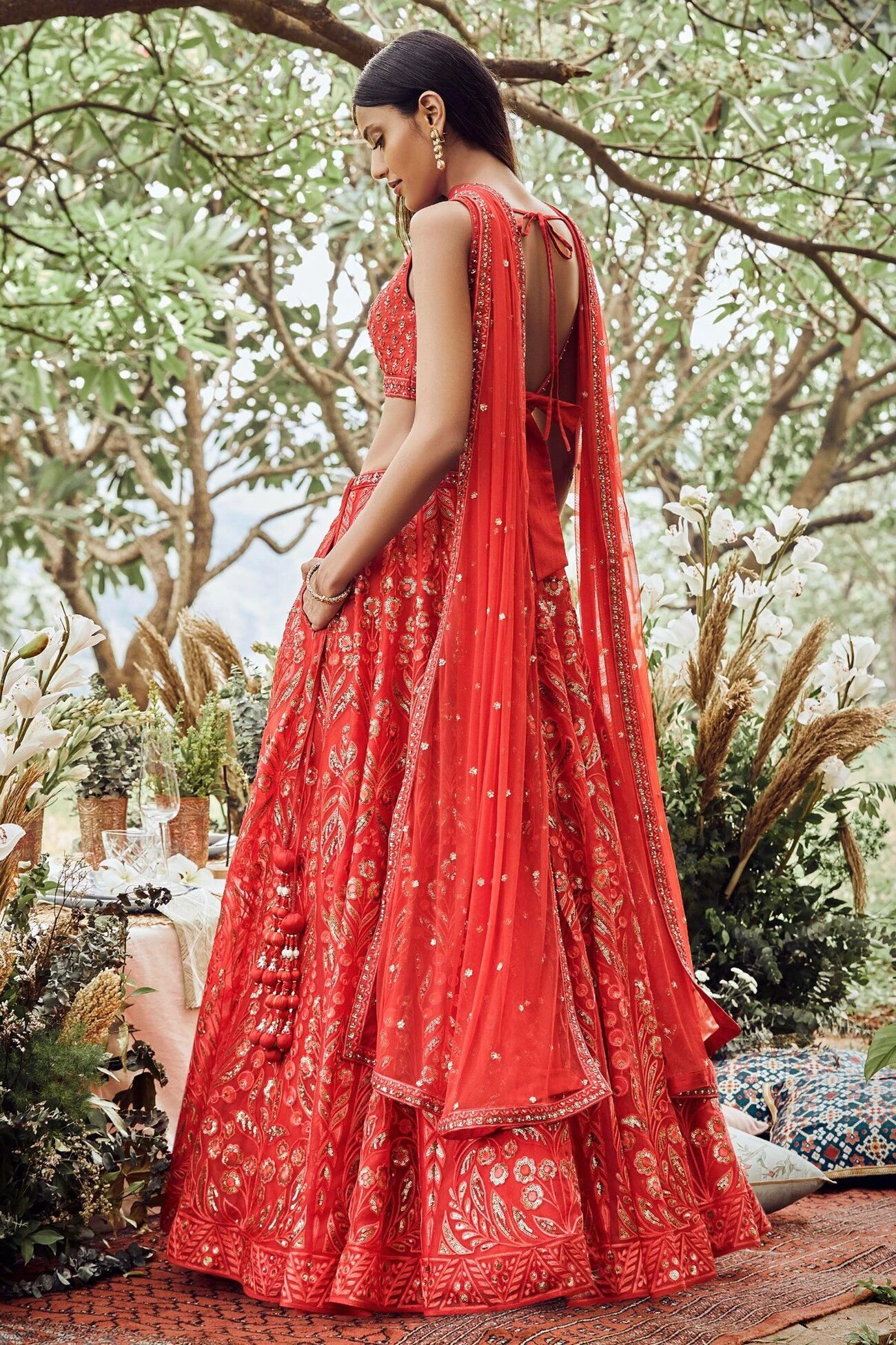 An eye-catching red lehenga in exquisite silk and enhanced with the timeless beauty of dori embroidery inspired by royal Indian botanical motifs. A luxurious silhouette that frames you in lightness and an enduring charm.