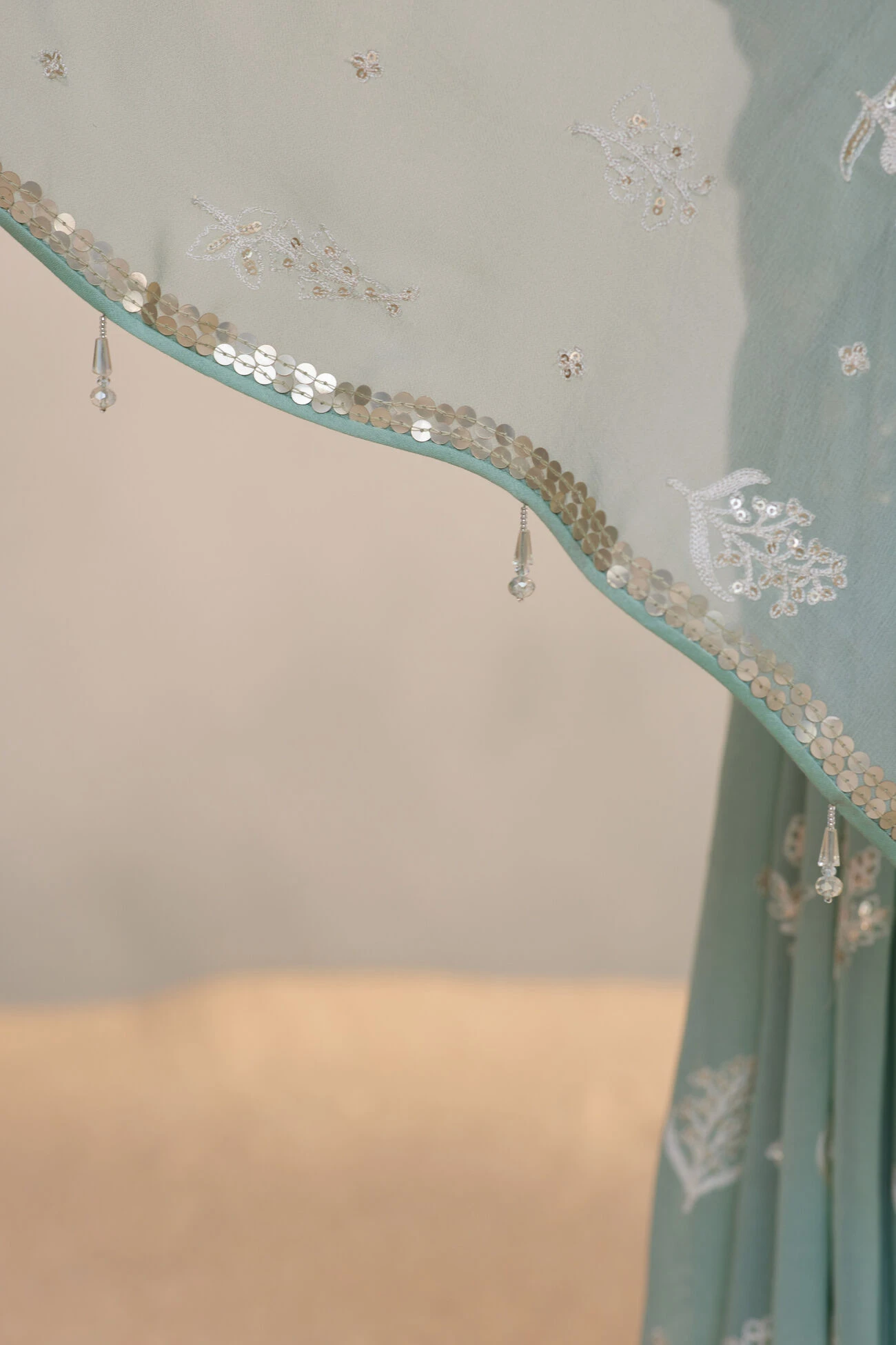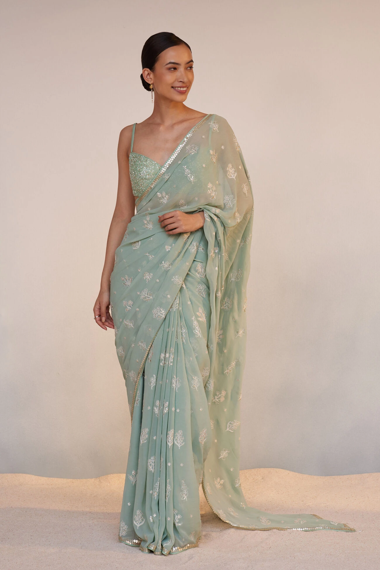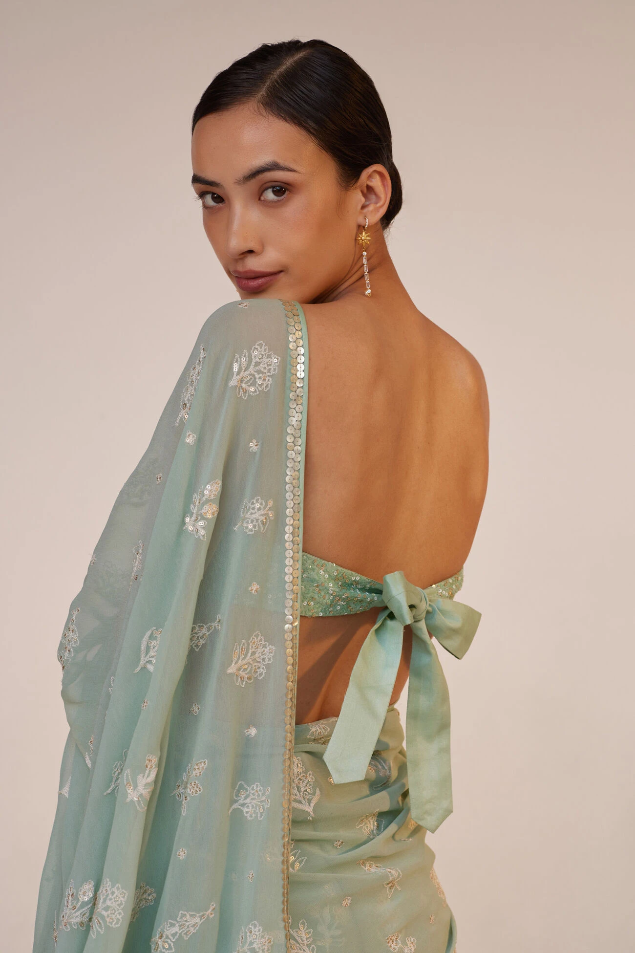 A trans-seasonal saree in a soothing color palette makes Iqra perfect for alfresco celebrations.