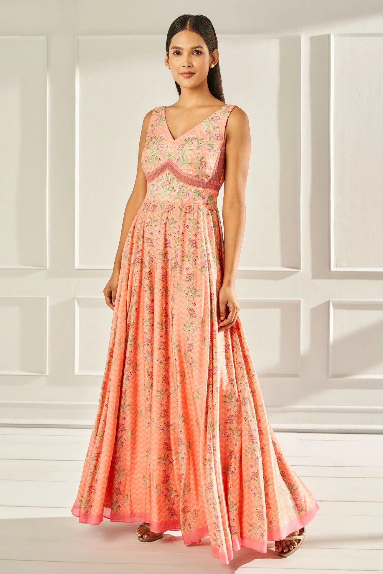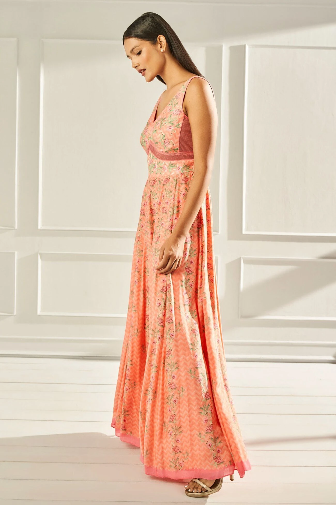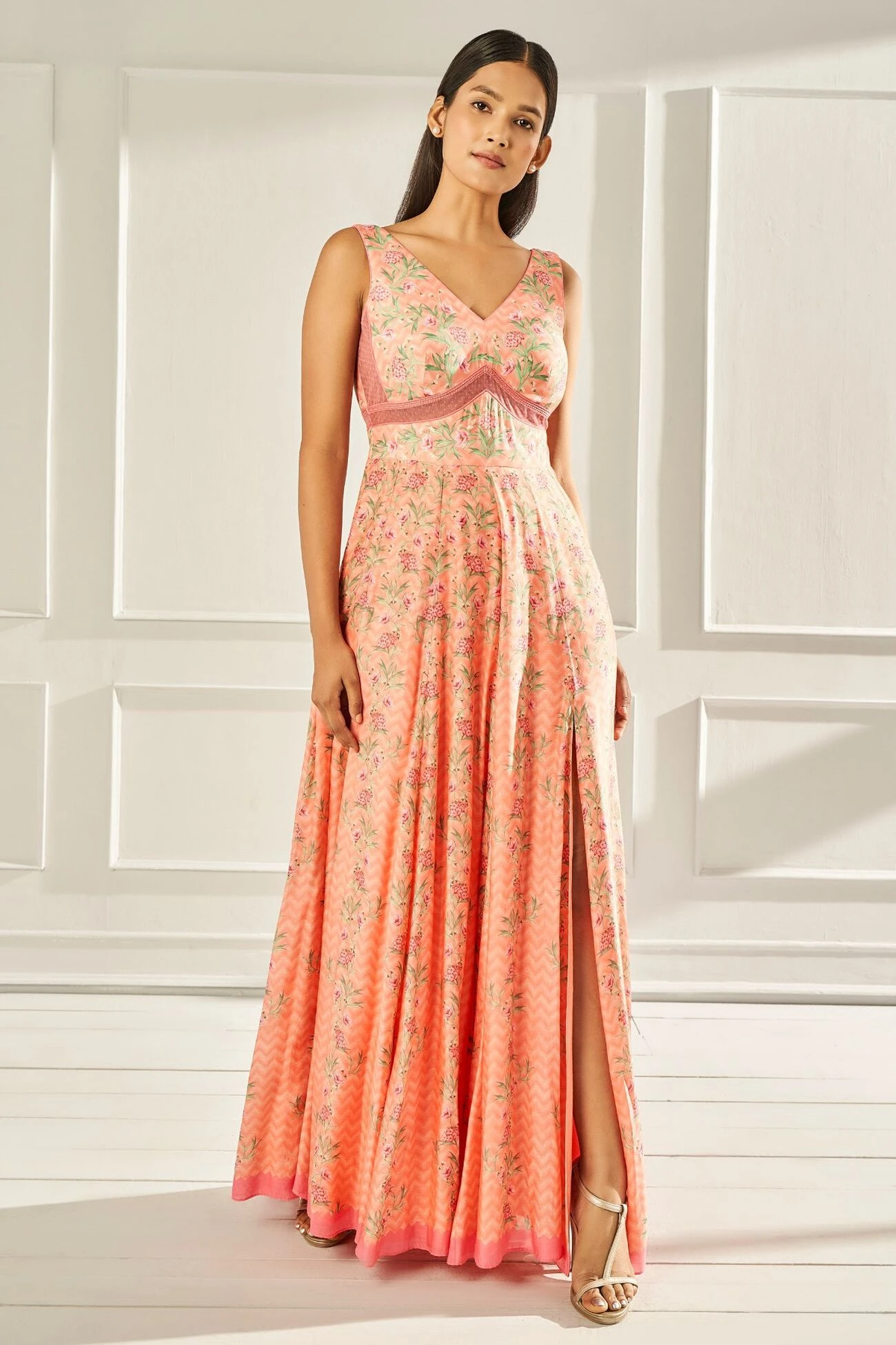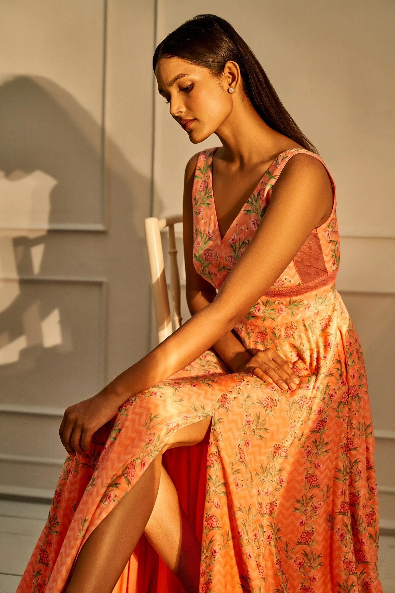 The soft coral hue and bouquets of floral prints make the sleeveless Isabella Gown versatile for any event. Made with sustainable fabric, it has a hint of glamour, with slits on the side. All you need are the right accessories.