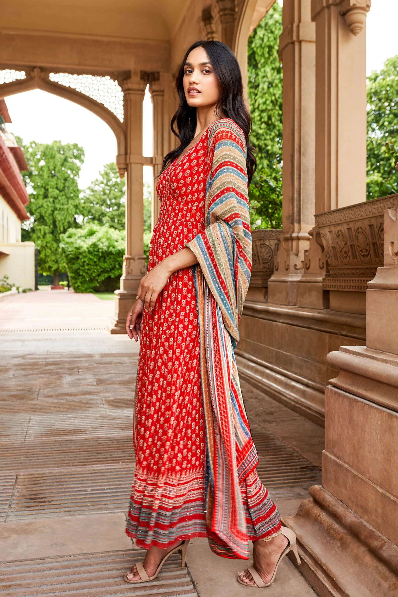Turn heads in any gathering wearing this striking suit set with prints scattered over georgette and sequins for a little glam!