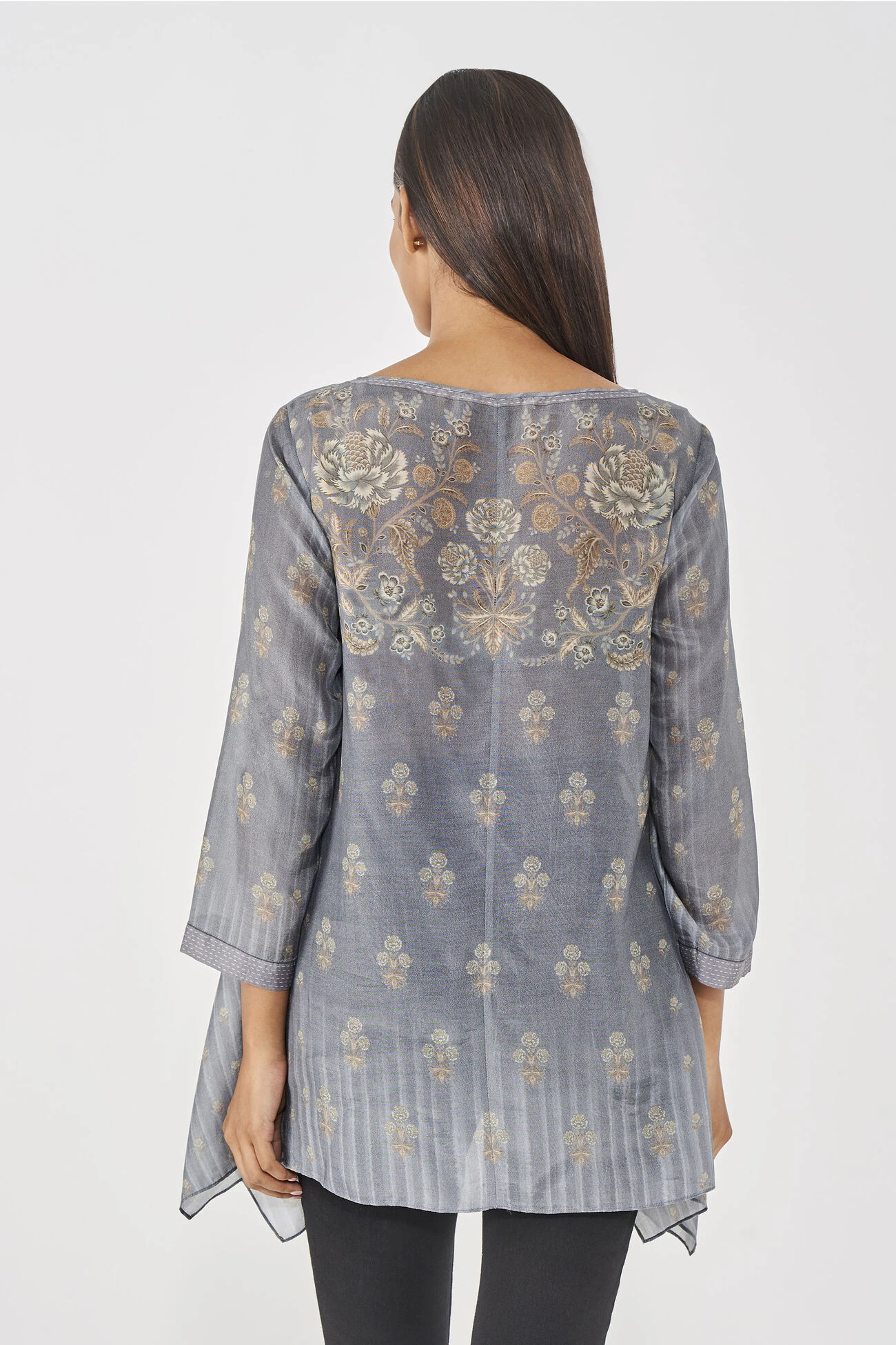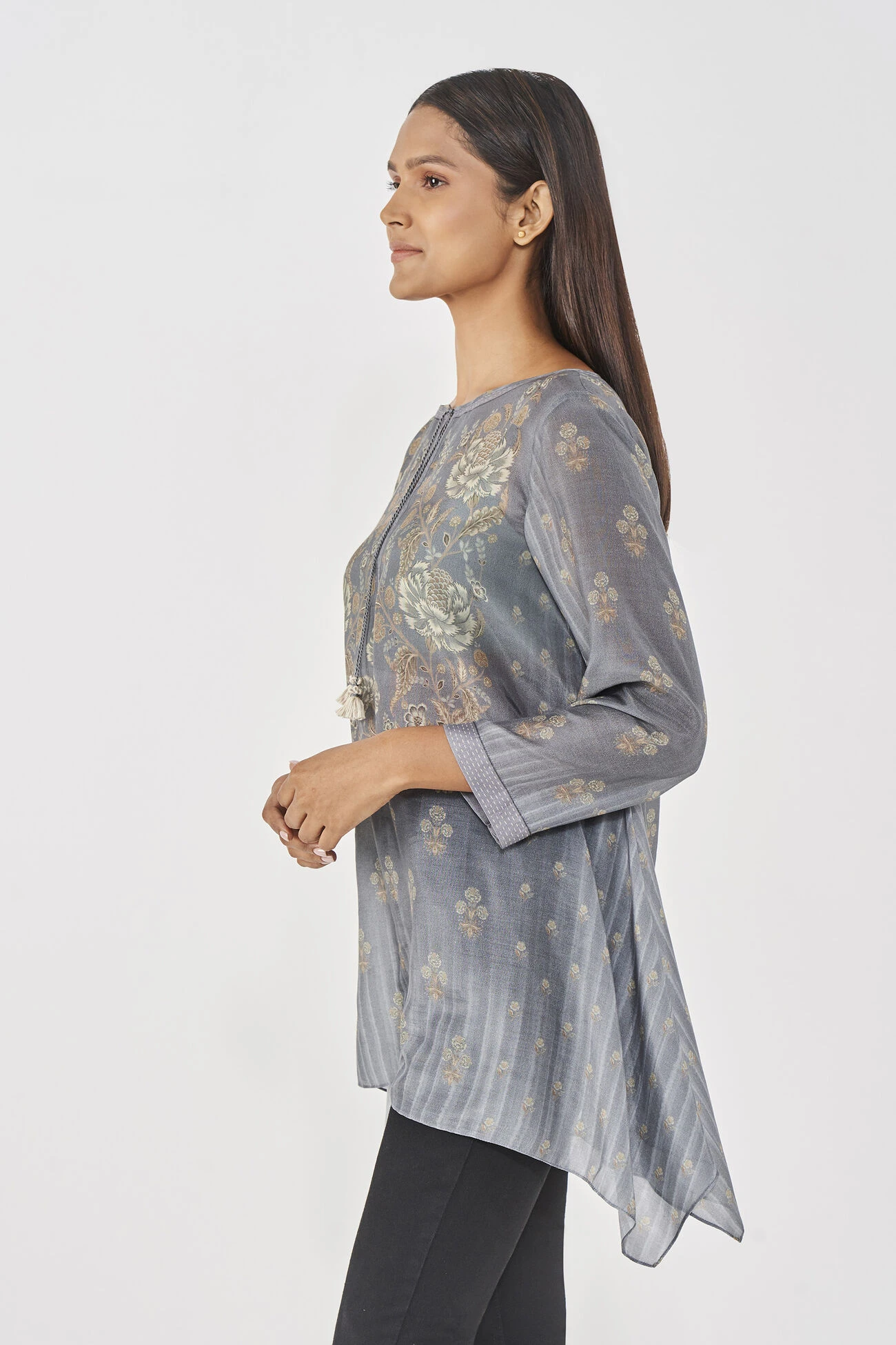 This easy and sustainable Kasia top in grey with digital print all over exudes elegance. With an asymmetrical hemline and tassel accent at the neck, this flowy fit proves to be perfect for noon dates and laid-back settings.