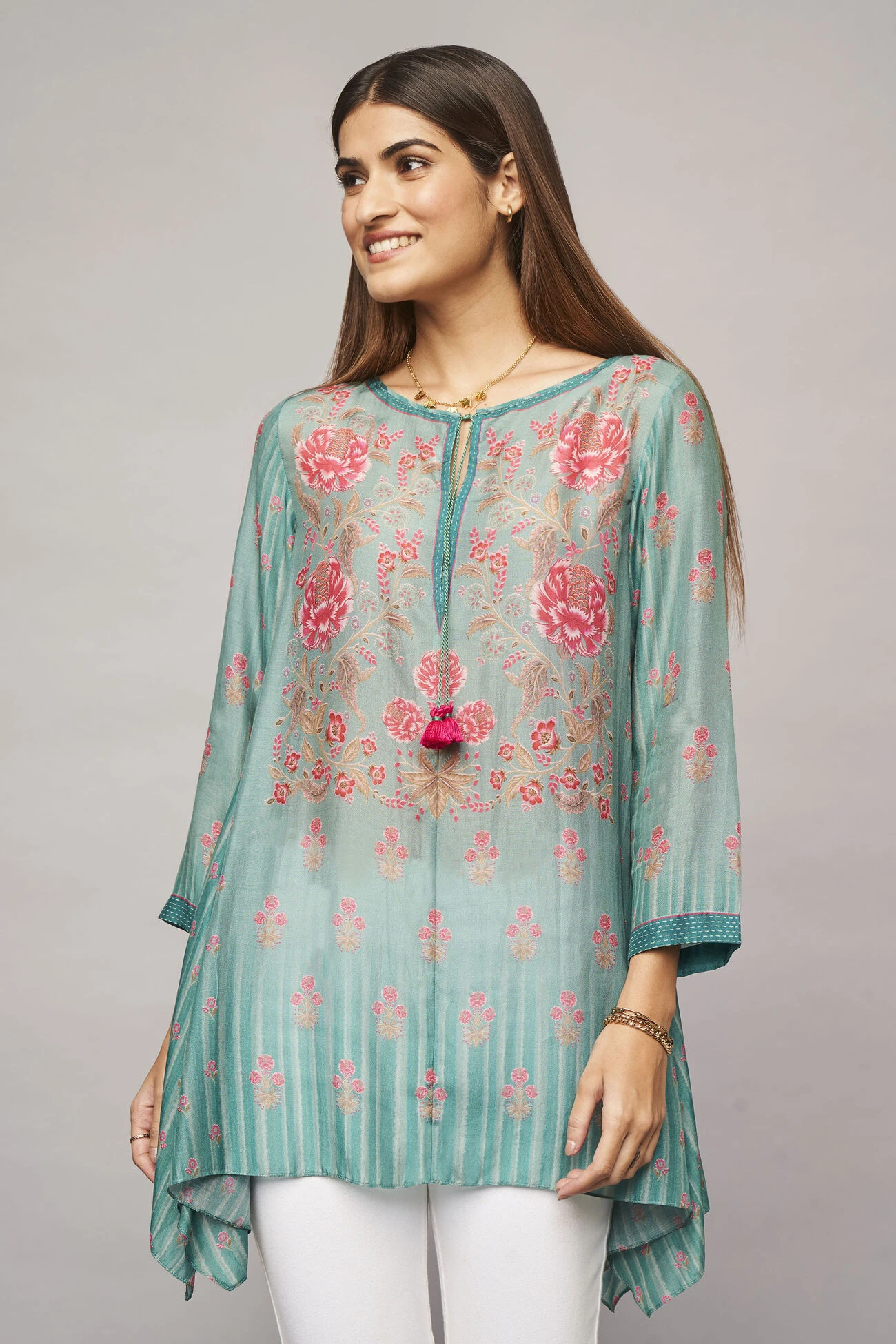 This easy and sustainable Kasia top in sage with digital print all over exudes elegance. With an asymmetrical hemline and tassel accent at the neck, this flowy fit proves to be perfect for noon dates and laid-back settings.