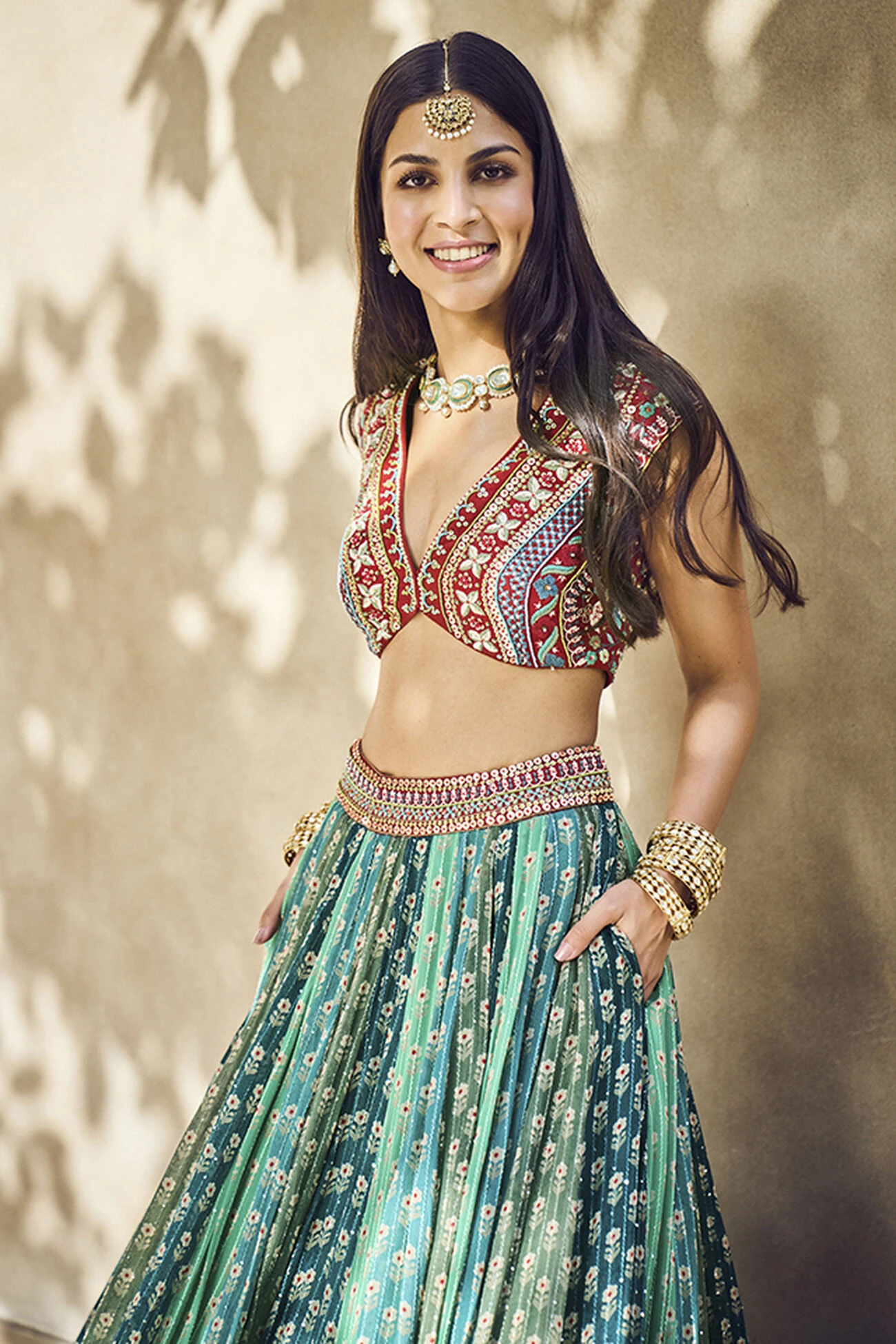 Our Kavi Lehenga features panels of colour and craft. Whimsical at heart, it has accents of embroidery that catch the light. This is a piece to dance in.