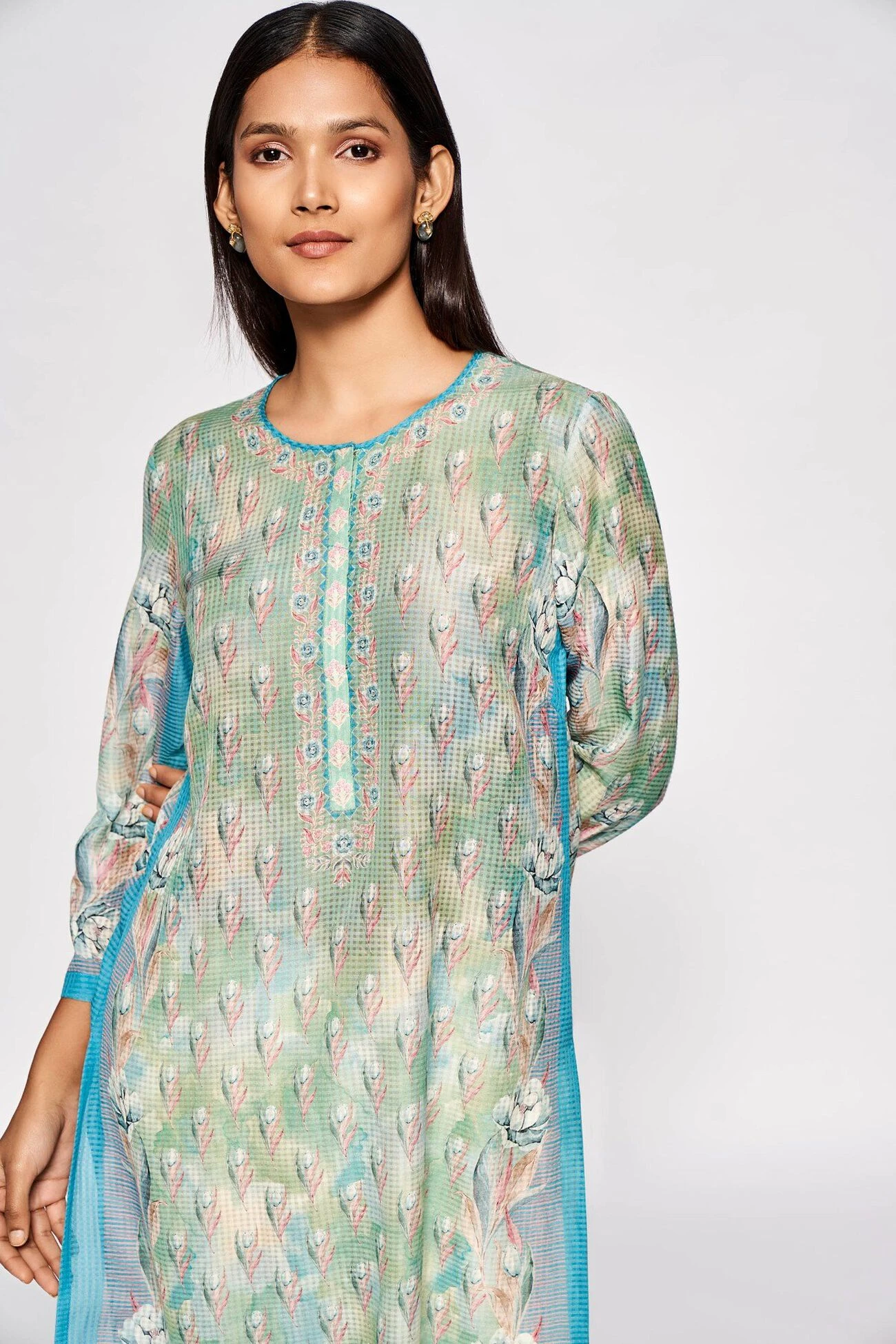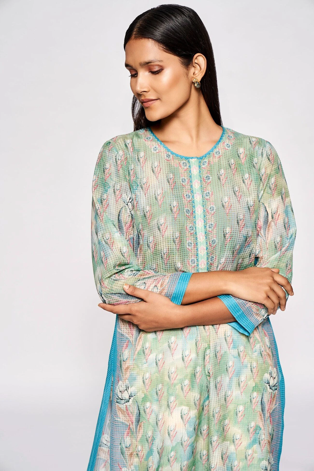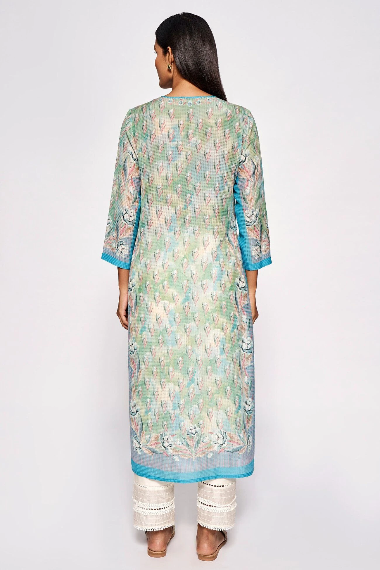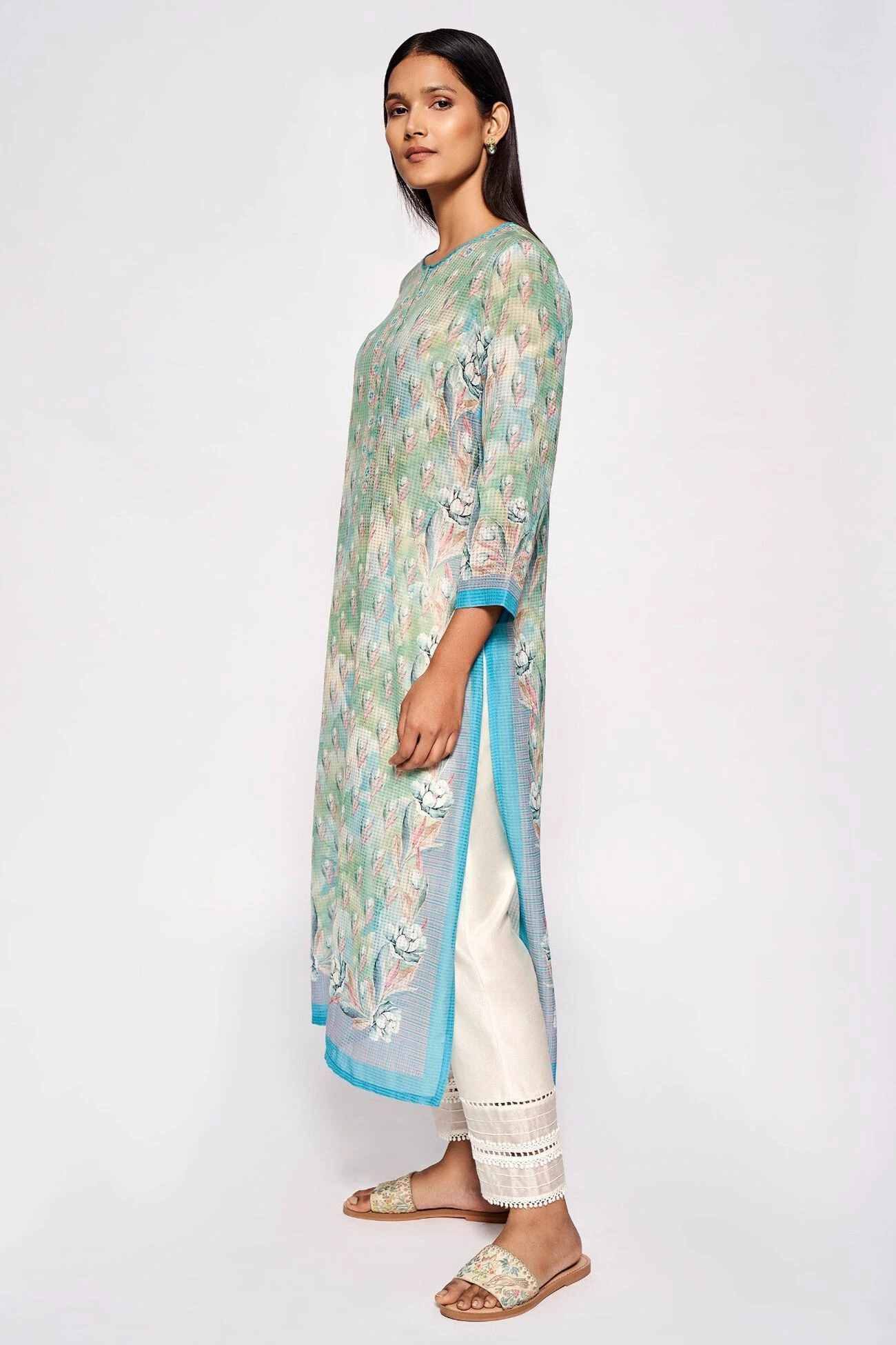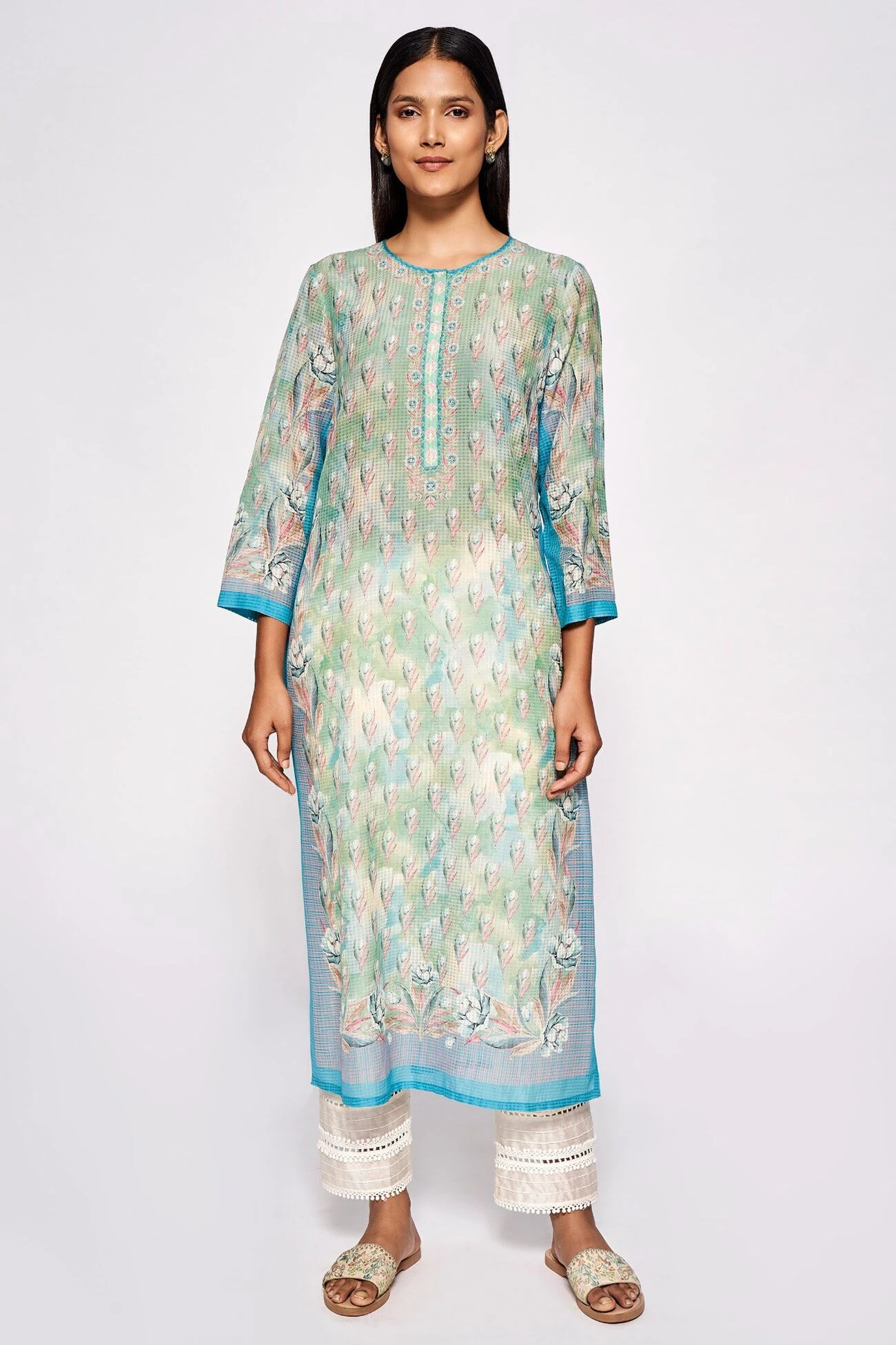 This long blue kurta with a round neckline and three-fourth sleeves is made for balmy days. The light dusting of floral prints spells summer. Wear it with cotton trousers or leggings to get through your days with ease.