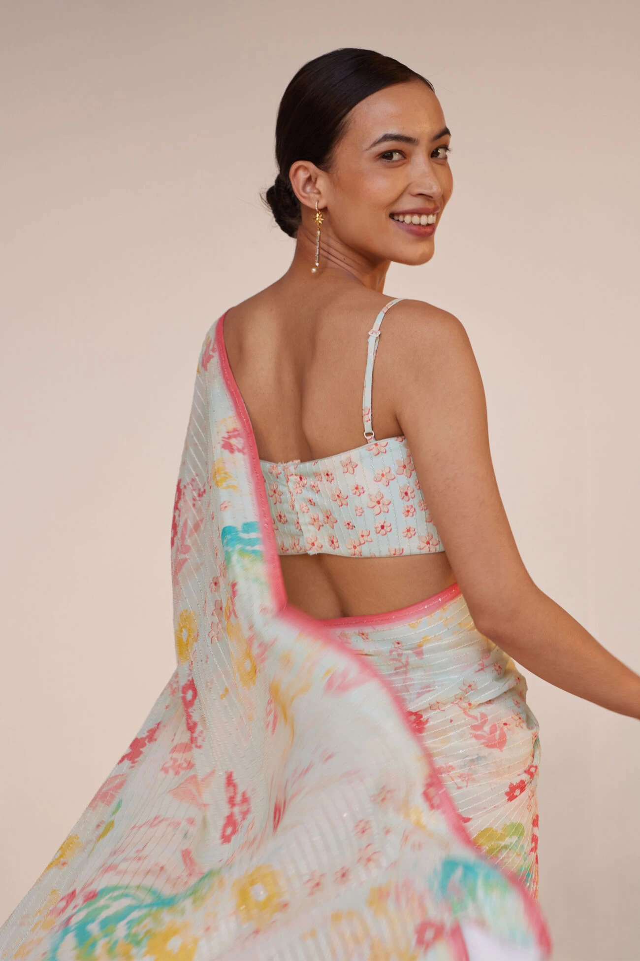 The perfect white saree with abounding florals makes Lolana ideal for summer. Breezy and colorful, it is the perfect drape for daytime soirees.