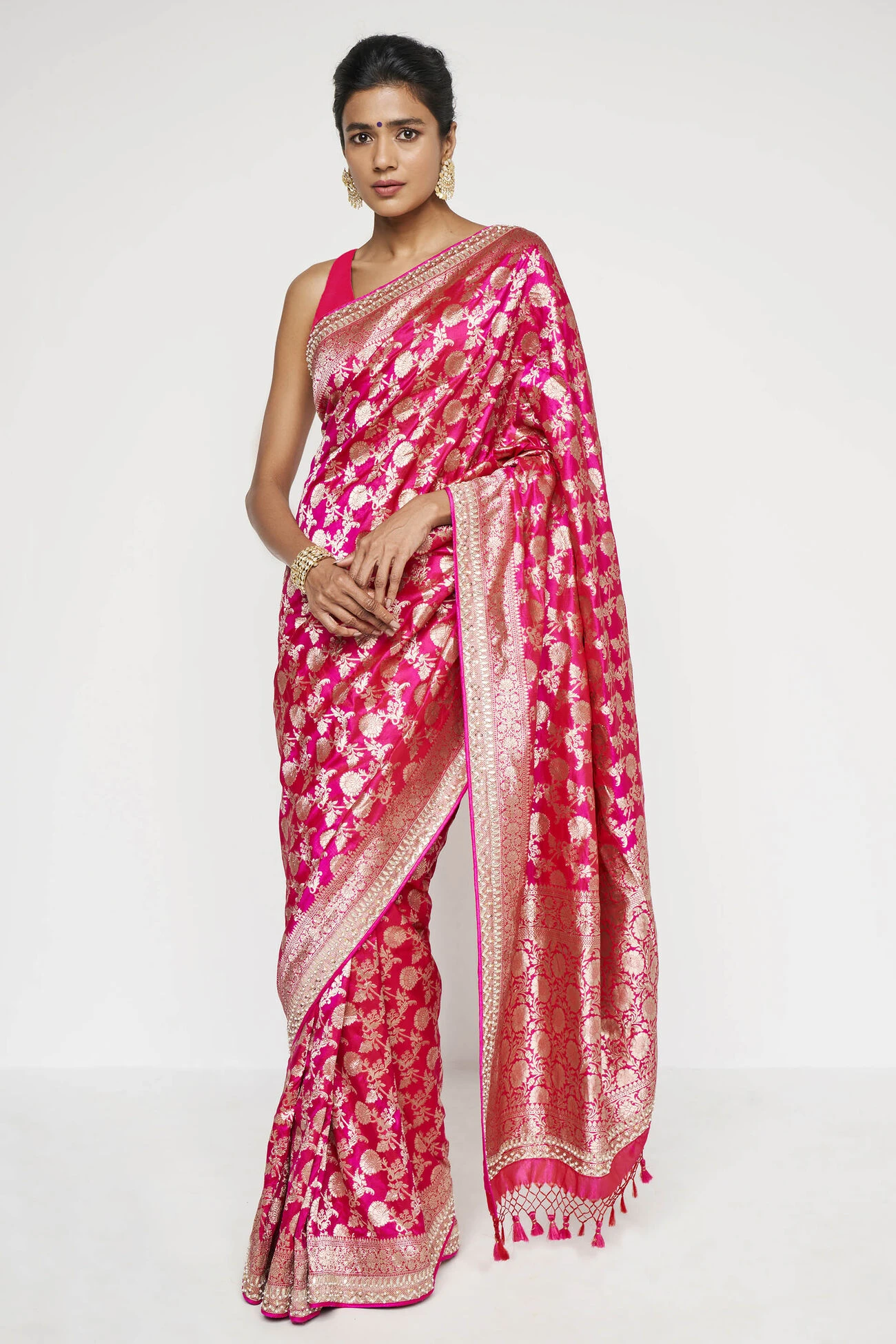 Our Madhurima saree is handwoven in Benaras. With its intricate embroidery and striking pink expression, it is a perfect choice for weddings.