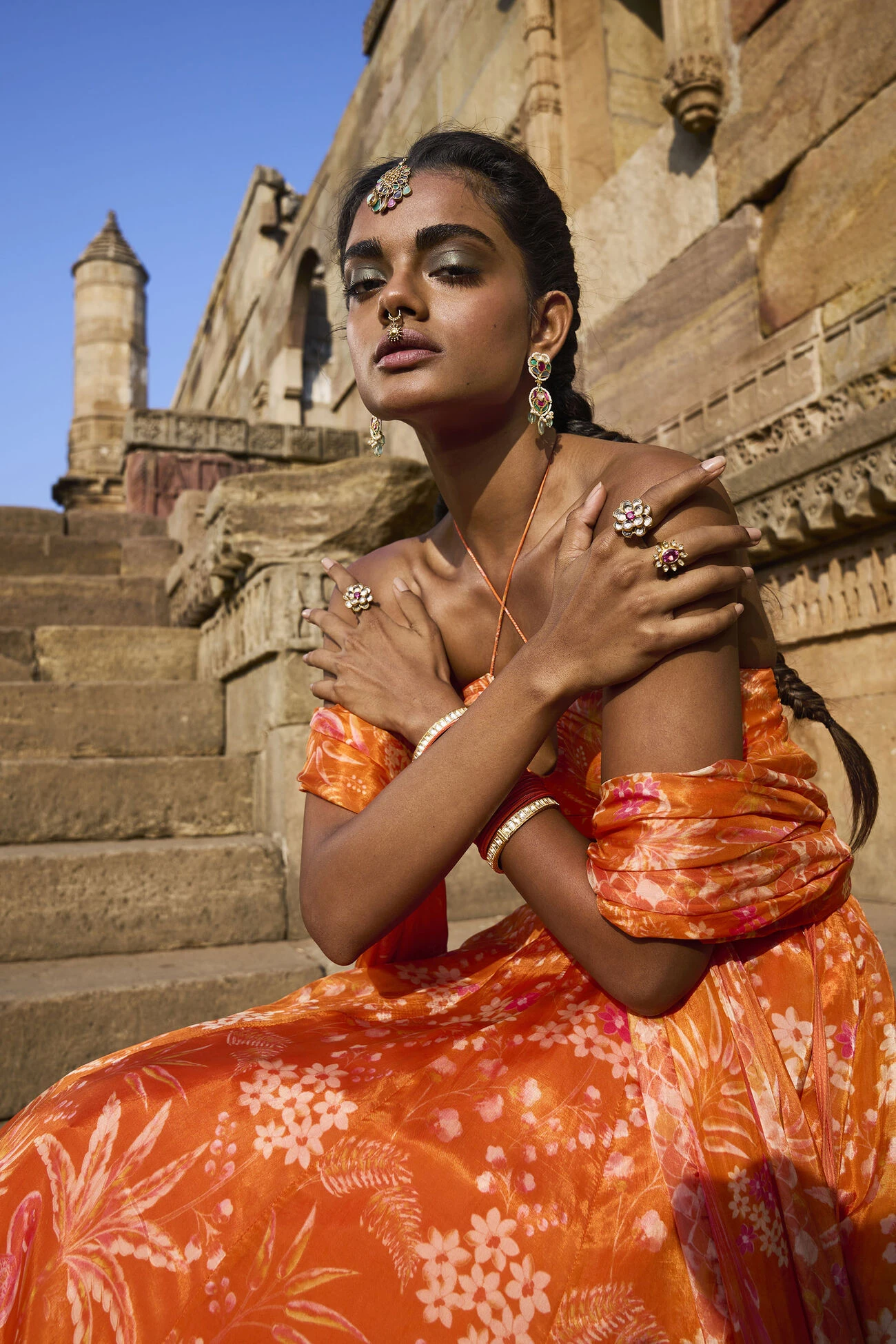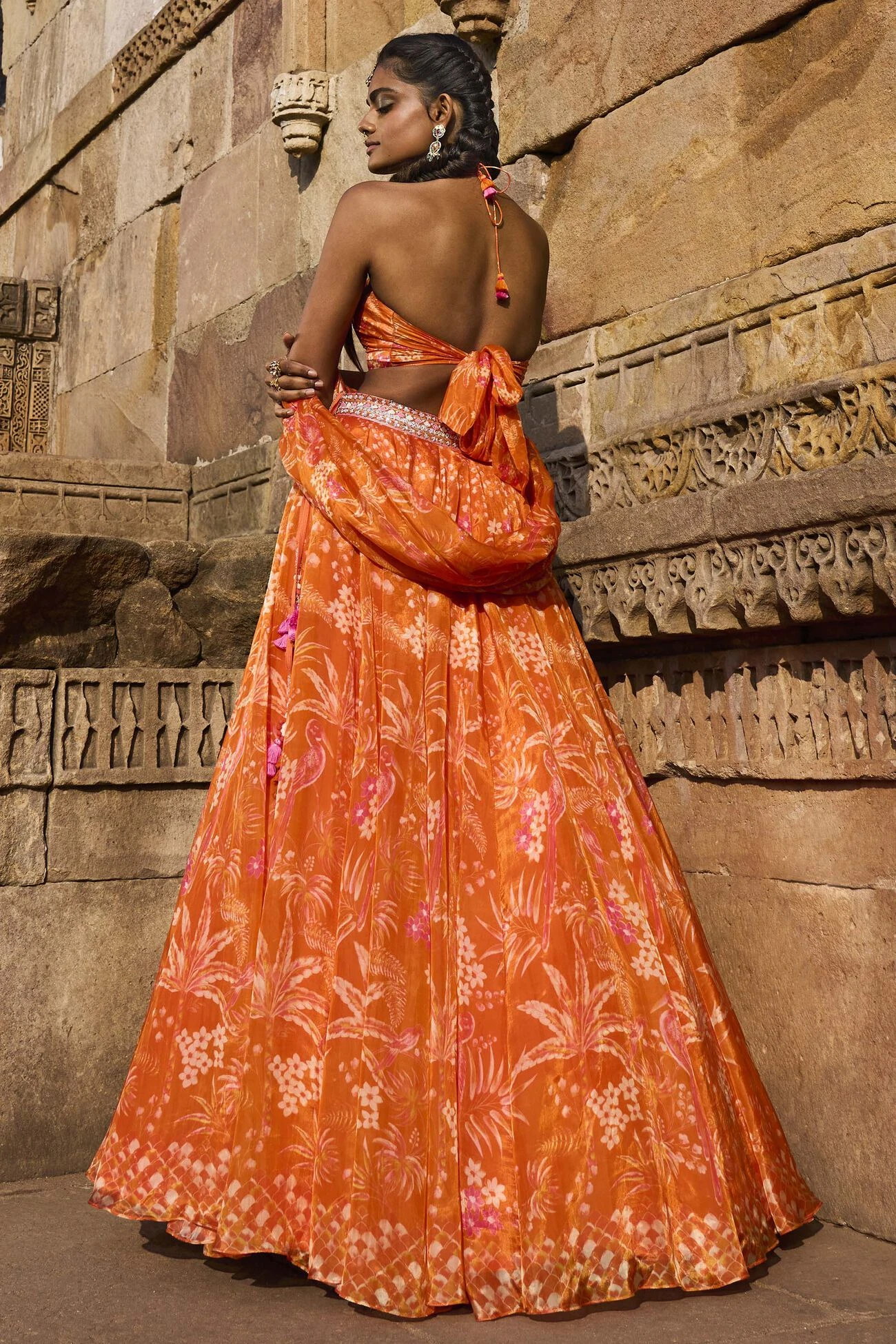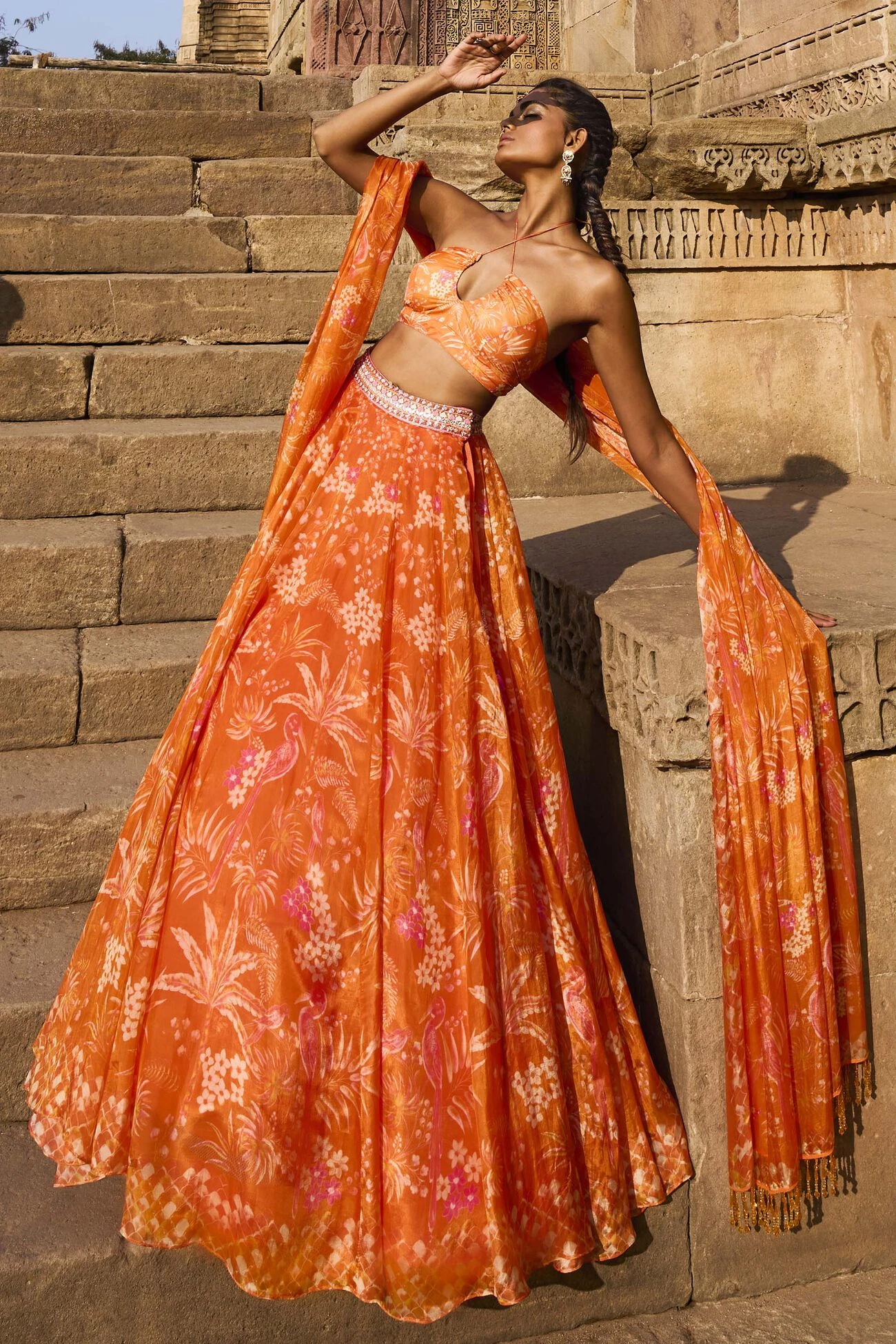This striking orange lehenga set, paired with a cap-sleeved choli, is imbued with the spirit of the tropics. The eclectic mix of prints show magpies weaving in and out of floras, framed against subtle shimmering embroidery. The voluminous fabric is light and is made up of sustainable fibres that are eco-conscious and love nature. The look is framed with pockets.