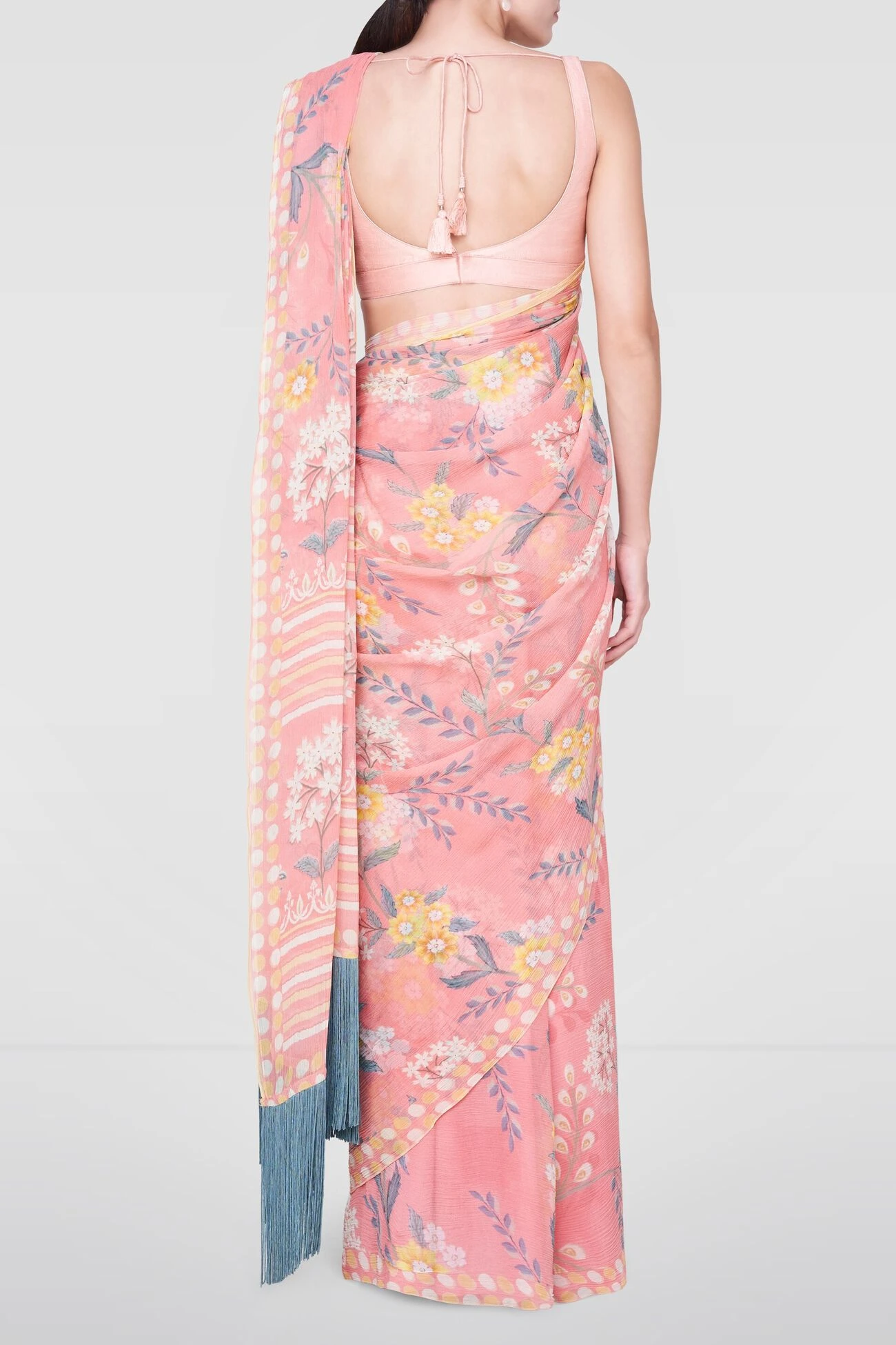 Our Meera Saree is the ideal choice for a magical summer soiree. A symphony of blush hues and motifs borrowed from lush gardens in breezy chiffon, this saree is paired with an unsticthed sequined choli fabric. The choli pictured here is for styling purposes only.