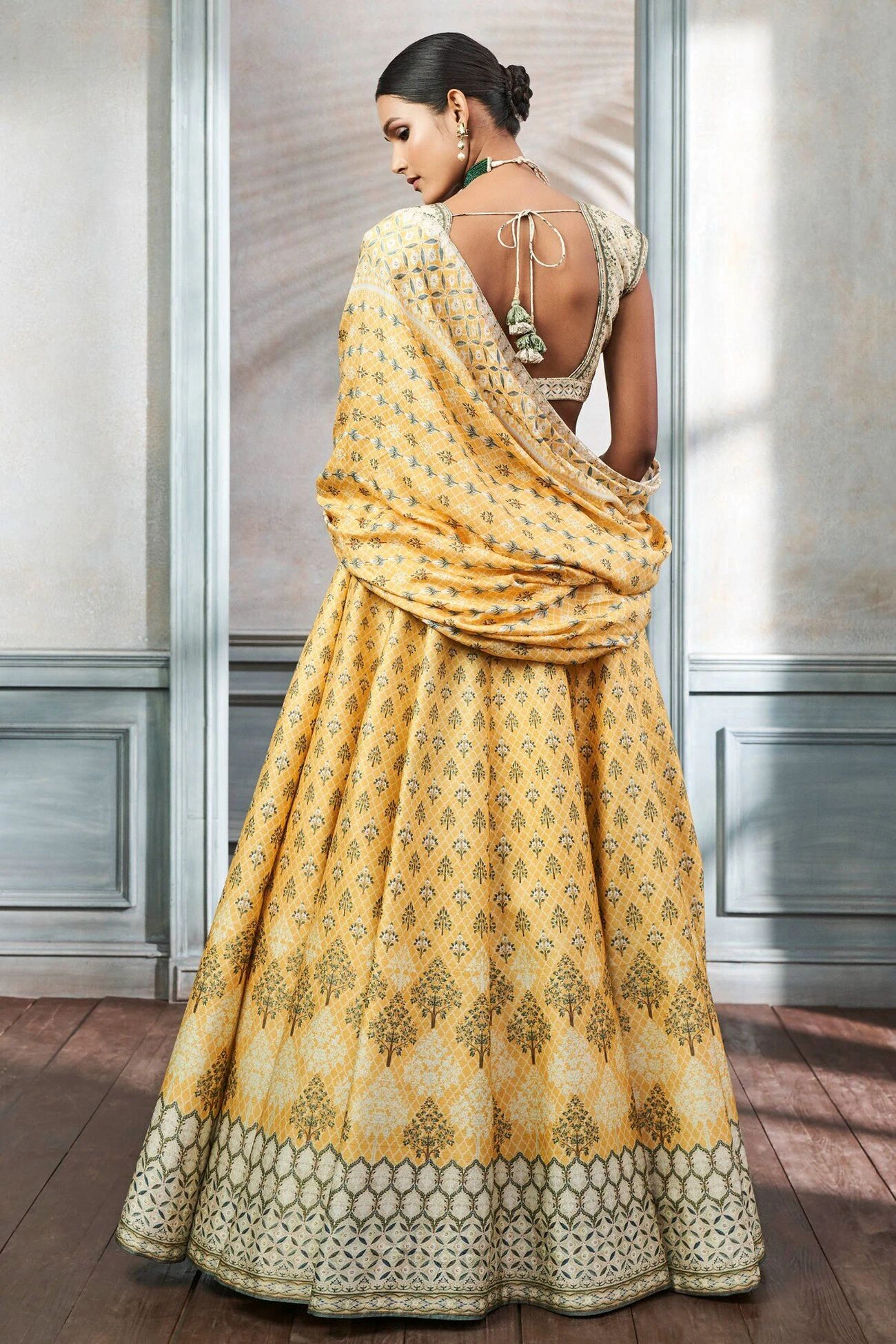 This printed mustard lehenga in silk is dressed in motifs inspired by the flowers of Ranthambore. This luxurious lehenga comes with pockets and pairs well with a bright day.