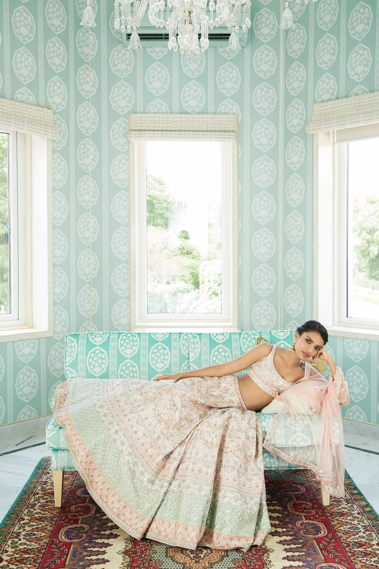 An intricately embroidered silk lehenga in a soothing flamingo blush tone. It is adorned with gota patti, dori, resham, sequins, pearls, cut dana, thread work and zardosi work. It is paired with an embroidered silk blouse featuring a scooped neckline, along with an embroidered net dupatta. This style offers customisation for fabric color and lehenga length. Choli length and Sleeves can be added which will be additonally charged.