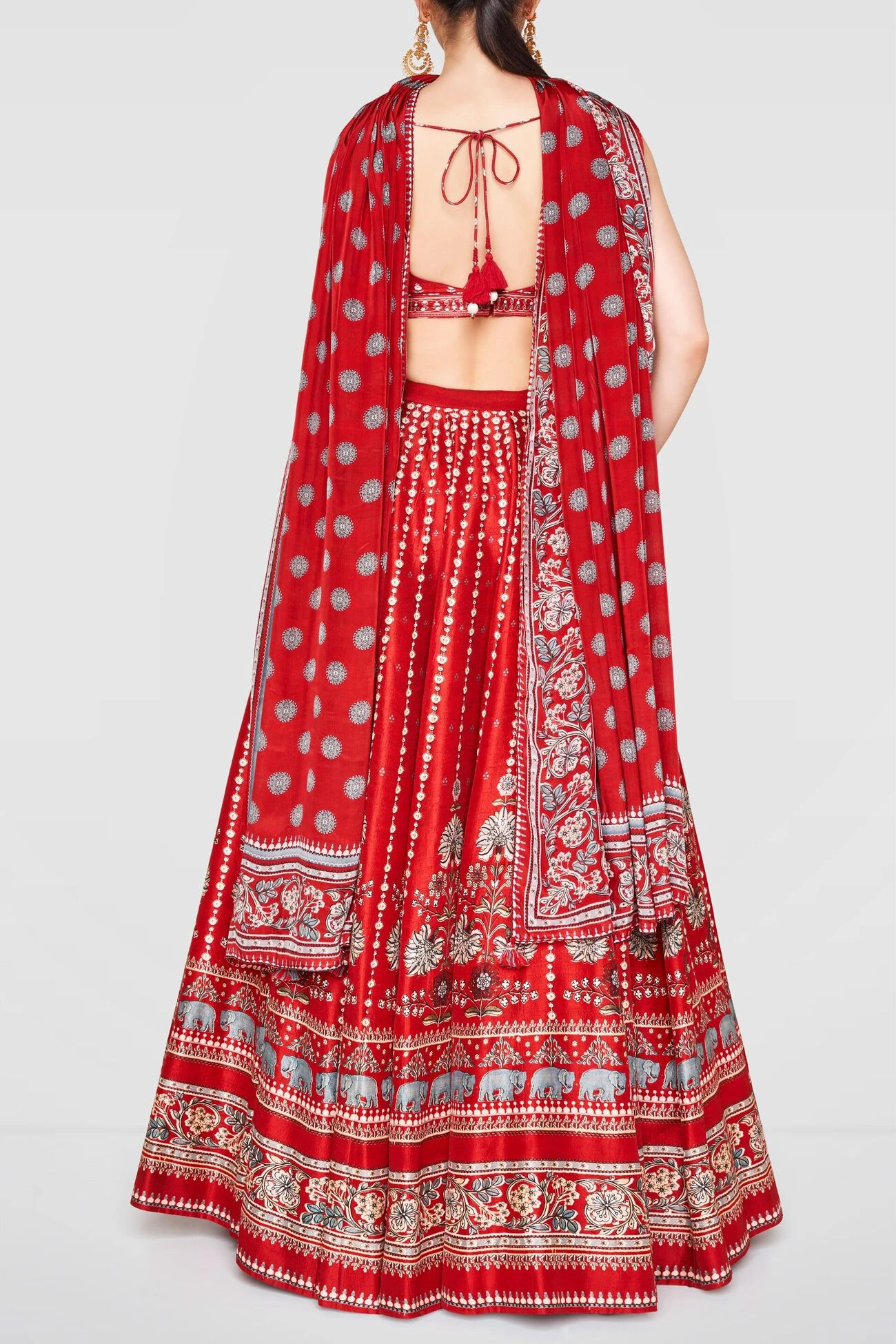 The vivid red Neysa Lehenga is graced with playful floral and elephant motifs printed on it. Paired with a matching dupatta and choli with zari and sequins work, the lehenga is perfect for a dreamy day wedding.