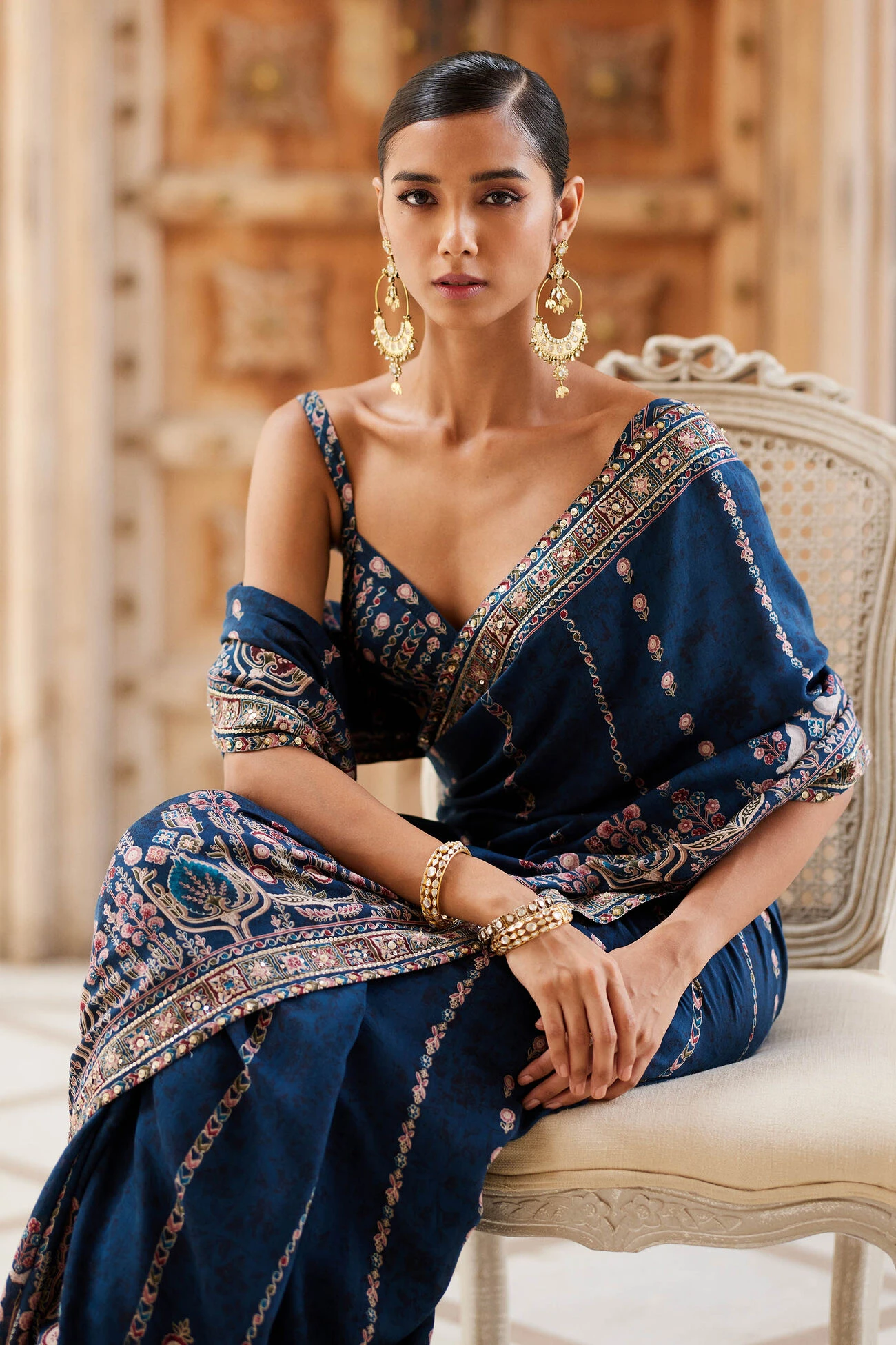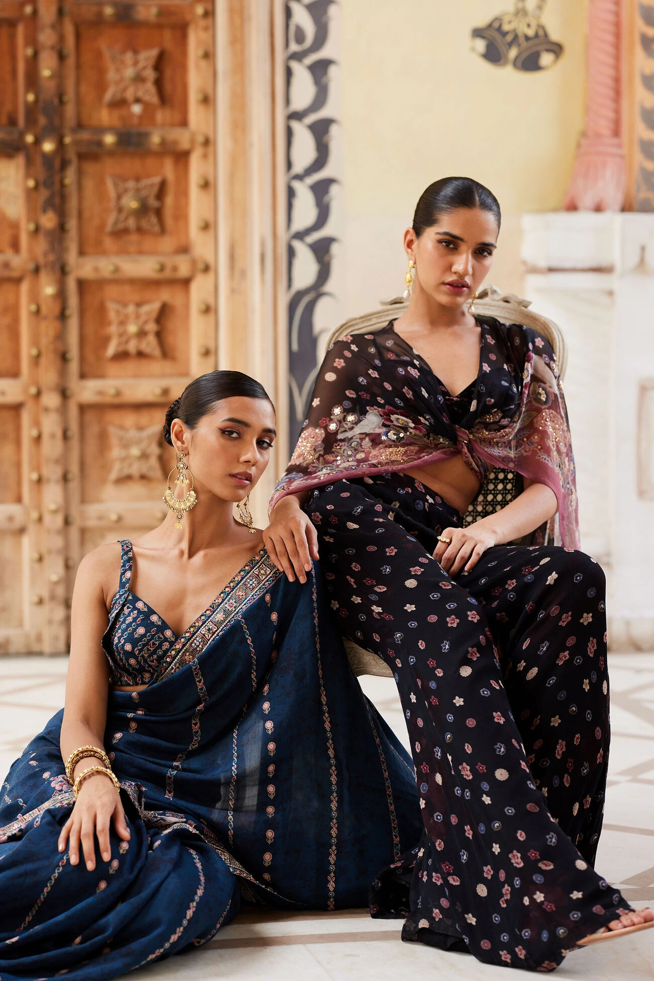 Saree comes with a 0.90 meter length of fabric for the choli. The choli shown on model is for style only. Additional charges apply for choli stitching. Please contact at [email protected].