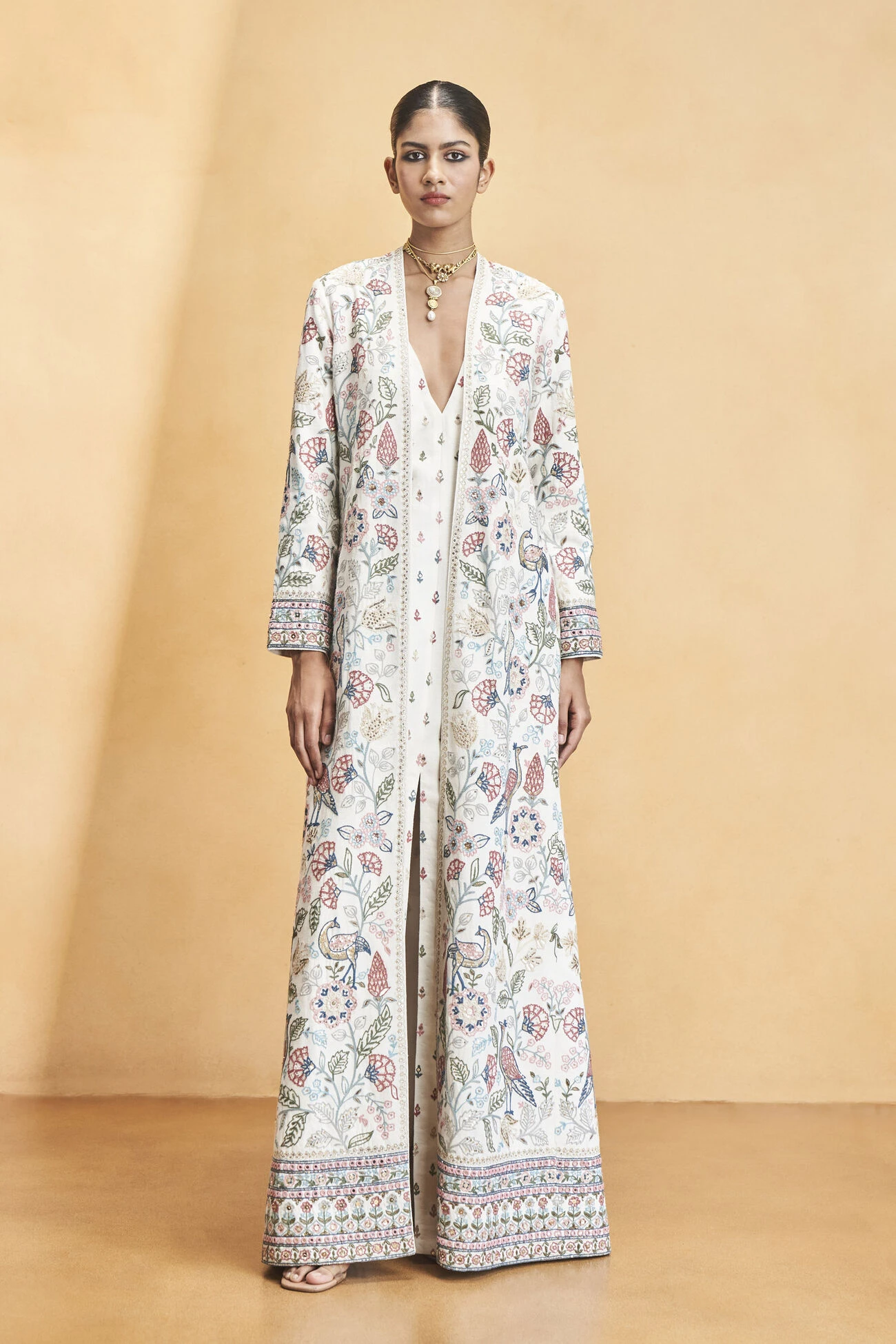 Resplendent flora and abundant fauna of the forest are skillfully hand-embroidered by the women artisans of SEWA on this statement silhouette. A glamorous slit makes it the perfect ensemble for contemporary celebrations.