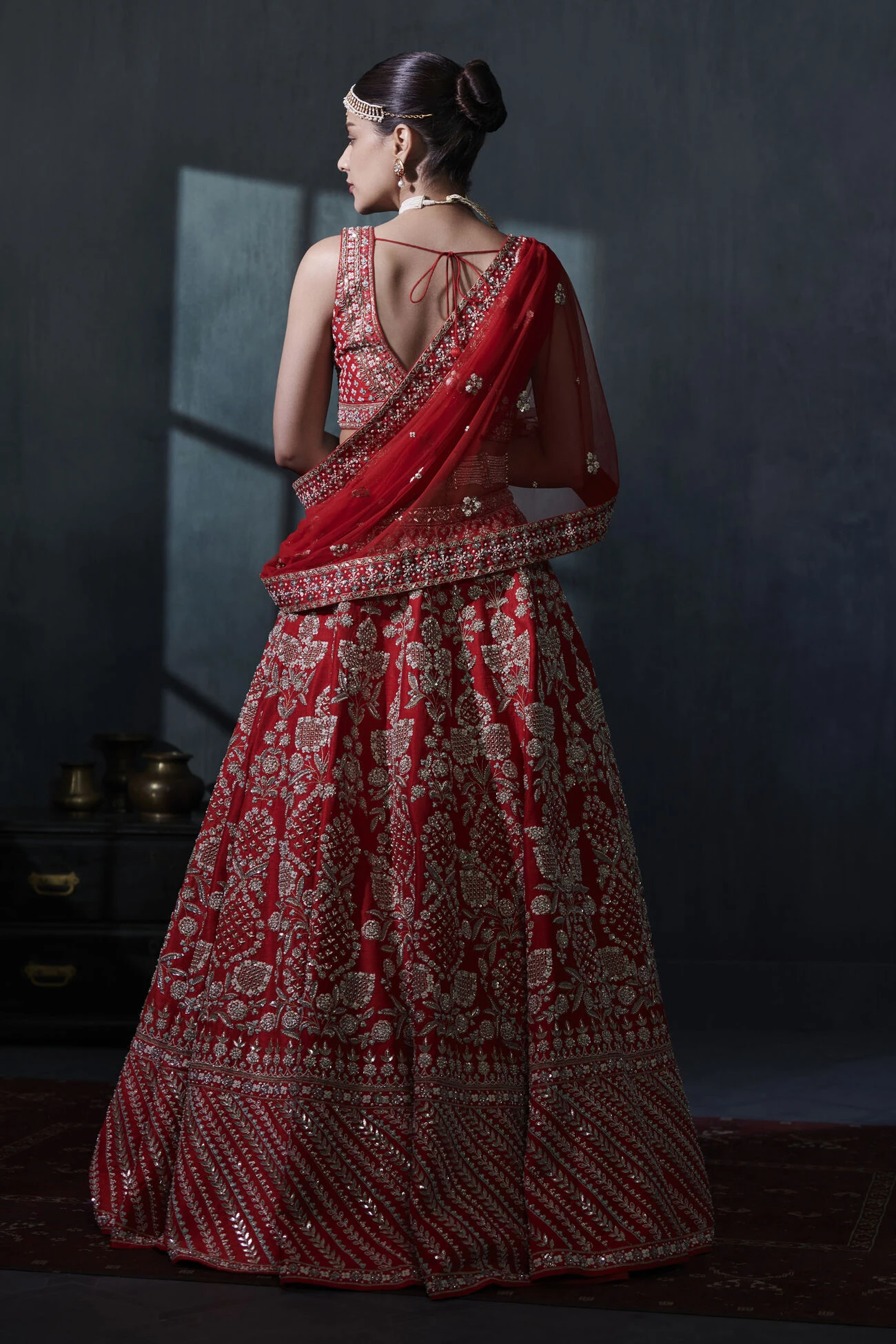 A luminous red silk lehenga adorned with botanical imageries inspired by adornments of Indian royalty. The striking work combines meticulous embroidery and along with a sprinkling of pearls and sequins. Pockets come included.