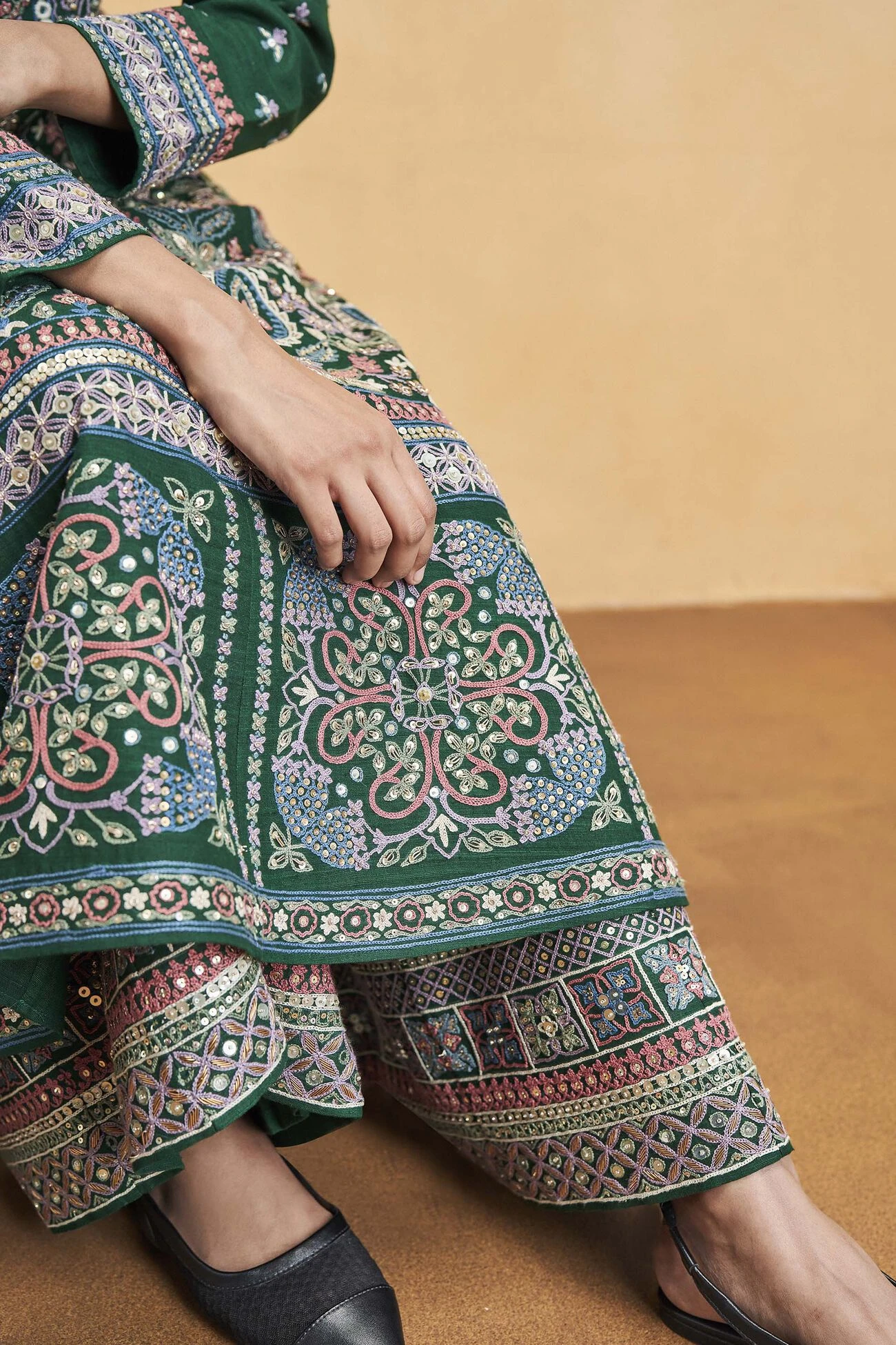 Inspired by the resplendent green hue of evergreen forests, this kurta set has been hand-embroidered by women artisans of SEWA. It features the diverse and exquisite flora and fauna of the forest for a timeless look.