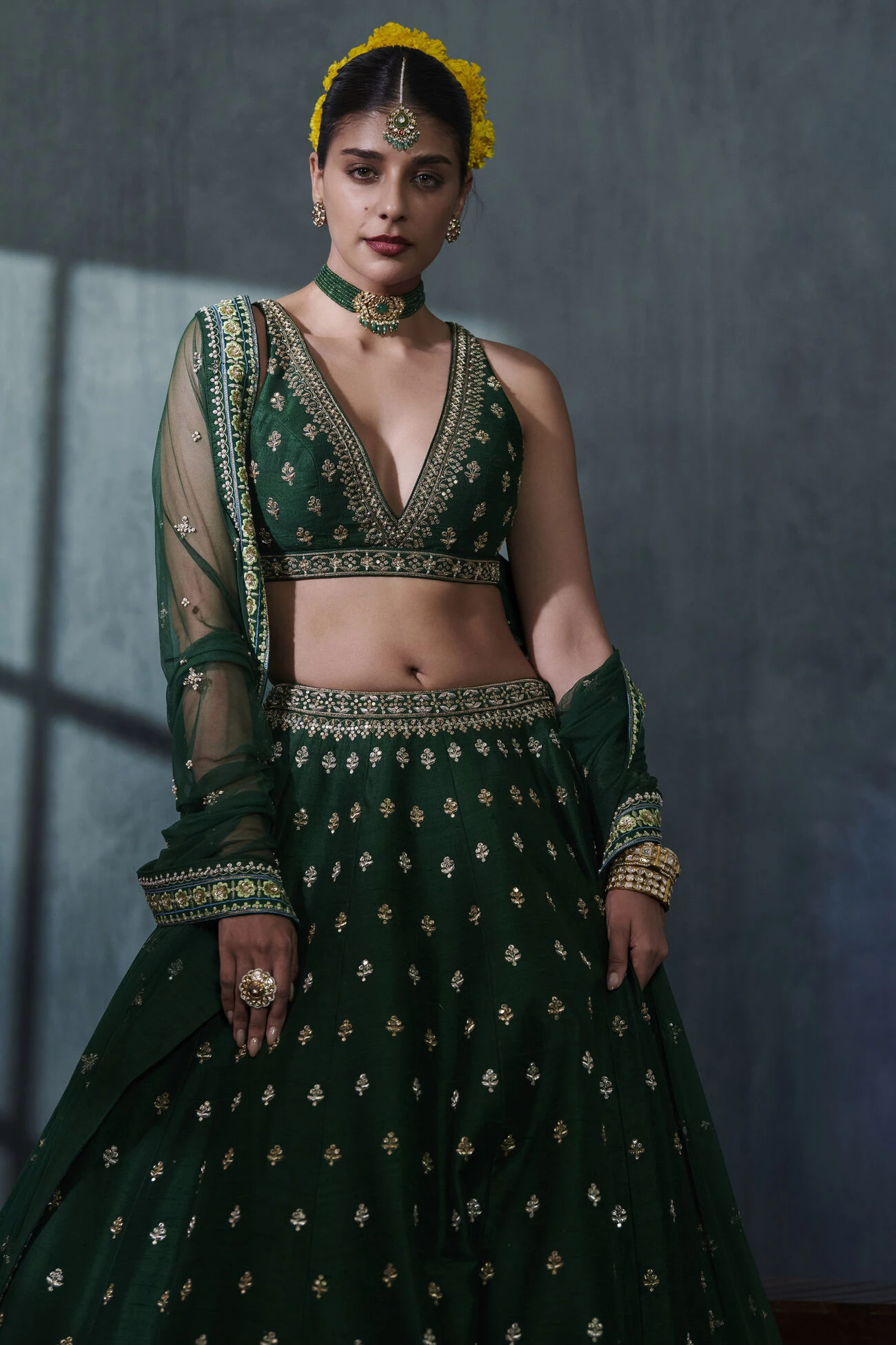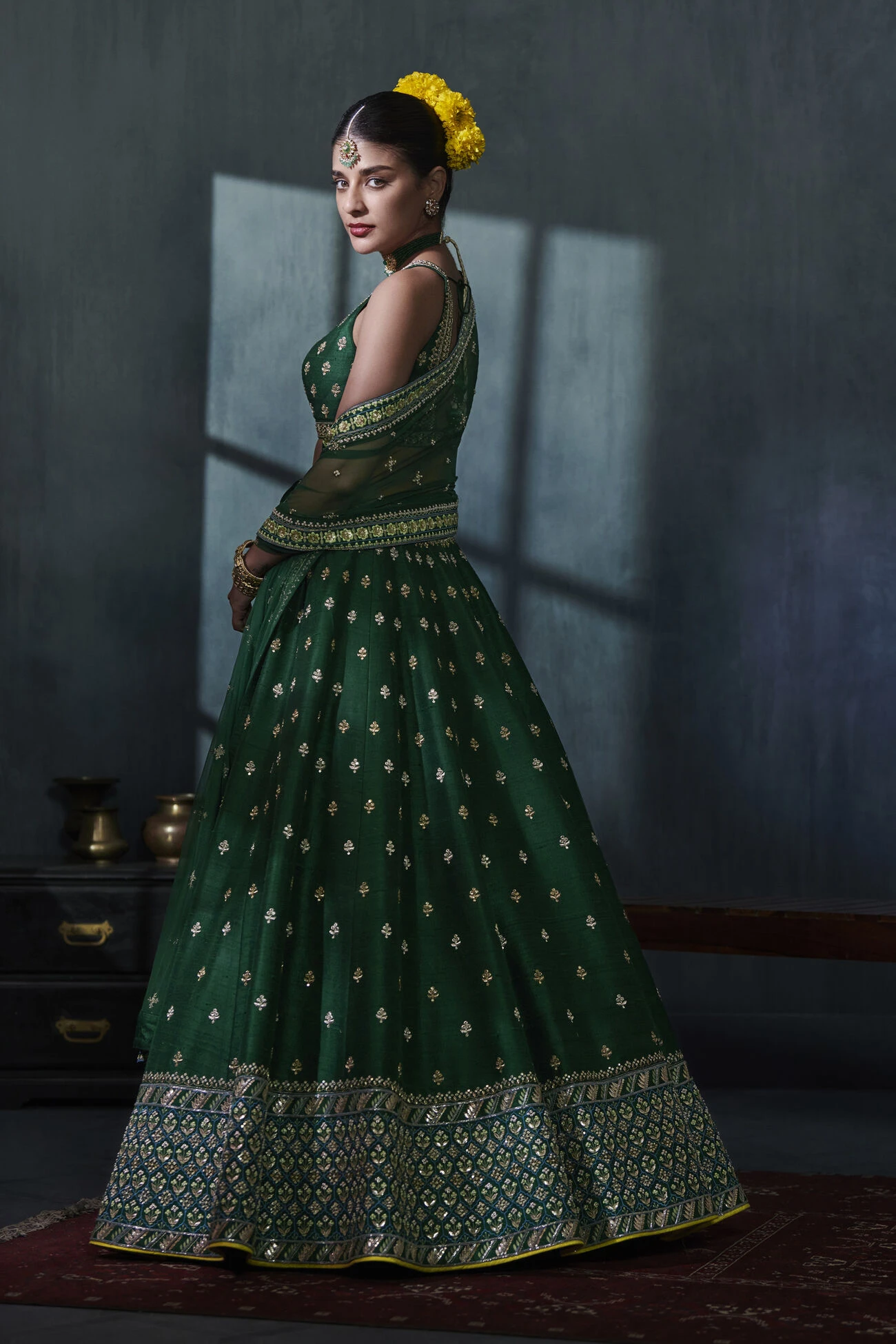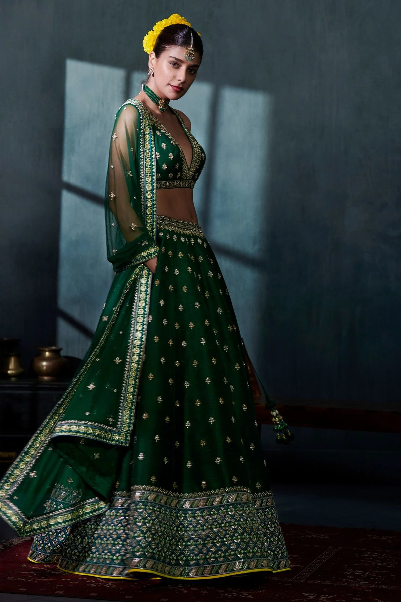 The luxurious emerald green hue adds to the elegance of this silk lehenga peppered with shimmering botanical motifs, completed with a heavily embellished border. The ensemble features our signature gota patti hand embroidery along with pearls, sequins and zari work. Pockets come included.