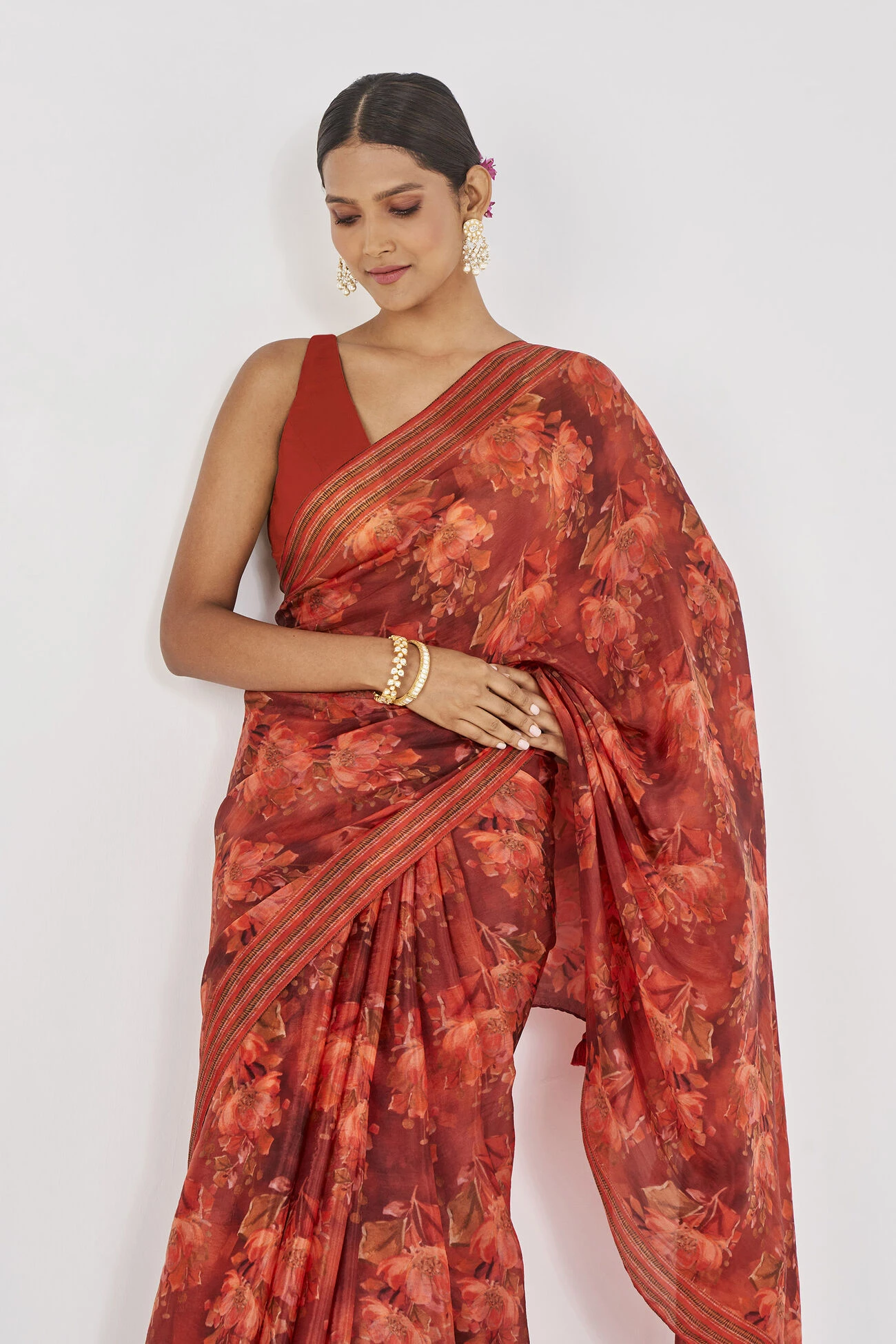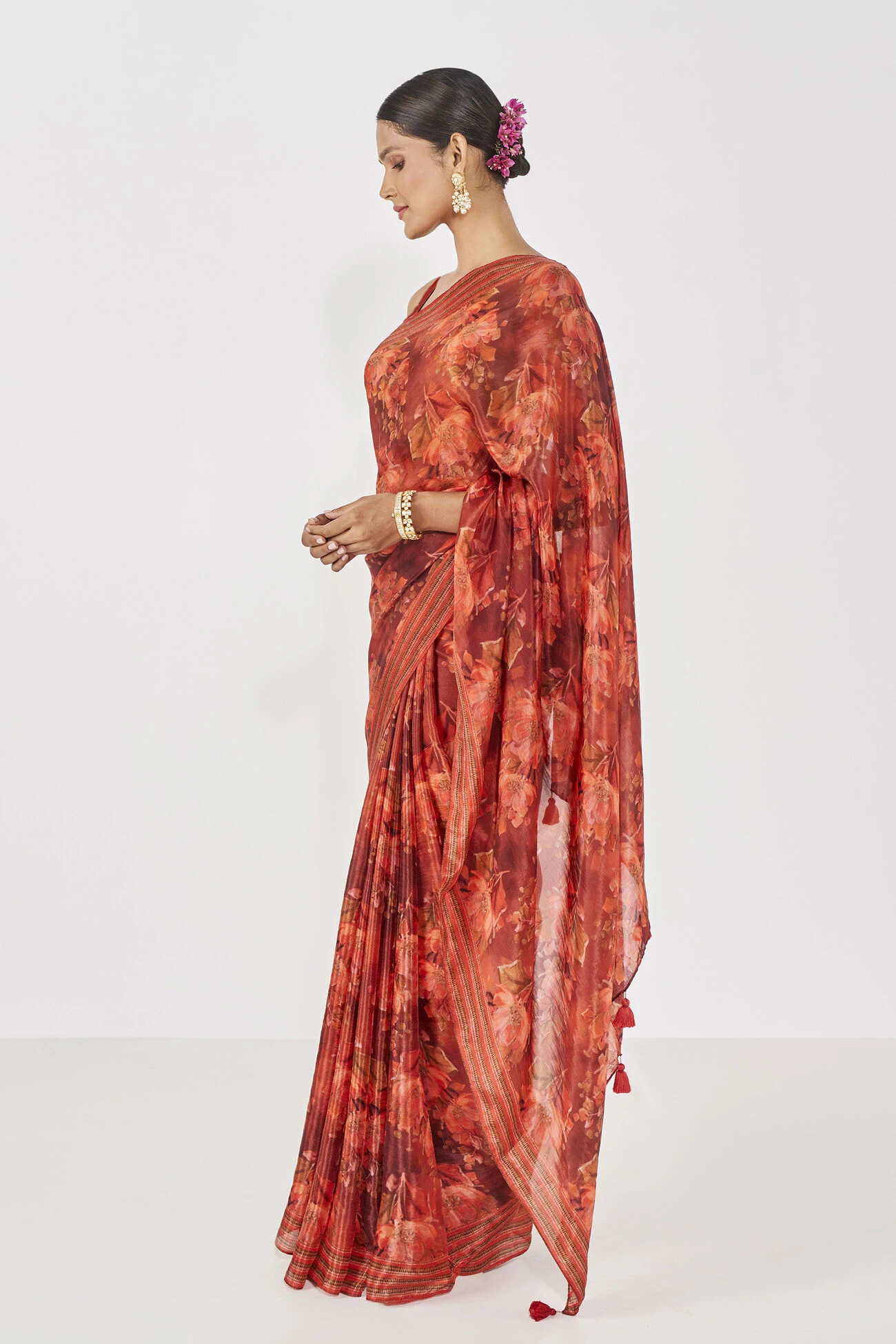 Our Tanaz saree, crafted with sustainable fibers, comes in a cheerful orange. This is a light, all-season saree with floral digital prints that make it a classic.