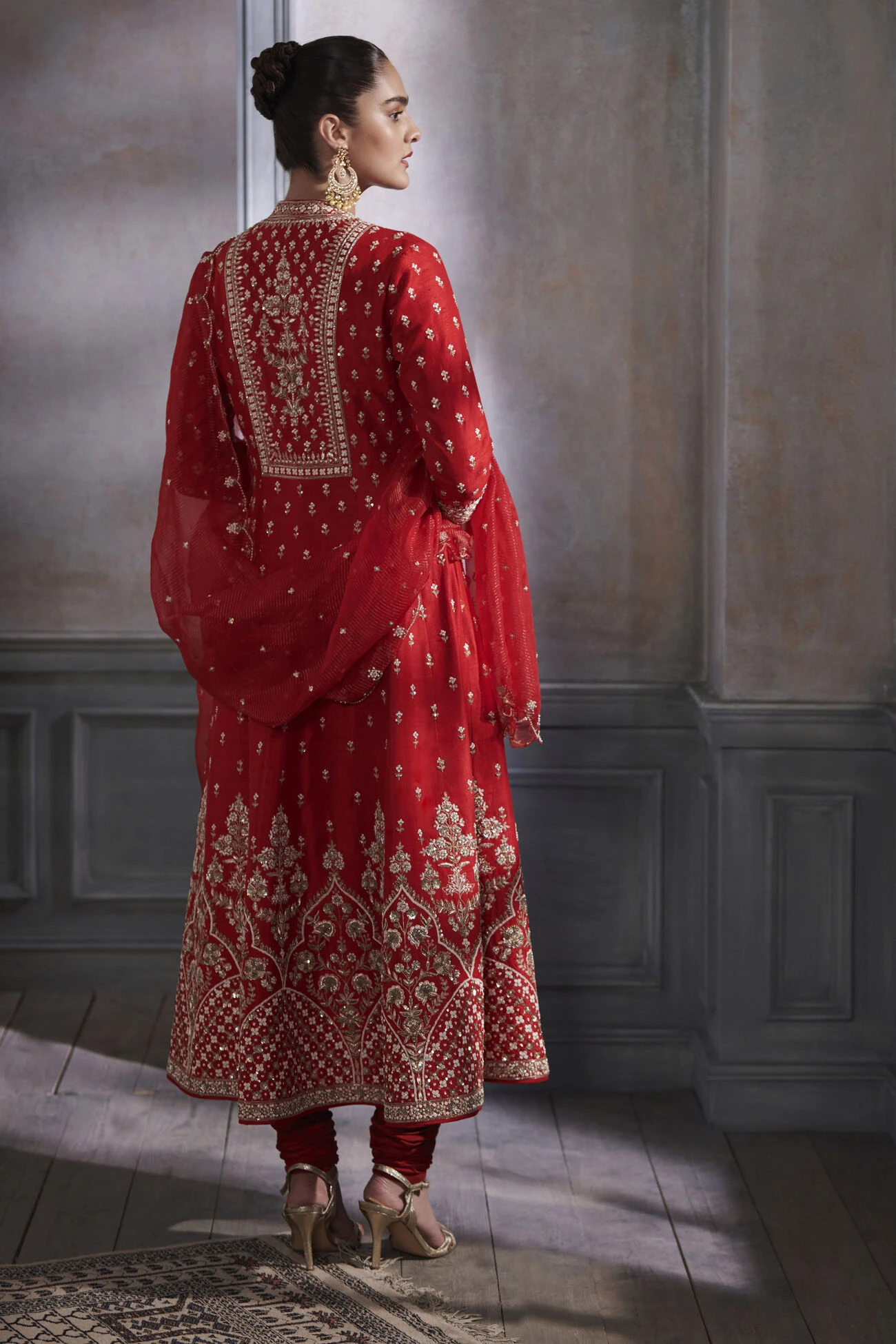 A festive and radiant red anarkali set in silk. Its luxurious form is highlighted with naqshi and floral motifs and features our signature gota patti embroidery. Pockets come included.