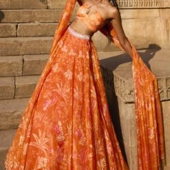 Saree comes with a 0.80 meter length of fabric for the choli & 2.5 mts of Petticoat fabric. The choli shown on model is for style only. Additional charges apply for choli stitching. Please contact at [email protected]