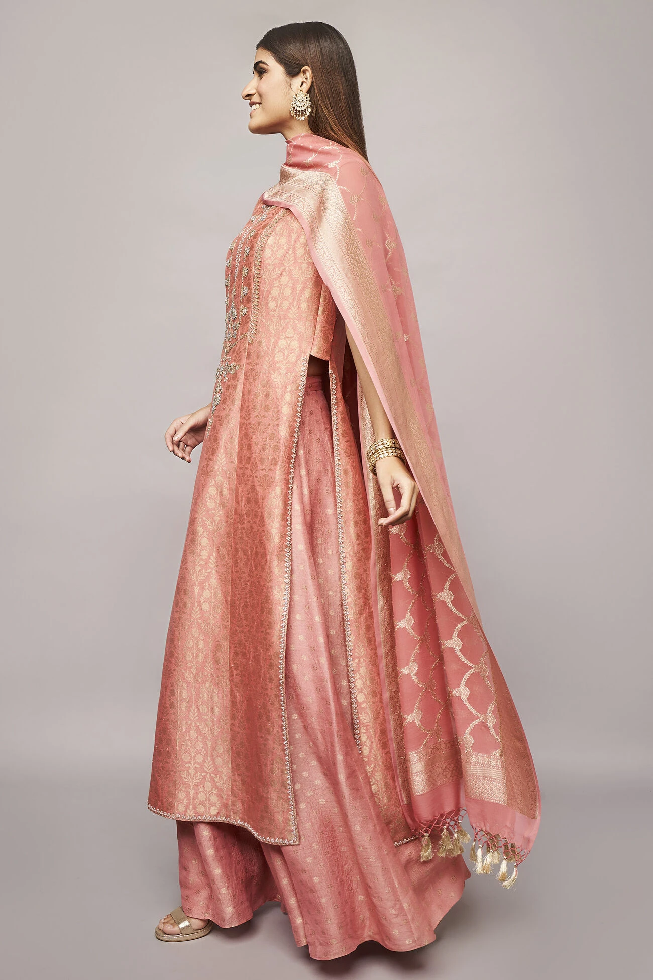 This sleeveless blush coloured silken Benarasi set composed of our signature gota patti hand embroidery, brocades exquisitely detailed embellishments is all the sparkle you?ll need for your upcoming celebrations. ?Pockets are included.