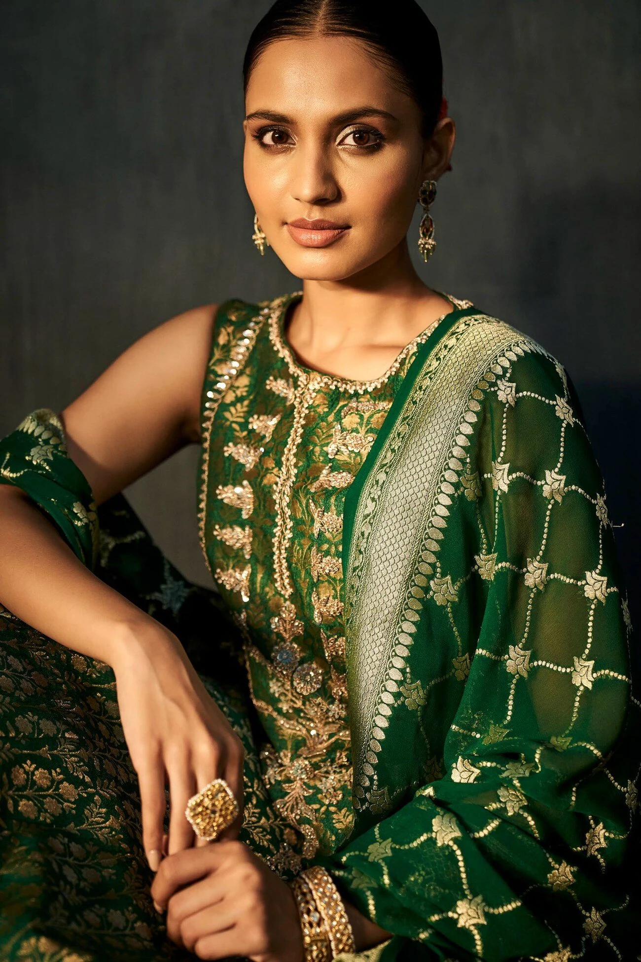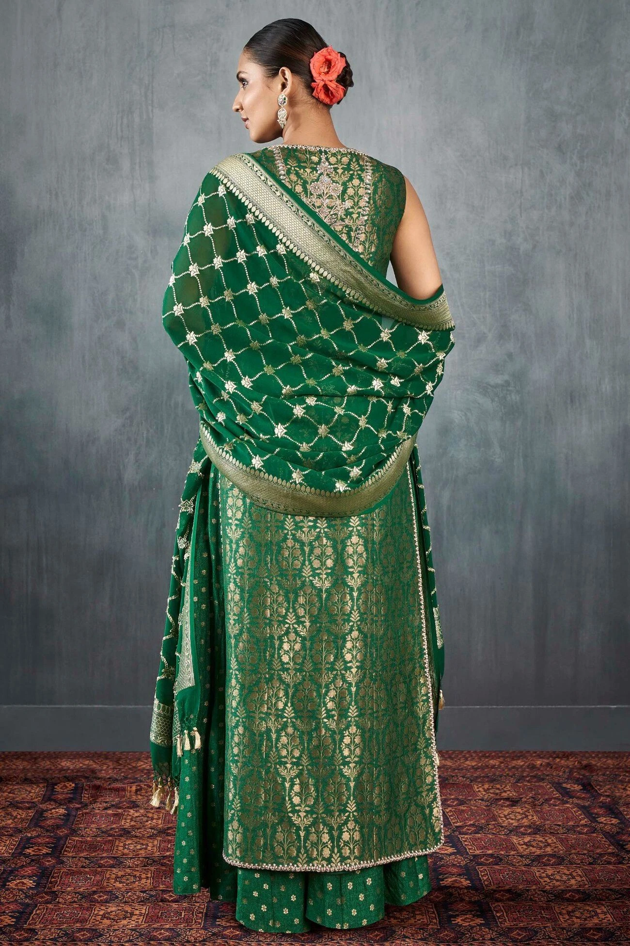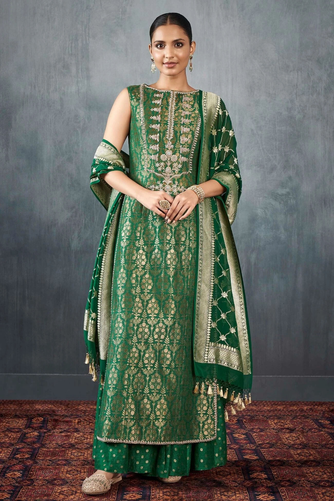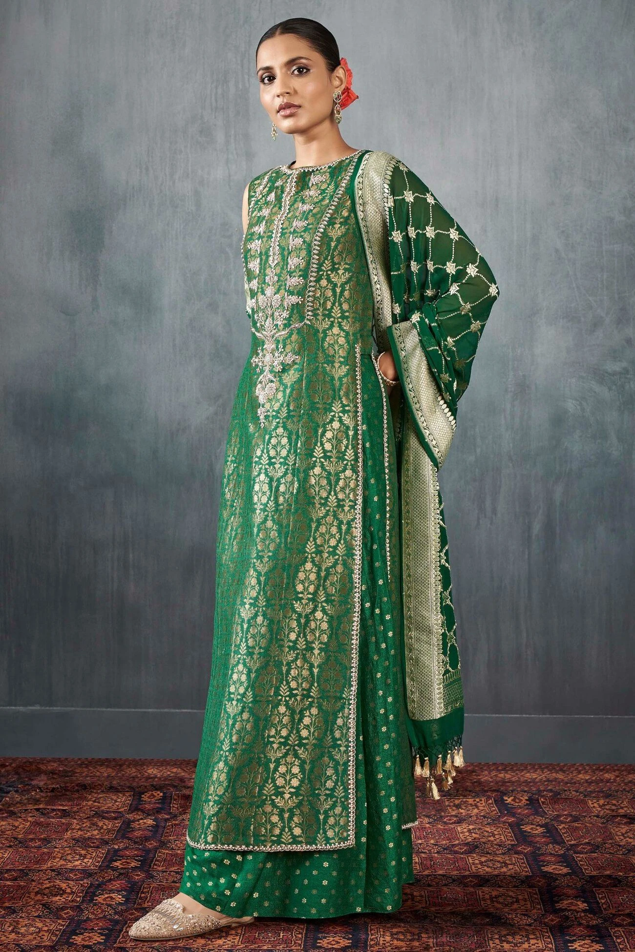 This sleeveless emerald green silken Benarasi set composed of our signature gota patti hand embroidery, brocades exquisitely detailed embellishments is all the sparkle you’ll need for your upcoming celebrations. ​Pockets are included.