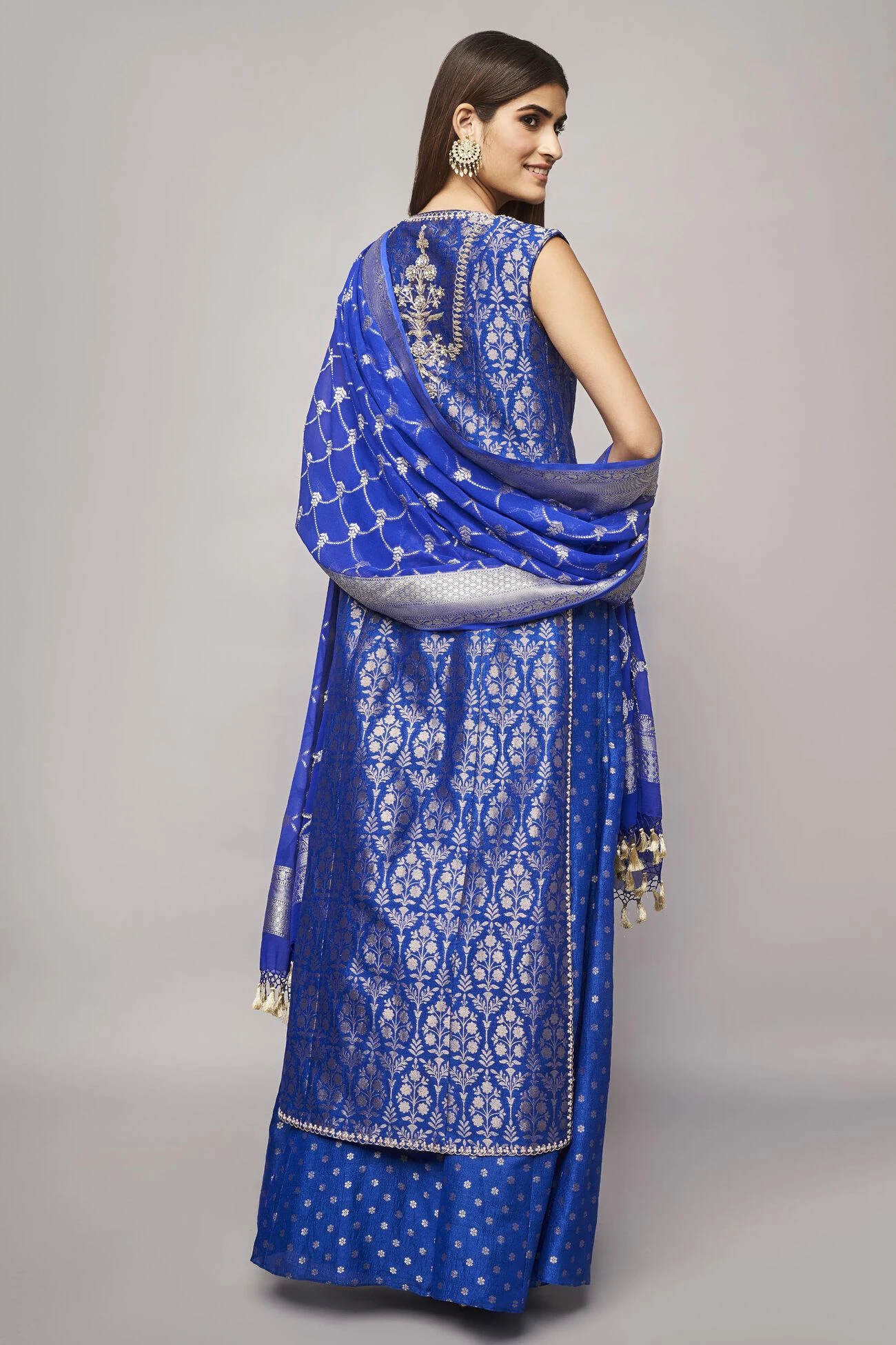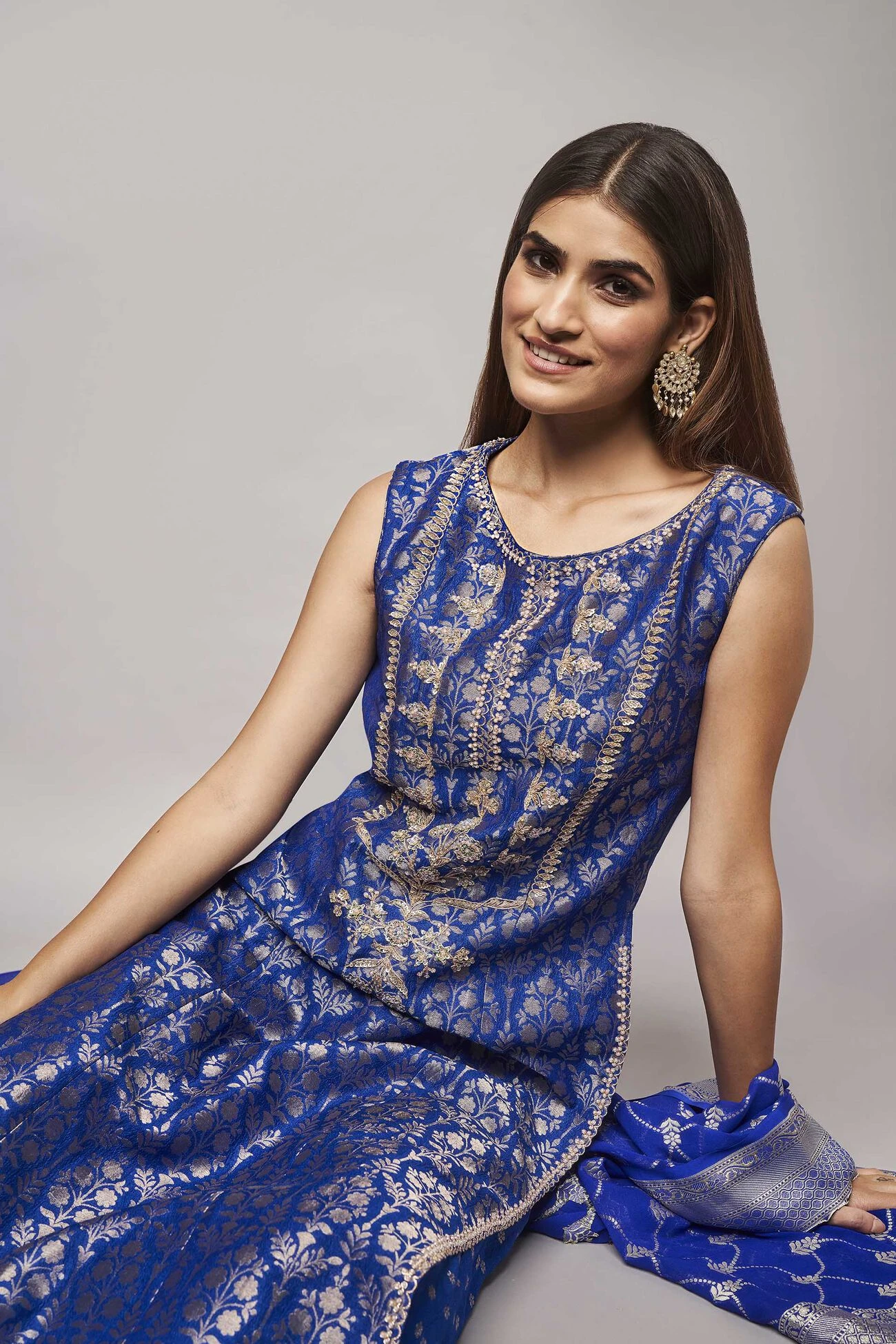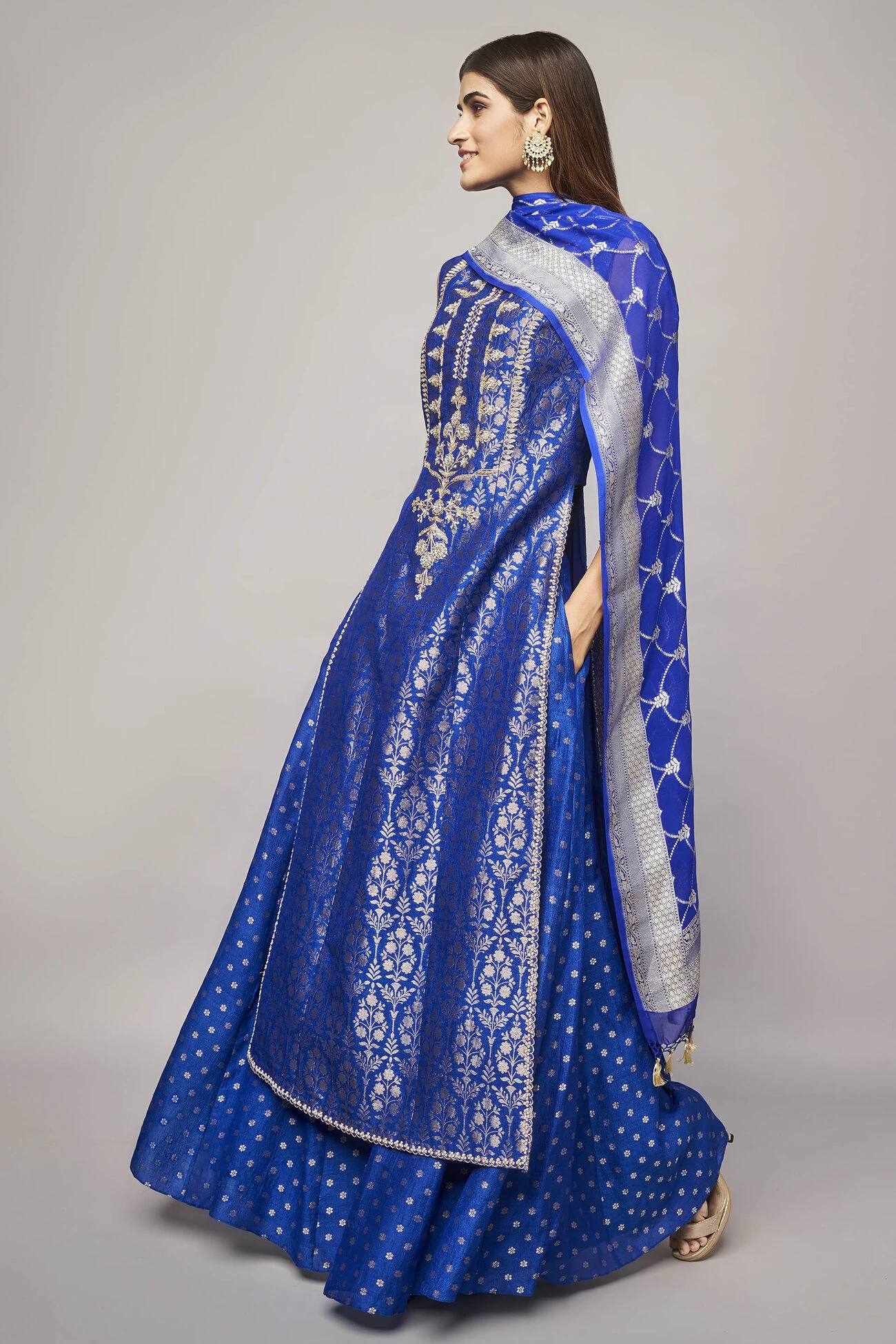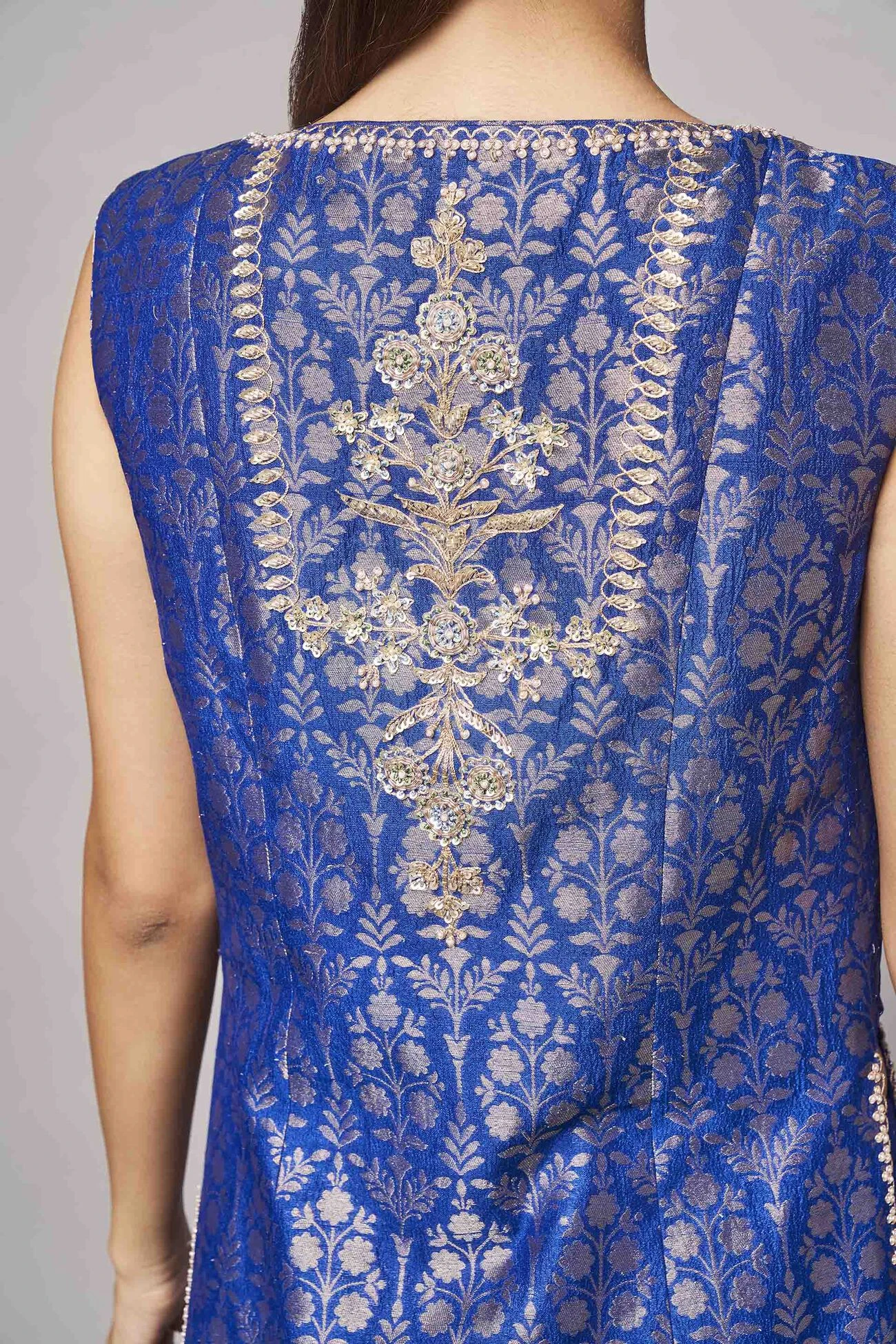 This sleeveless silken Benarasi set in depths of blue is composed of our signature gota patti hand embroidery, brocades exquisitely detailed embellishments is all the sparkle you?ll need for your upcoming celebrations. ?Pockets are included.