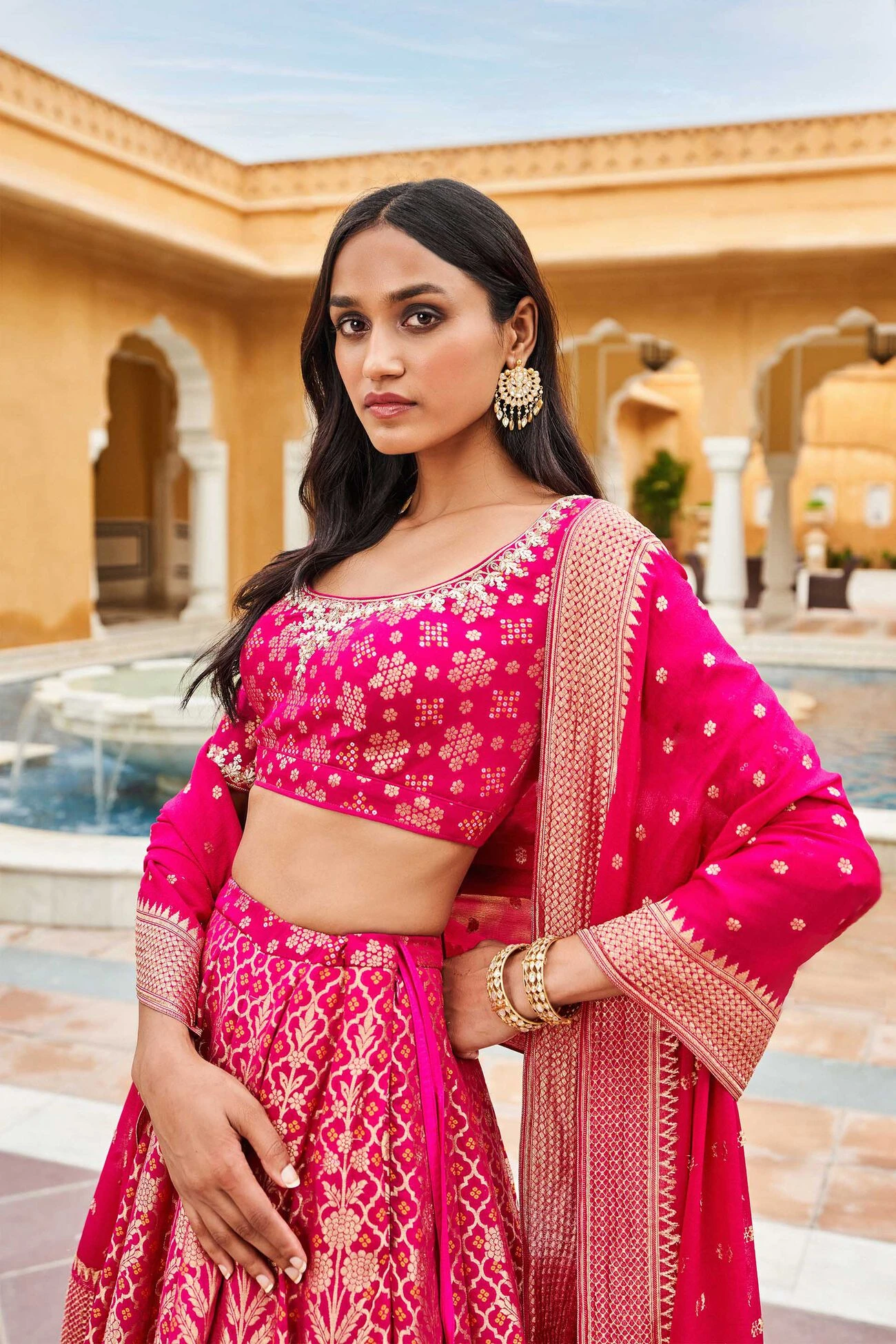 Our Valimai Lehenga Set, handcrafted in Banaras georgette by our master artisans. Light and upbeat, the gold metal accents evoke a classic evening vibe.