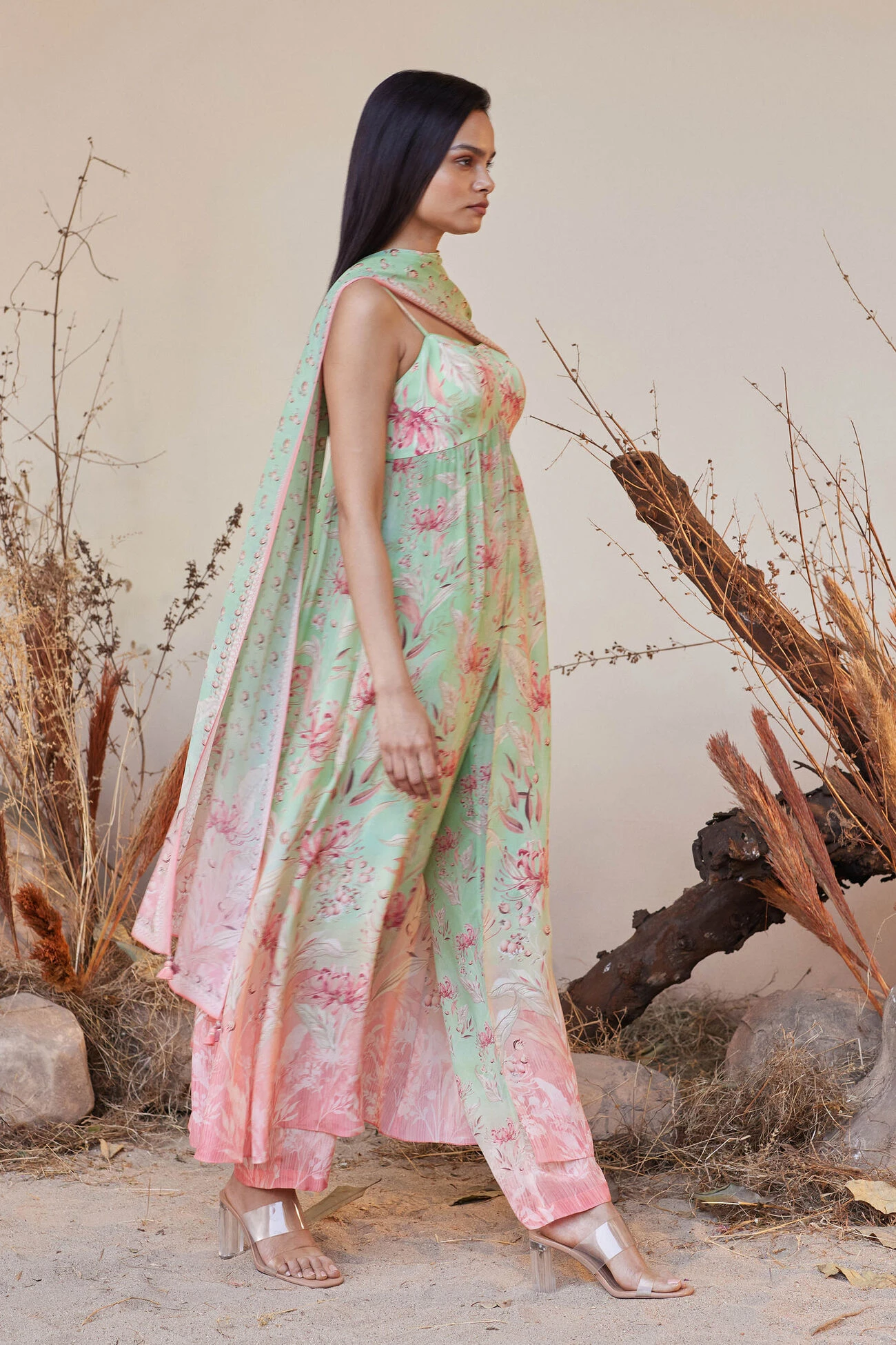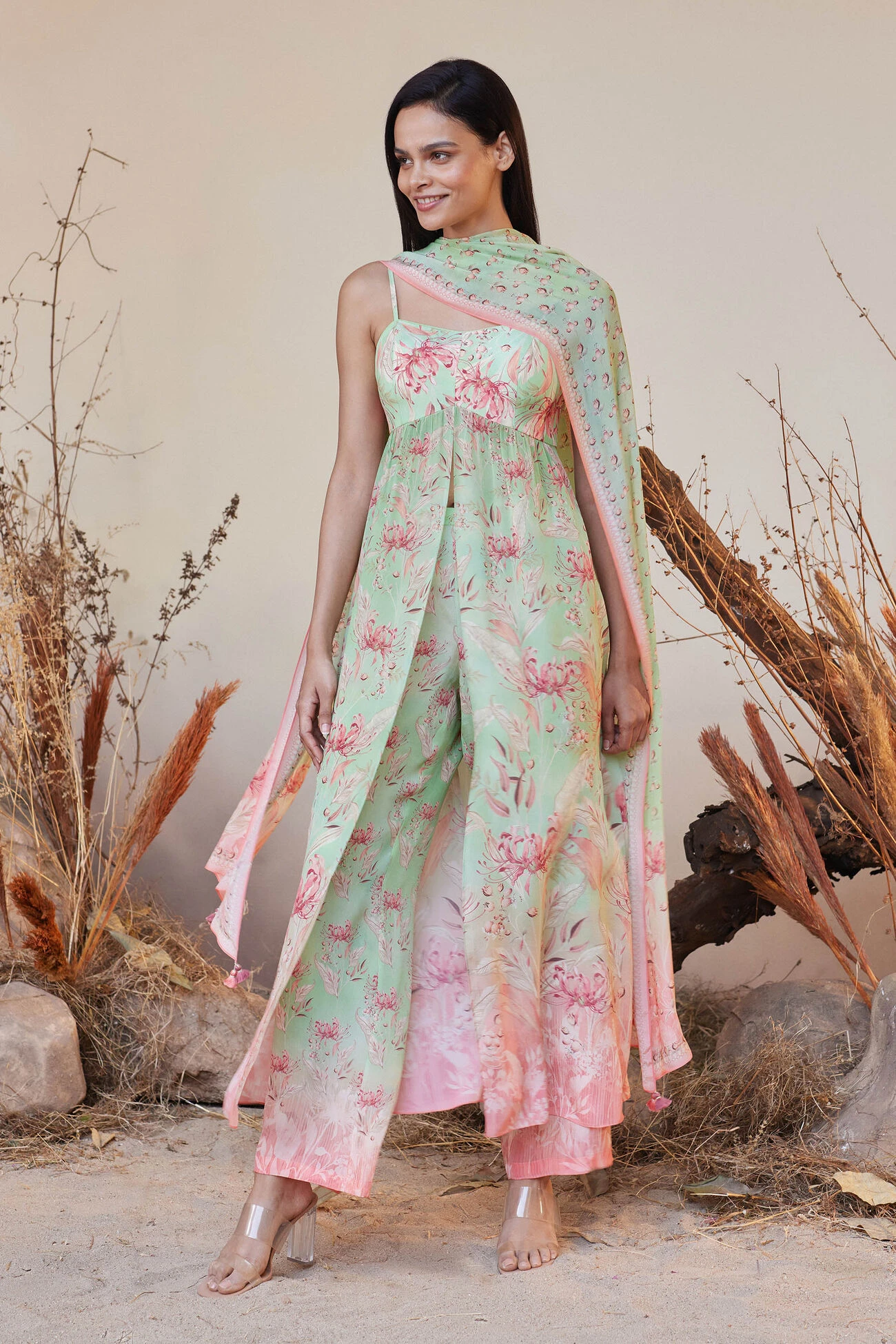 A breezy silhouette makes Zumena a summertime staple. Blooming floral prints and a refreshing color palette make it perfect for alfresco soirees.
